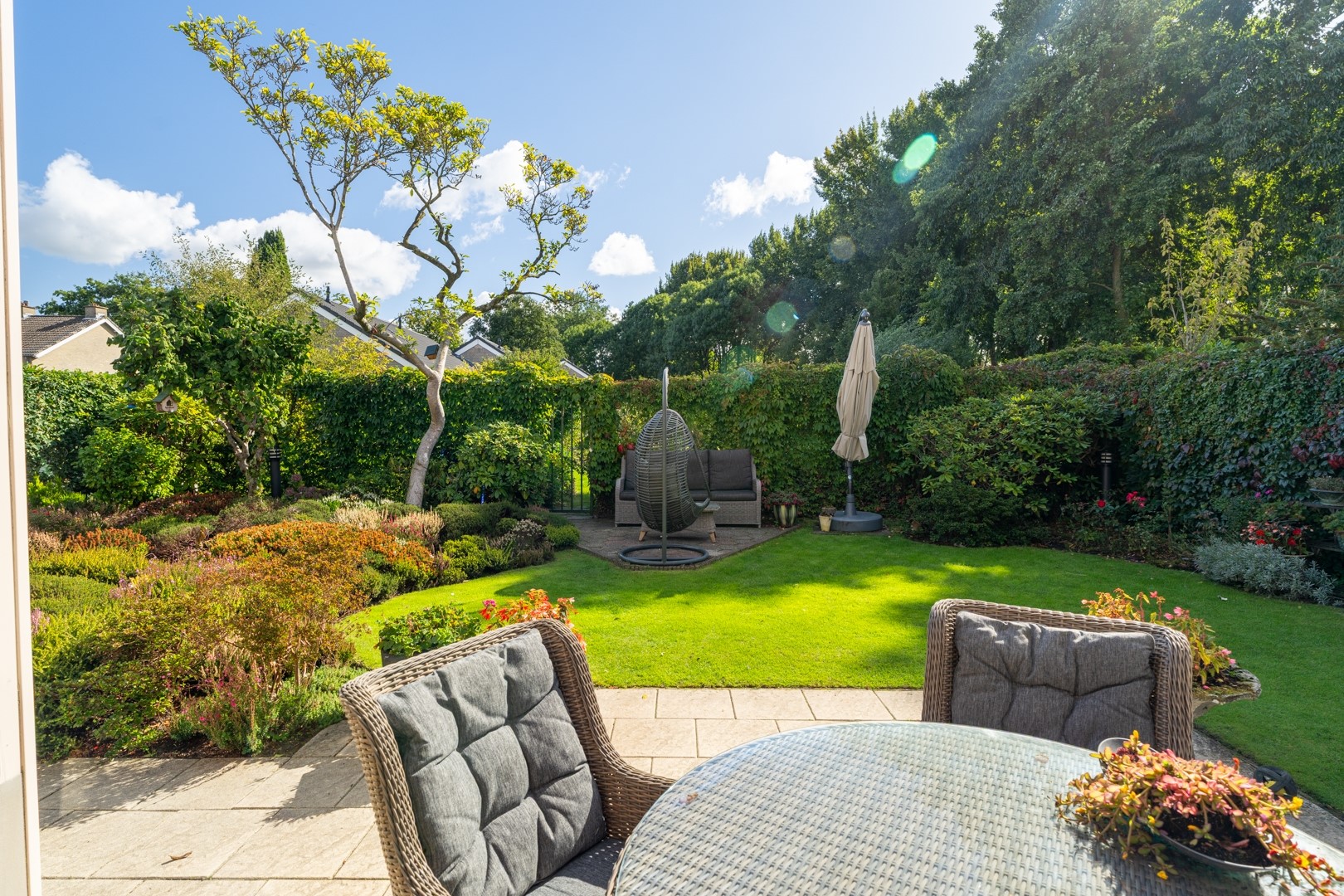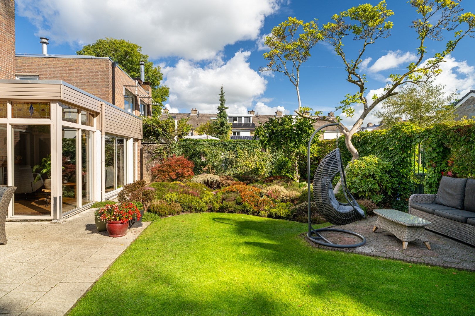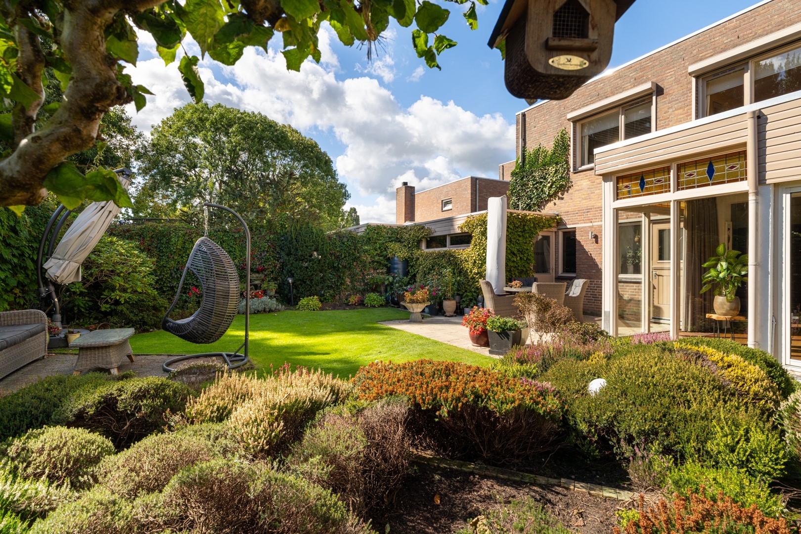 De achtertuin is een groene, beschutte plek waar je lekker kunt relaxen of tuinieren. Met gras, planten en struiken is het hier volop genieten. Via een achterpoort kom je op een gemeentelijk pad. Aan de voorkant vind je een nette siertuin en plek om je auto te parkeren.