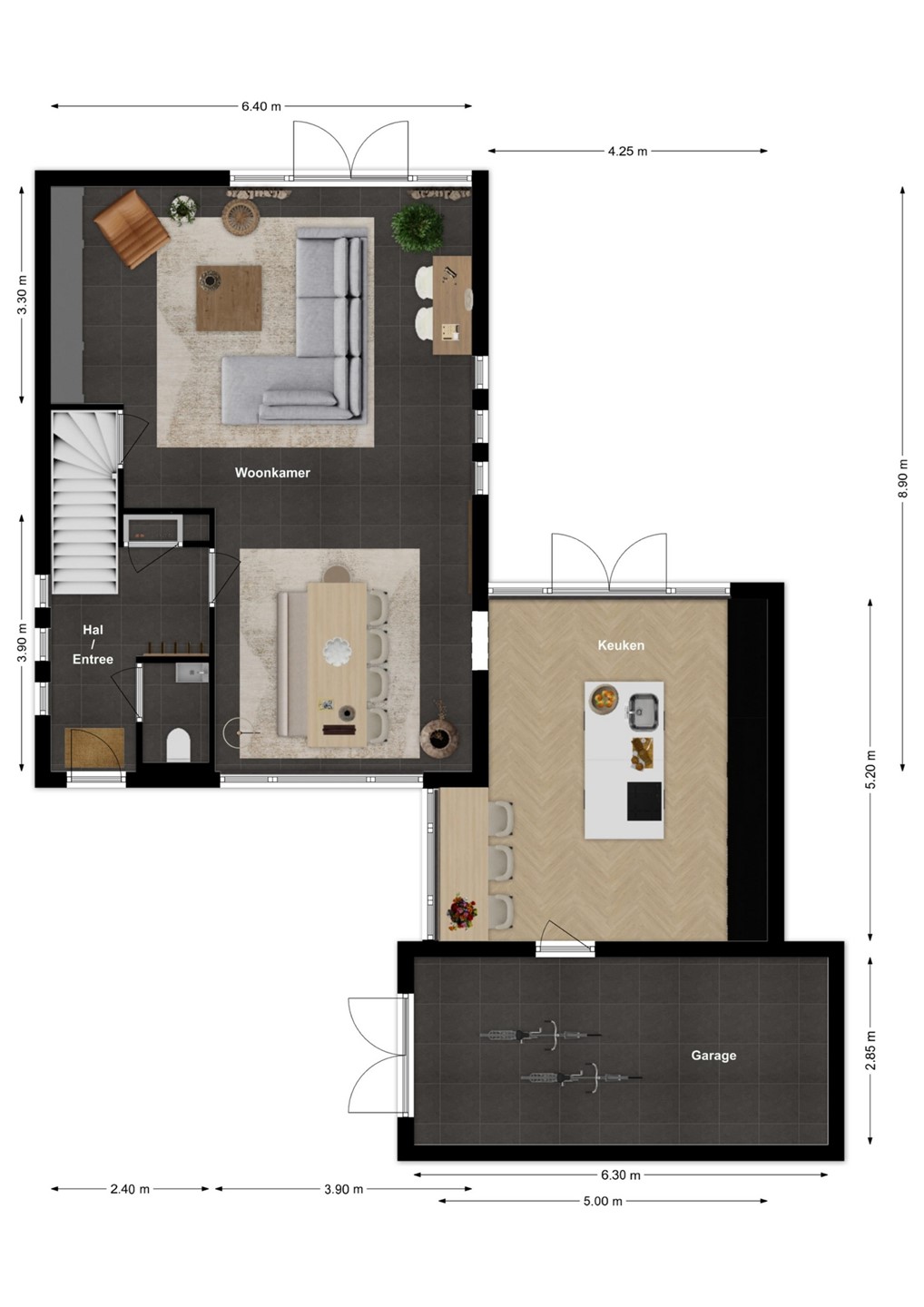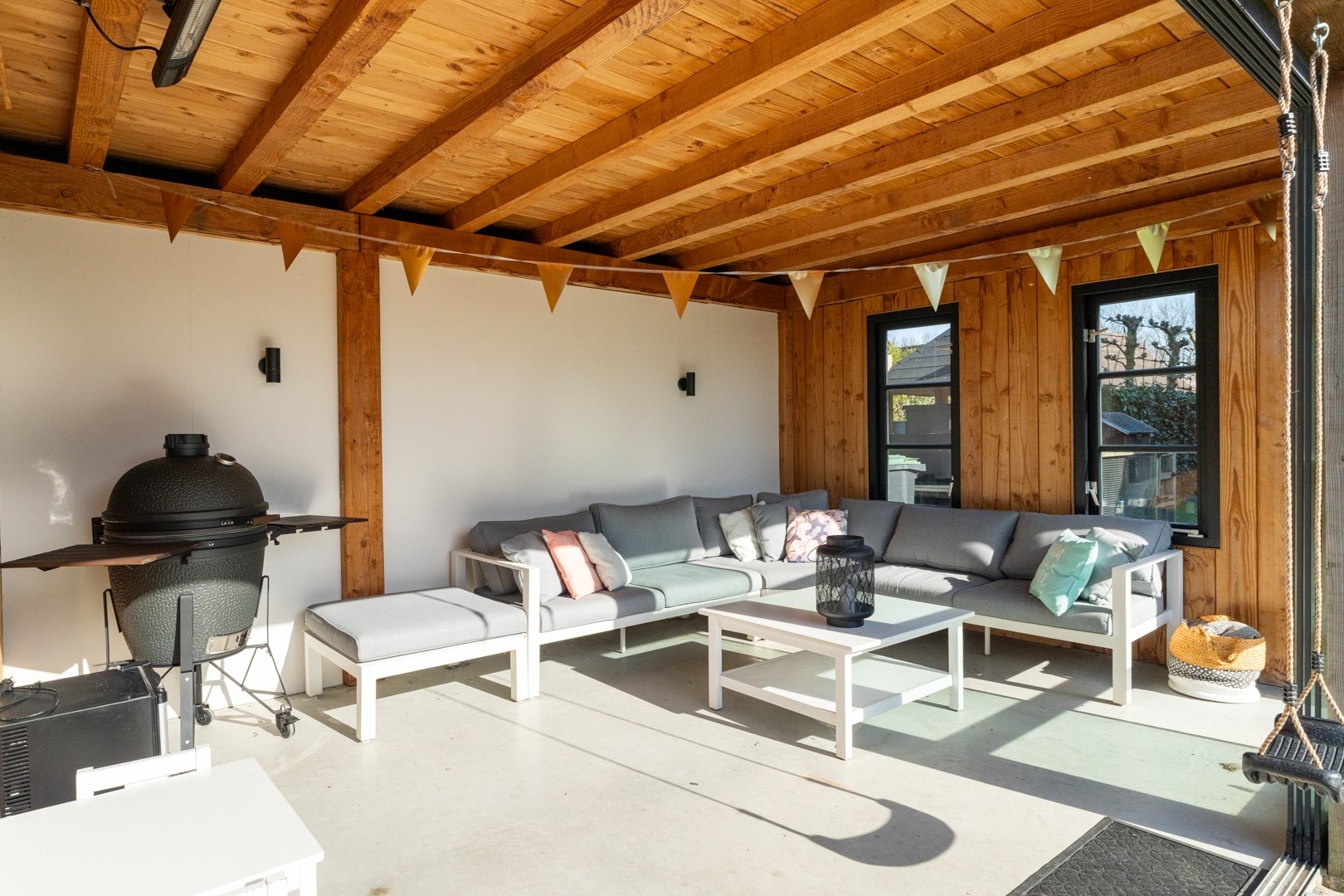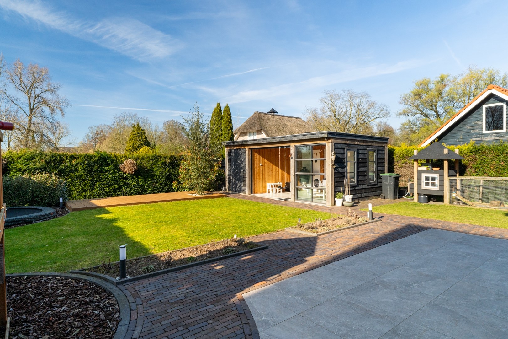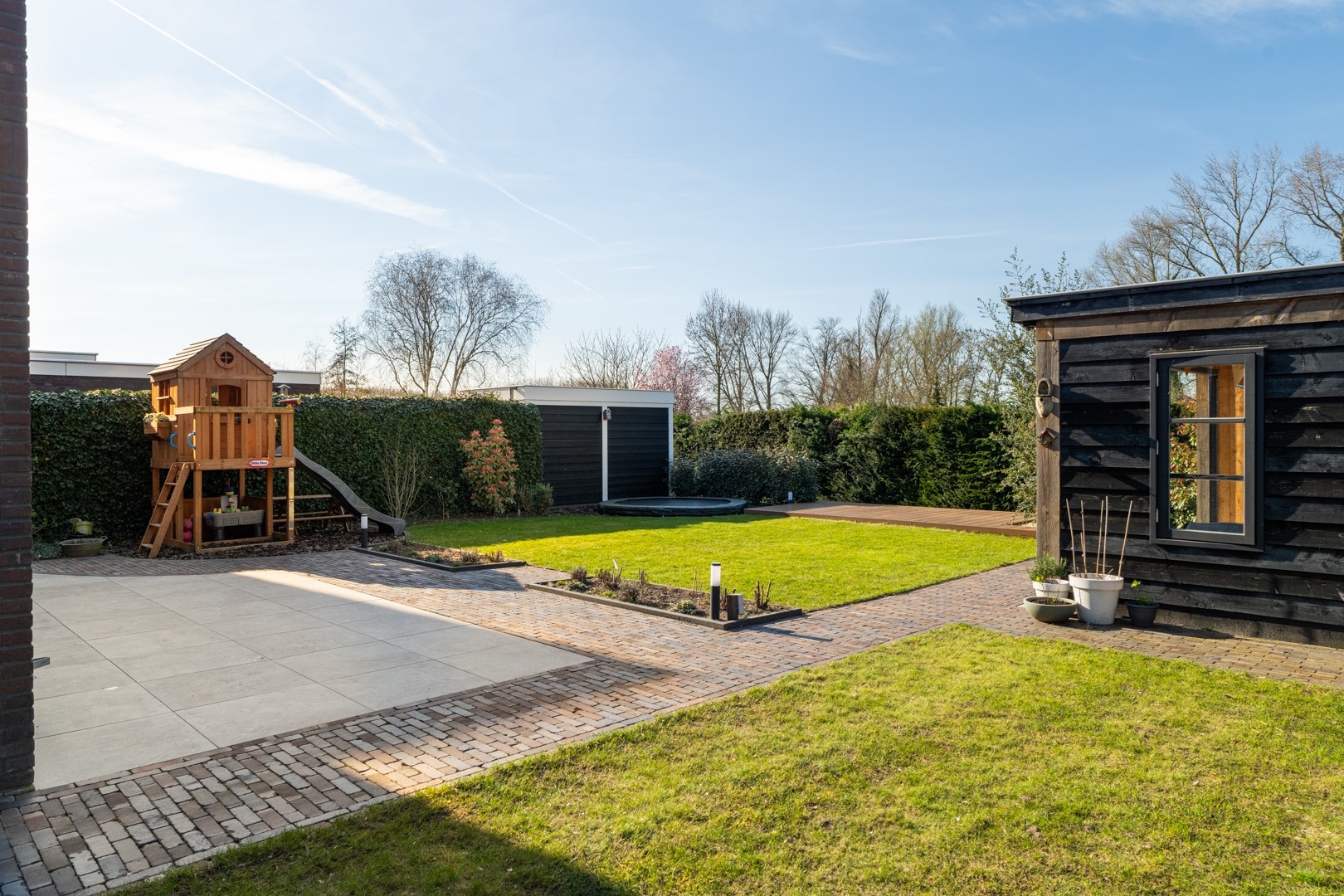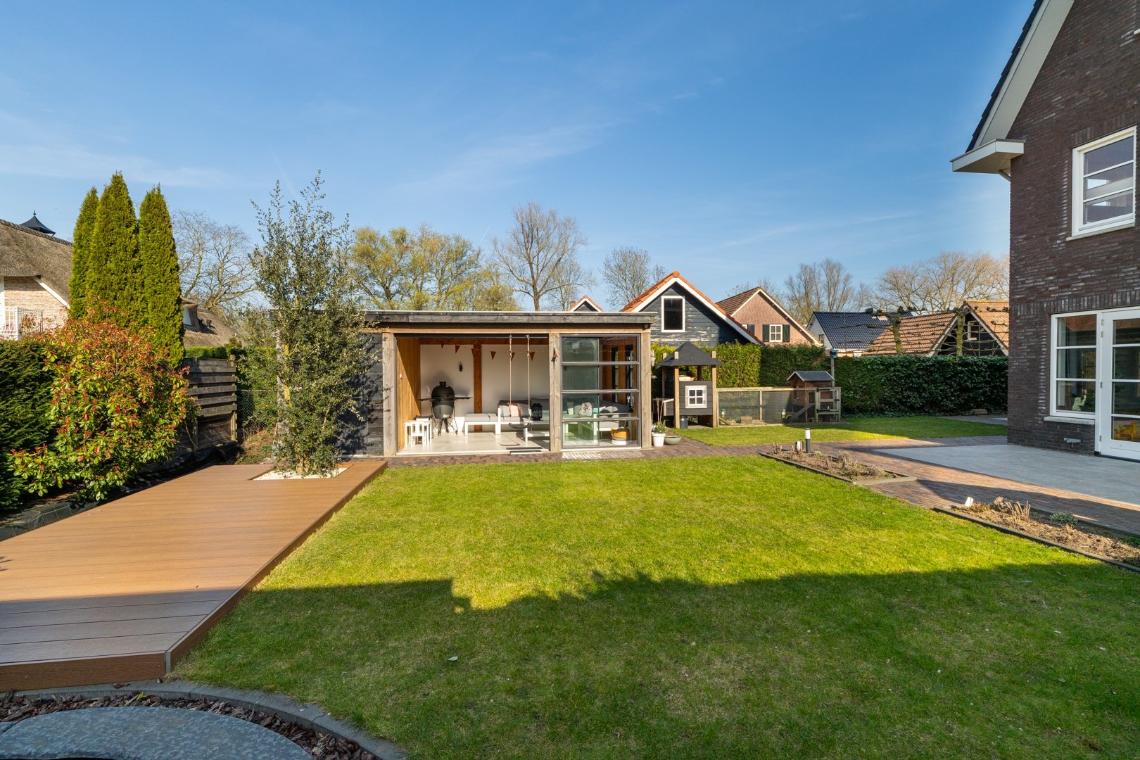 De woning beschikt over een grote en fraai aangelegde tuin die veel privacy biedt en volop ruimte om te genieten van rust en groen. Er zijn mooie exclusieve materialen toegepast. Er is een praktische berging (1.80 x 3.75 meter) aanwezig met elektra en een ruime overkapping (4.84 x 3.75 meter), eveneens voorzien van elektra – ideaal voor lange zomeravonden. De volledig geïsoleerde aangebouwde garage (2.89 x 6.34 meter) biedt extra opslag- of werkruimte. Voor geeft de brede oprit ruim plaats aan meerdere auto’s.
