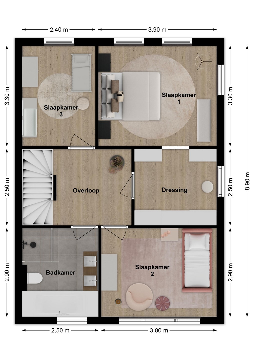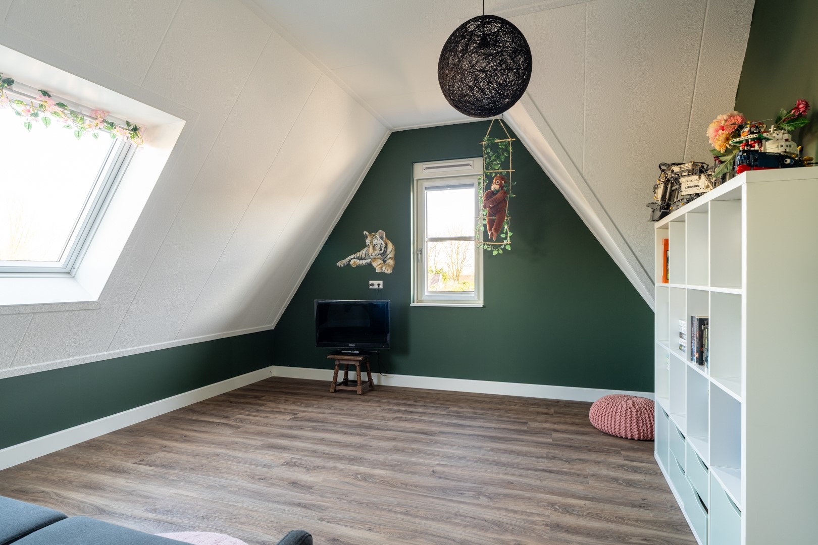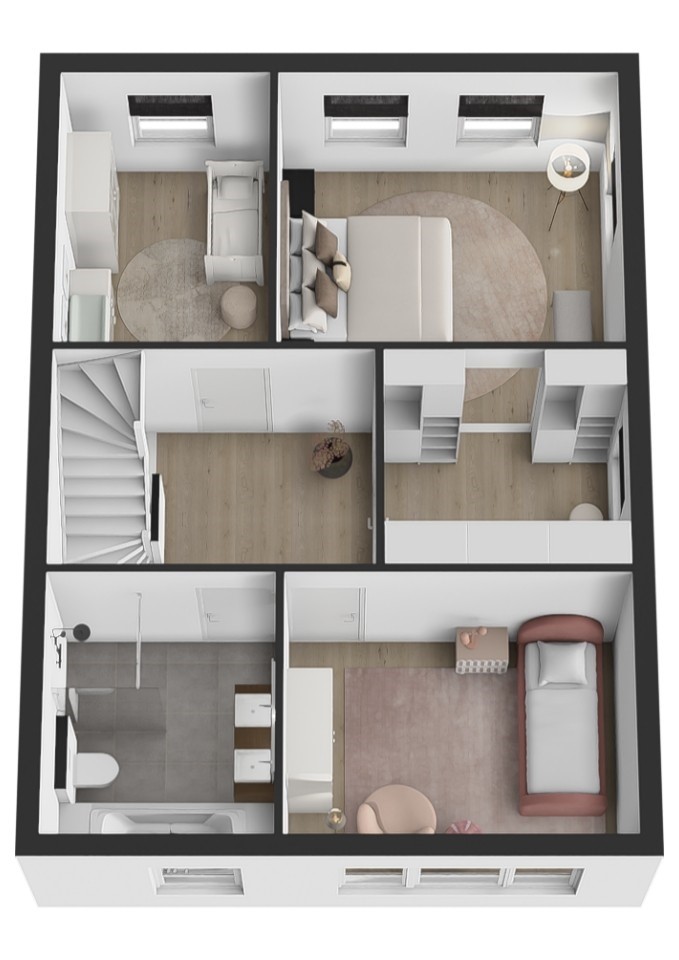 Op de eerste verdieping bevinden zich een ruime overloop, drie volwaardige slaapkamers en een complete badkamer. De masterbedroom beschikt over een royale walk-in closet en airconditioning. Ook de tweede slaapkamer is voorzien van airconditioning. De badkamer is luxe uitgevoerd en voorzien van een dubbel wastafelmeubel, inloopdouche, ligbad, zwevend toilet en een designradiator. De zolderverdieping is een volwaardige woonetage en biedt nog eens twee extra slaapkamers, waarvan één met dakraam en één met dakraam en vaste kast. Op de overloop bevinden zich de wasmachineaansluiting, de cv-ketel, WTW-installatie, omvormer t.b.v. de zonnepanelen en een dakraam wat zorgt voor extra licht en ventilatie.