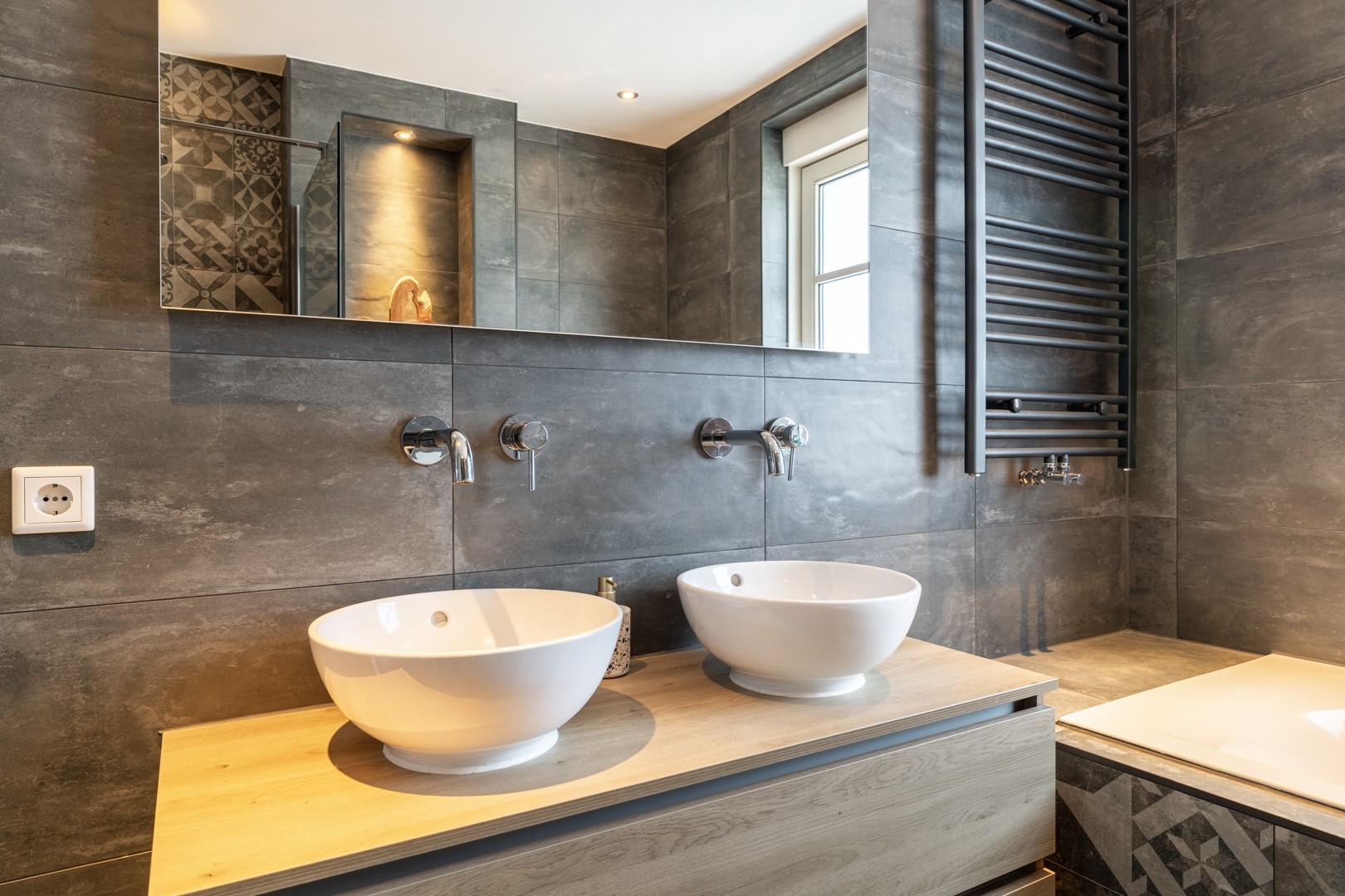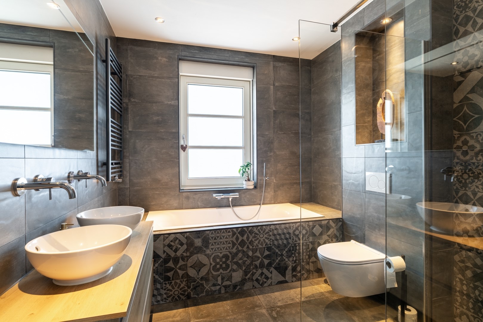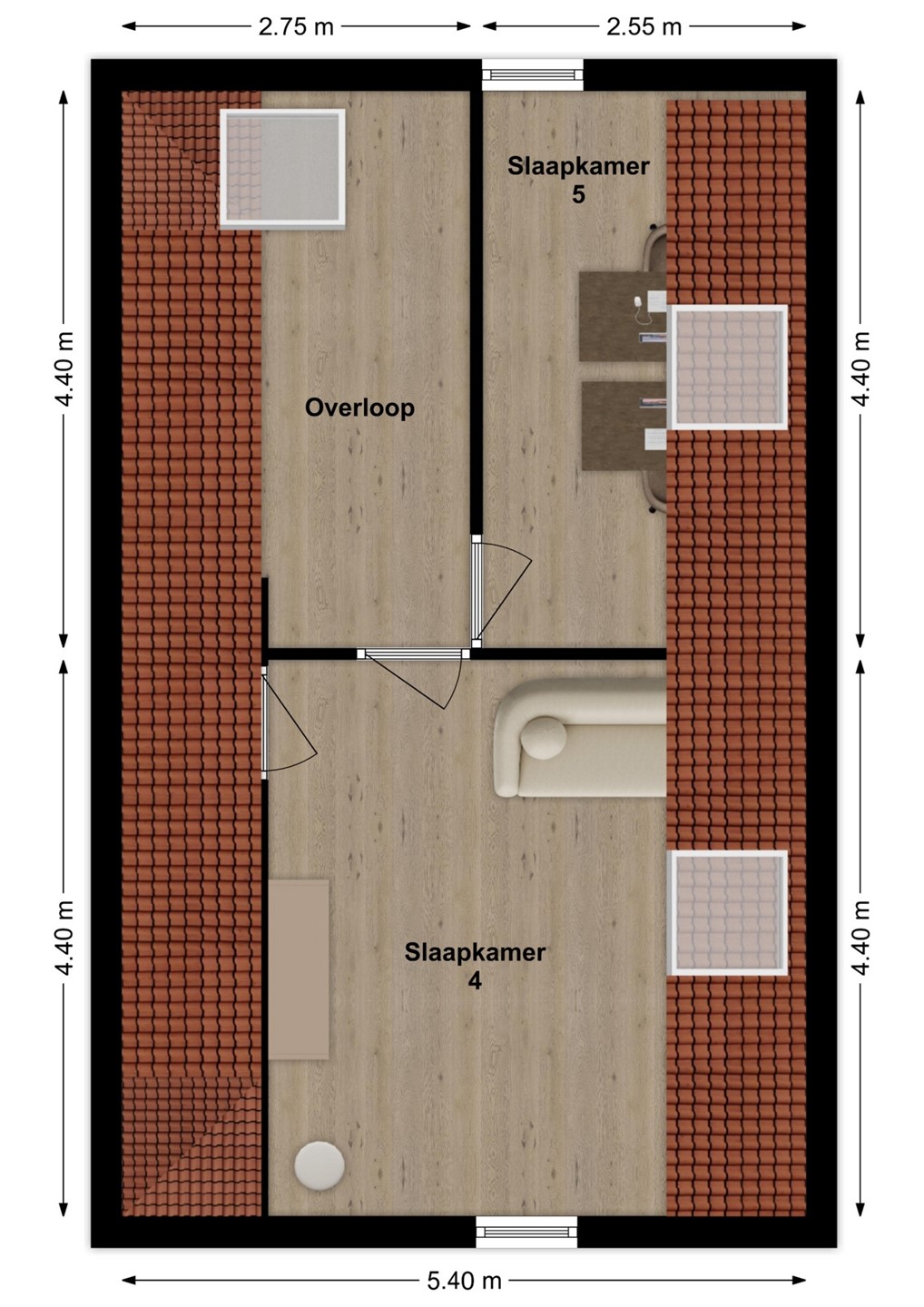 Op de eerste verdieping bevinden zich een ruime overloop, drie volwaardige slaapkamers en een complete badkamer. De masterbedroom beschikt over een royale walk-in closet en airconditioning. Ook de tweede slaapkamer is voorzien van airconditioning. De badkamer is luxe uitgevoerd en voorzien van een dubbel wastafelmeubel, inloopdouche, ligbad, zwevend toilet en een designradiator. De zolderverdieping is een volwaardige woonetage en biedt nog eens twee extra slaapkamers, waarvan één met dakraam en één met dakraam en vaste kast. Op de overloop bevinden zich de wasmachineaansluiting, de cv-ketel, WTW-installatie, omvormer t.b.v. de zonnepanelen en een dakraam wat zorgt voor extra licht en ventilatie.