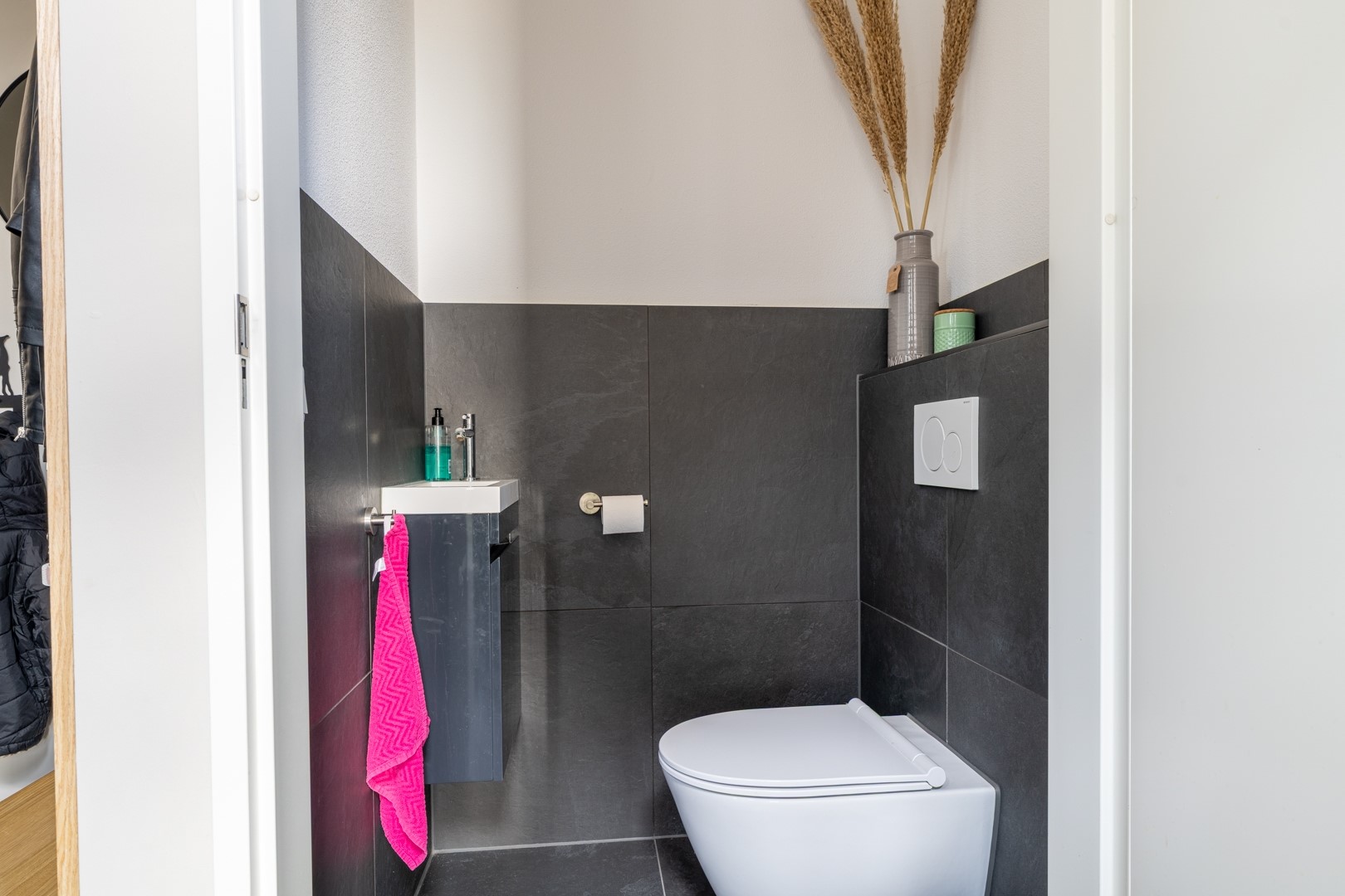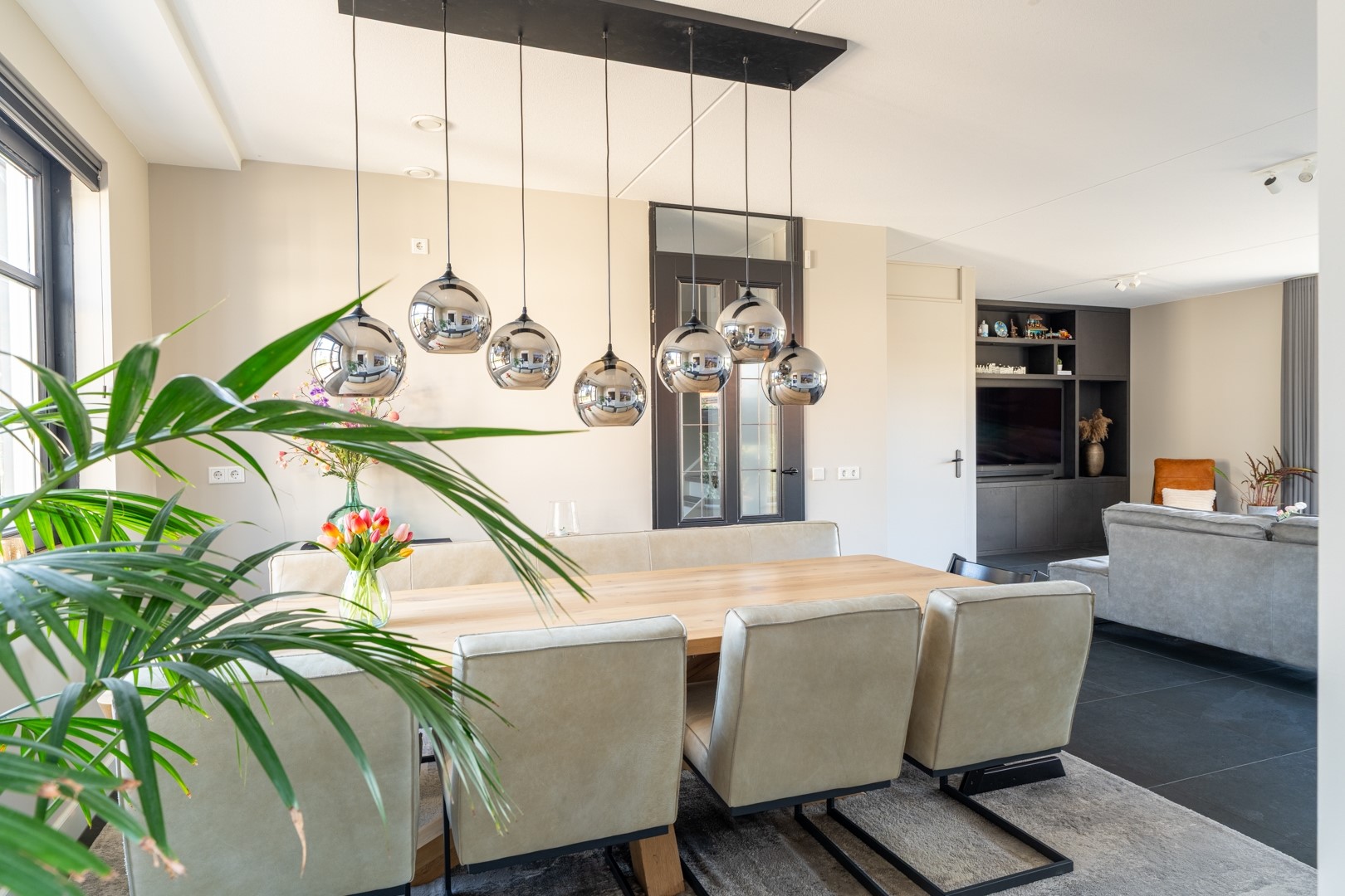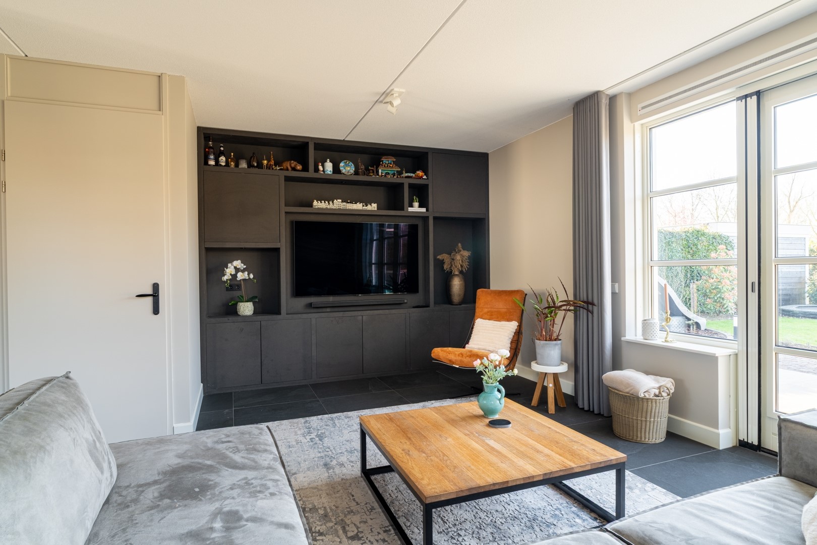 Bij binnenkomst tref je een verzorgde hal met meterkast en een moderne toiletruimte voorzien van fontein. De royale woonkamer is licht en ruim opgezet. Bijzonder fraai is de op maat gemaakte TV wand met vaste kastruimte. Verder is een praktische trapkast aanwezig waarin tevens een waterontharder is geplaatst. Dankzij de openslaande tuindeuren staat de woonkamer in directe verbinding met de tuin, wat zorgt voor een fijne lichtinval en een optimale beleving van het buitenleven.