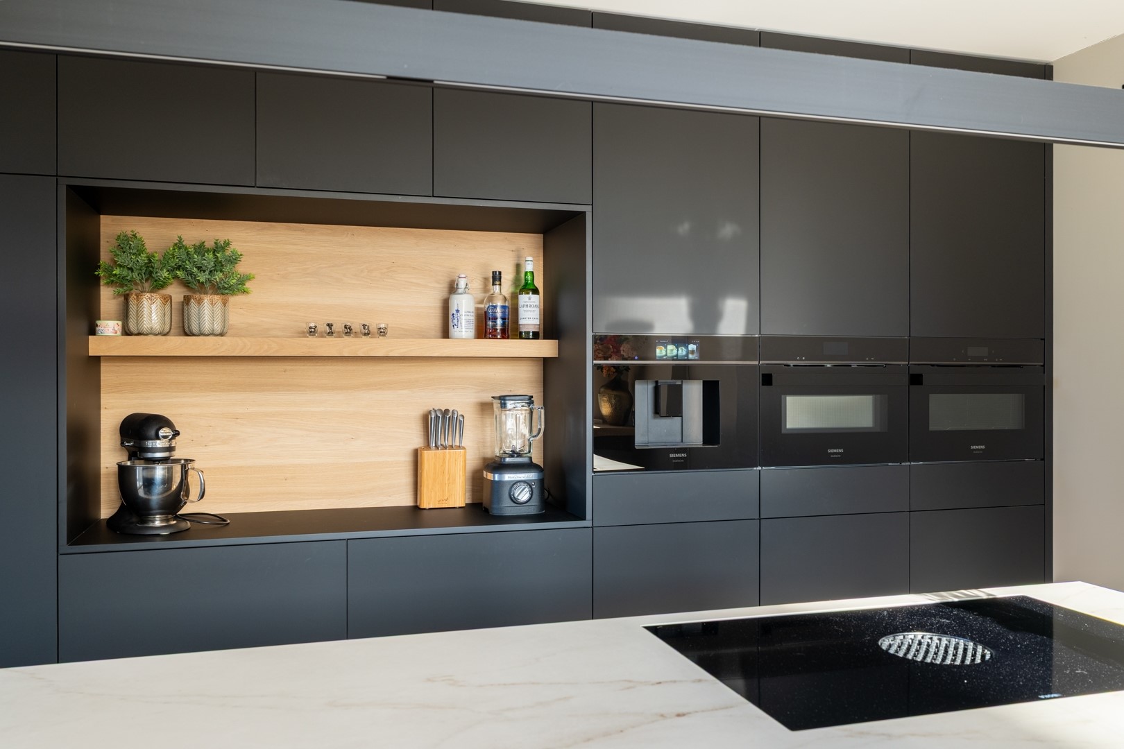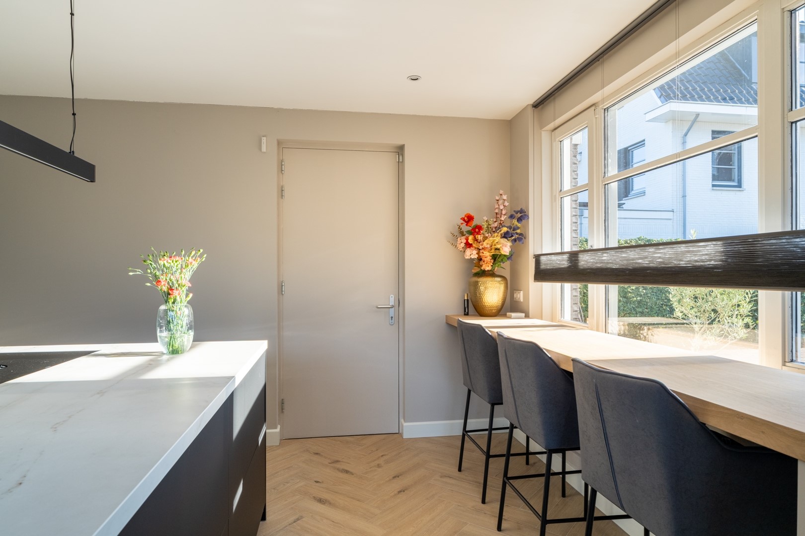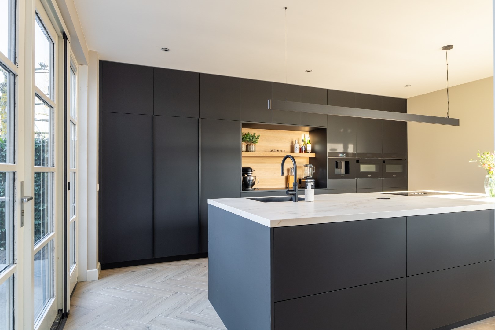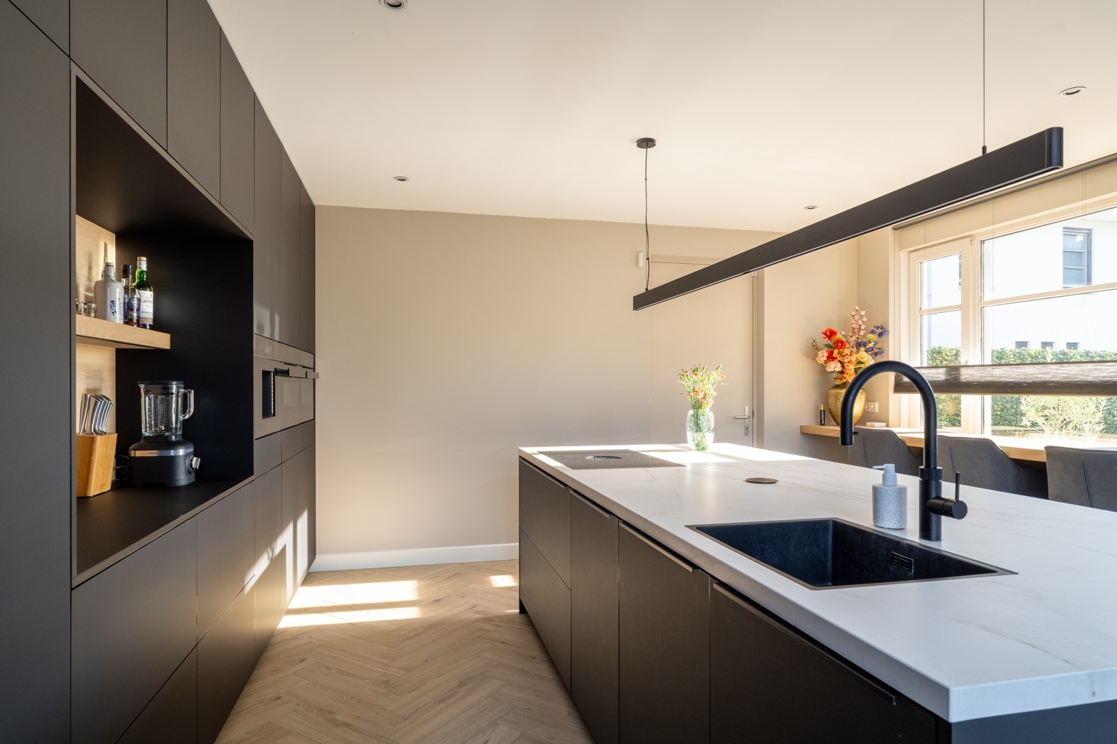 DÉ EYECATCHER! Schitterende woonkeuken (geplaatst in 2024), extra luxe afgewerkt en van alle gemakken voorzien. De keukenopstelling met eiland beschikt over hoogwaardige inbouwapparatuur, waaronder een koelkast, vriezer, vaatwasser, Bora-inductiekookplaat, koffiemachine, combi-oven, separate oven en een Cooker Cube. Het werkblad is uitgevoerd in Dekton, dus krassen zijn verleden tijd. Deze moderne en complete keuken biedt volop ruimte om uitgebreid te koken en gezellig samen te komen. Onder het raam wat uitzicht geeft op de straat is een barblad gemaakt. Hier is het lekker ontbijten of lees je wat terwijl er gekookt wordt.