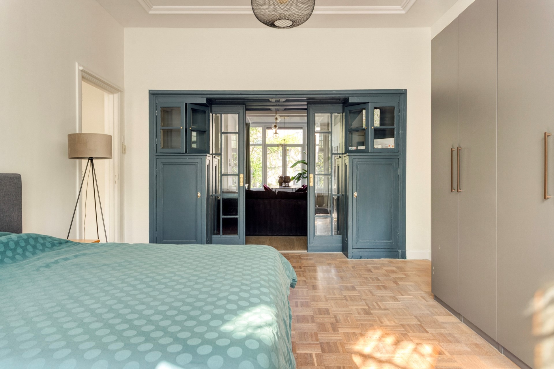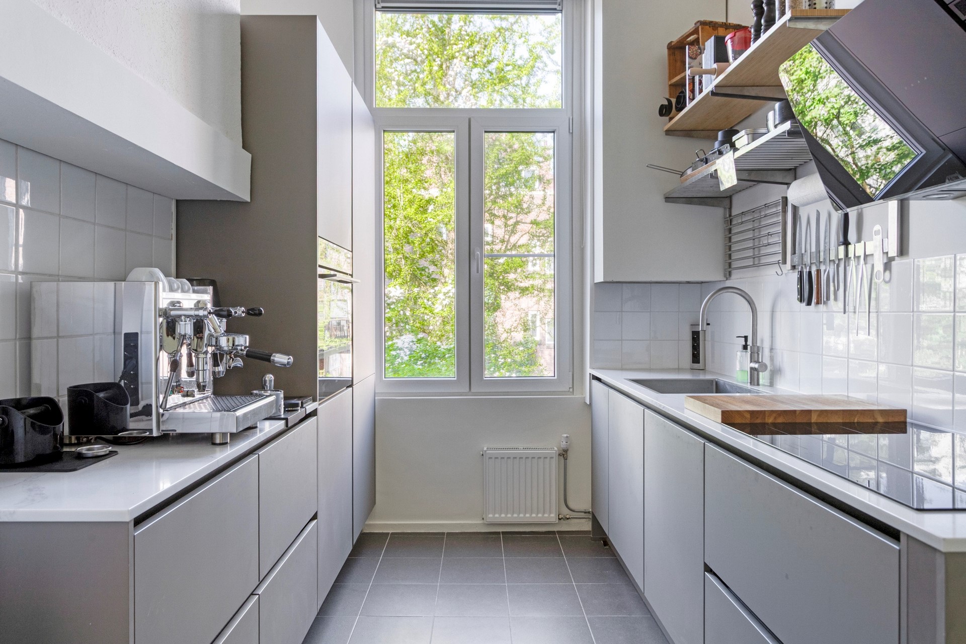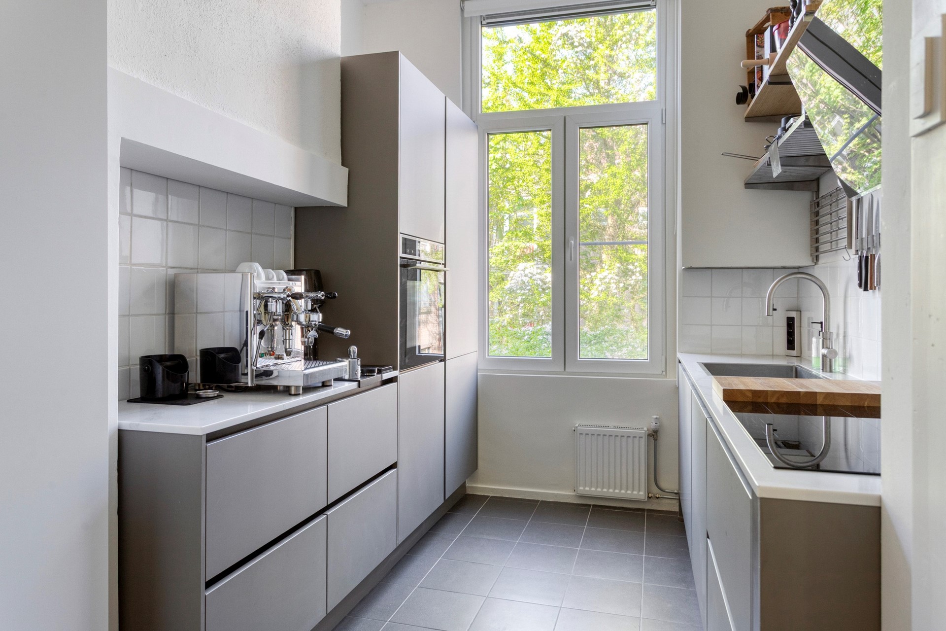 De woonkamer is opgedeeld in een voor- en achterkamer waarvan de voorkamer nu in gebruik als slaapkamer is, gescheiden door sfeervolle en-suite deuren. Dit zorgt niet alleen voor karakter, maar ook voor flexibiliteit in het gebruik van de ruimte. De achterkamer is voorzien van een originele (niet werkende) schouw en vaste kasten, wat bijdraagt aan de authentieke sfeer van de woning. De luxe keuken is in 2023 vernieuwd en uitgevoerd in 2 rechte opstellingen voorzien van inbouwapparatuur waaronder inductiekookplaat met afzuigkap (recirculatie), vaatwasser, Quooker en combi-oven. Deze sluit aan op de praktische indeling van het appartement en biedt toegang tot de badkamer.