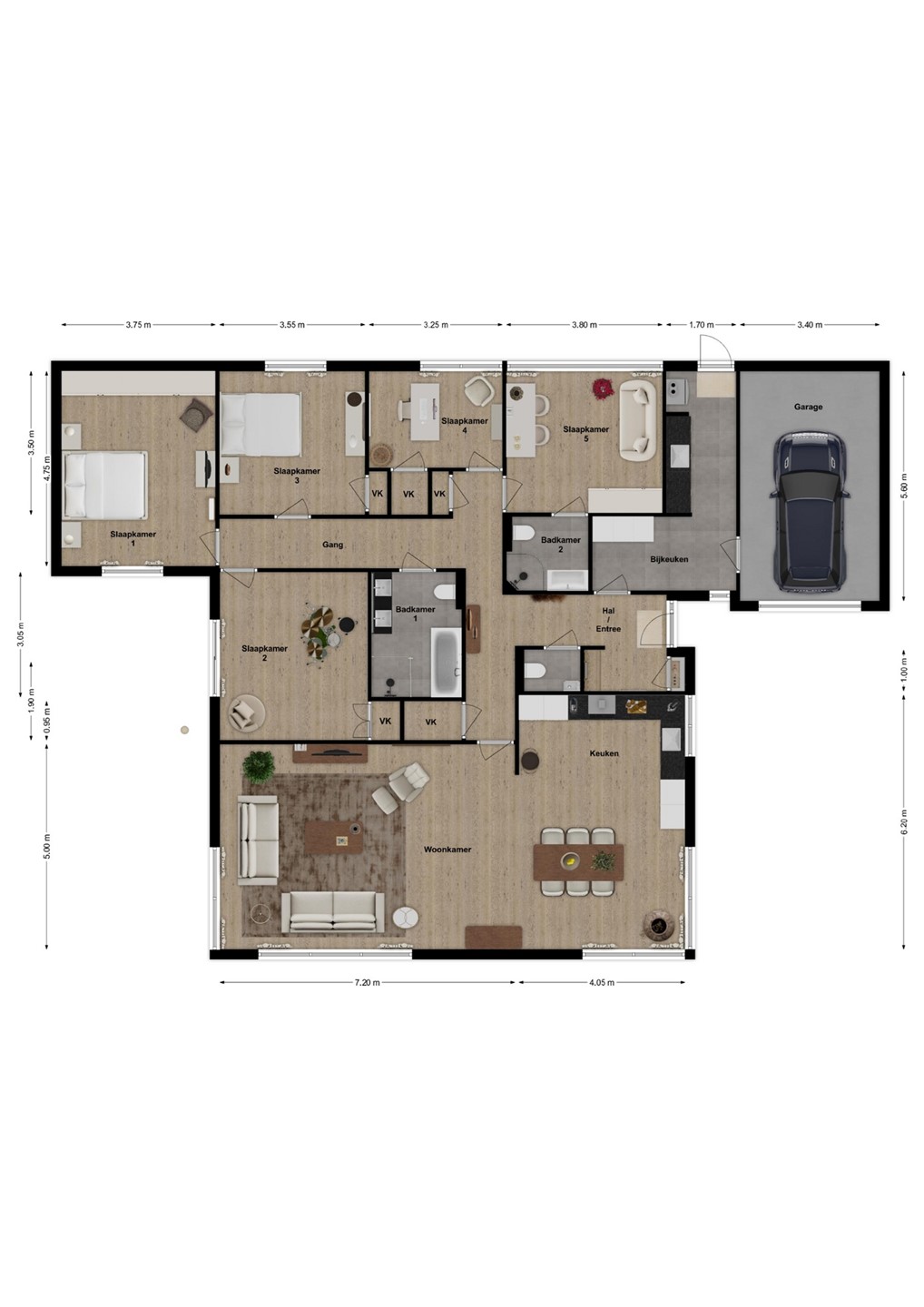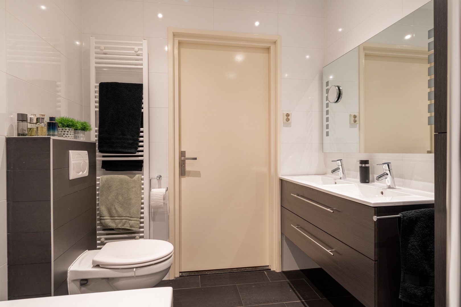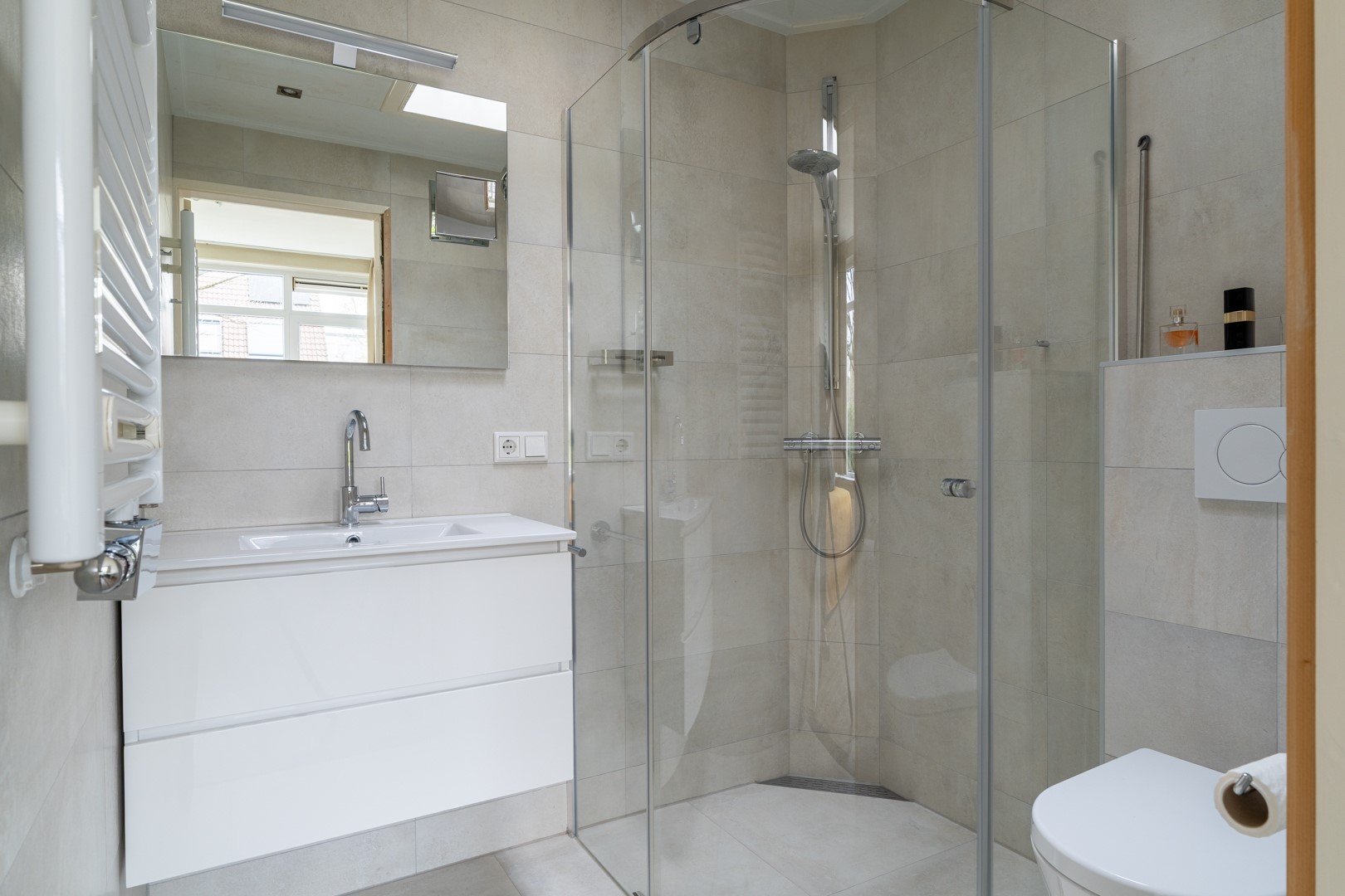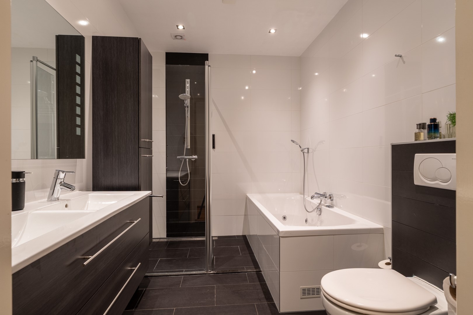 Vijf ruime slaapkamers bieden volop mogelijkheden voor slapen, werken of hobby’s. Eén slaapkamer beschikt over een badkamer en suite met inloopdouche, wastafelmeubel, zwevend toilet en designradiator. Aan de achterzijde liggen de twee grootste slaapkamers, waarvan één directe toegang heeft tot een zonneterras via een schuifpui. De tweede badkamer is een echte wellnessruimte met whirlpool, inloopdouche, dubbel wastafelmeubel, zwevend toilet en designradiator.