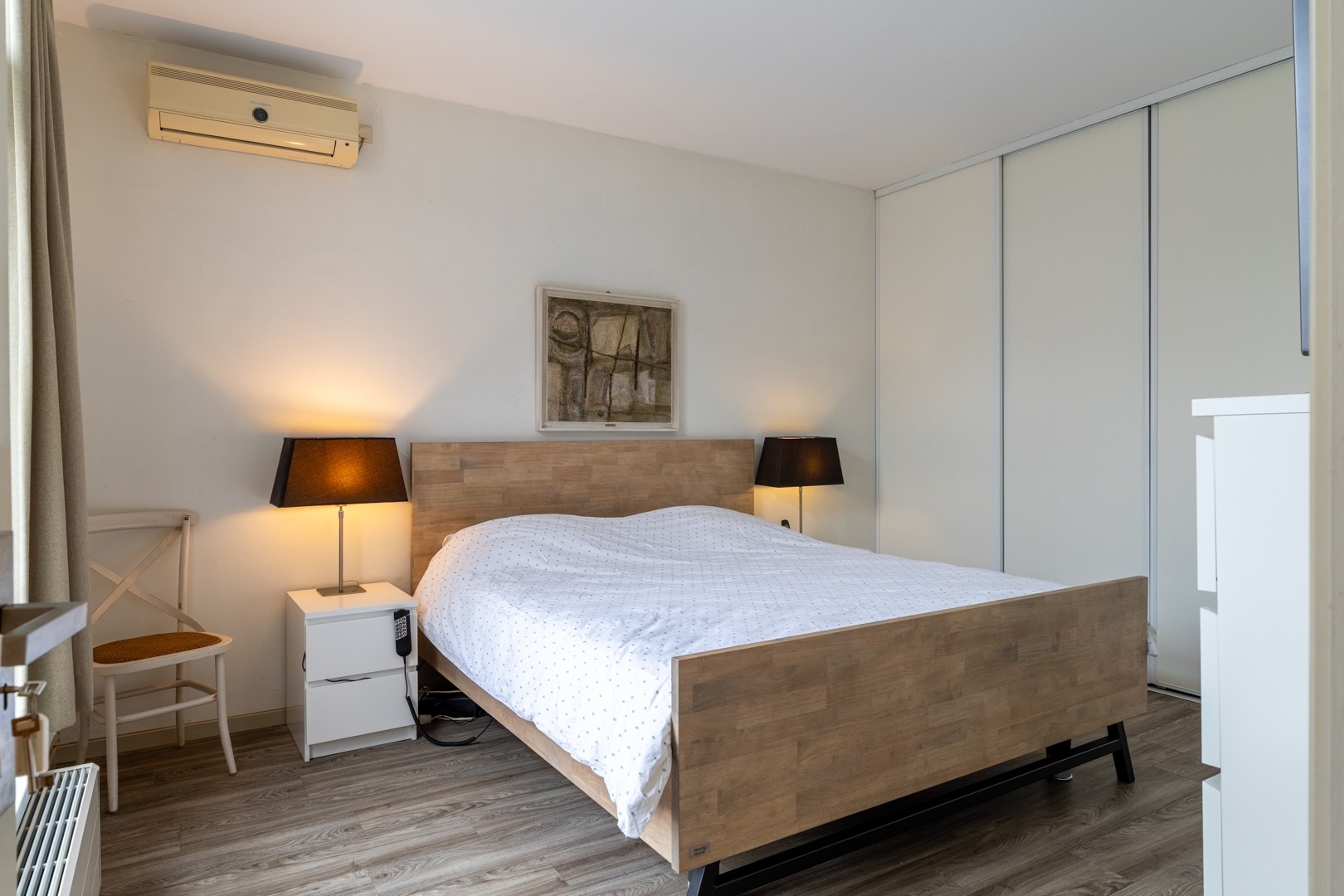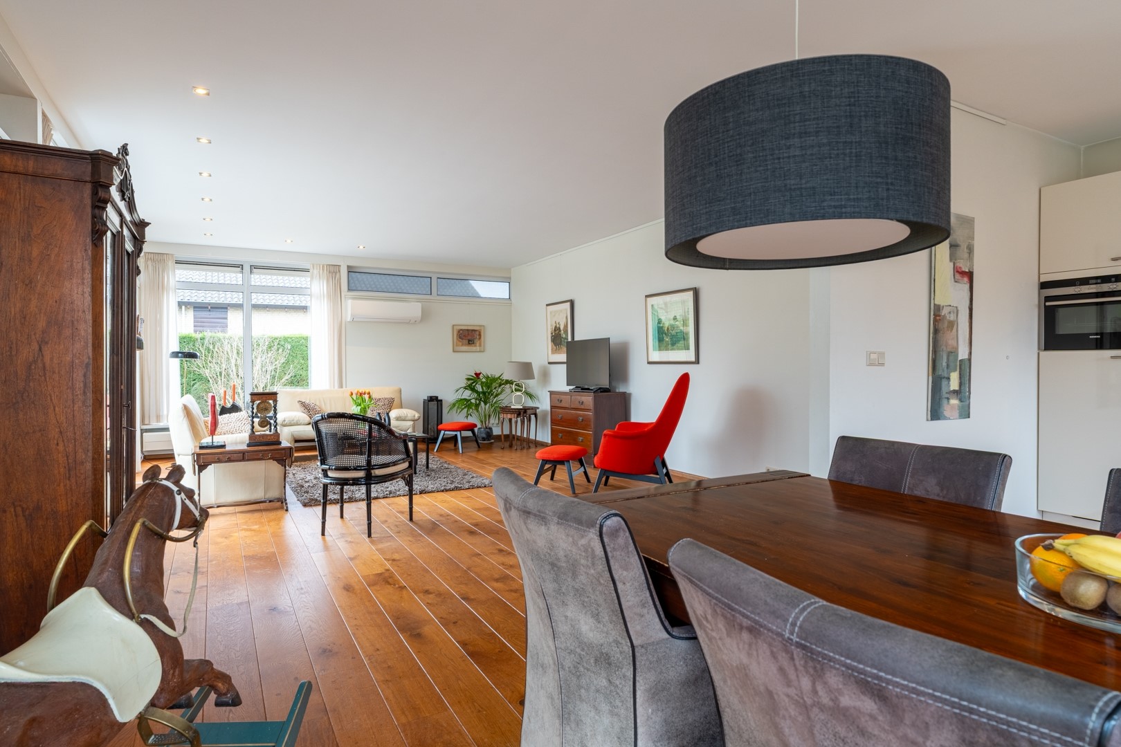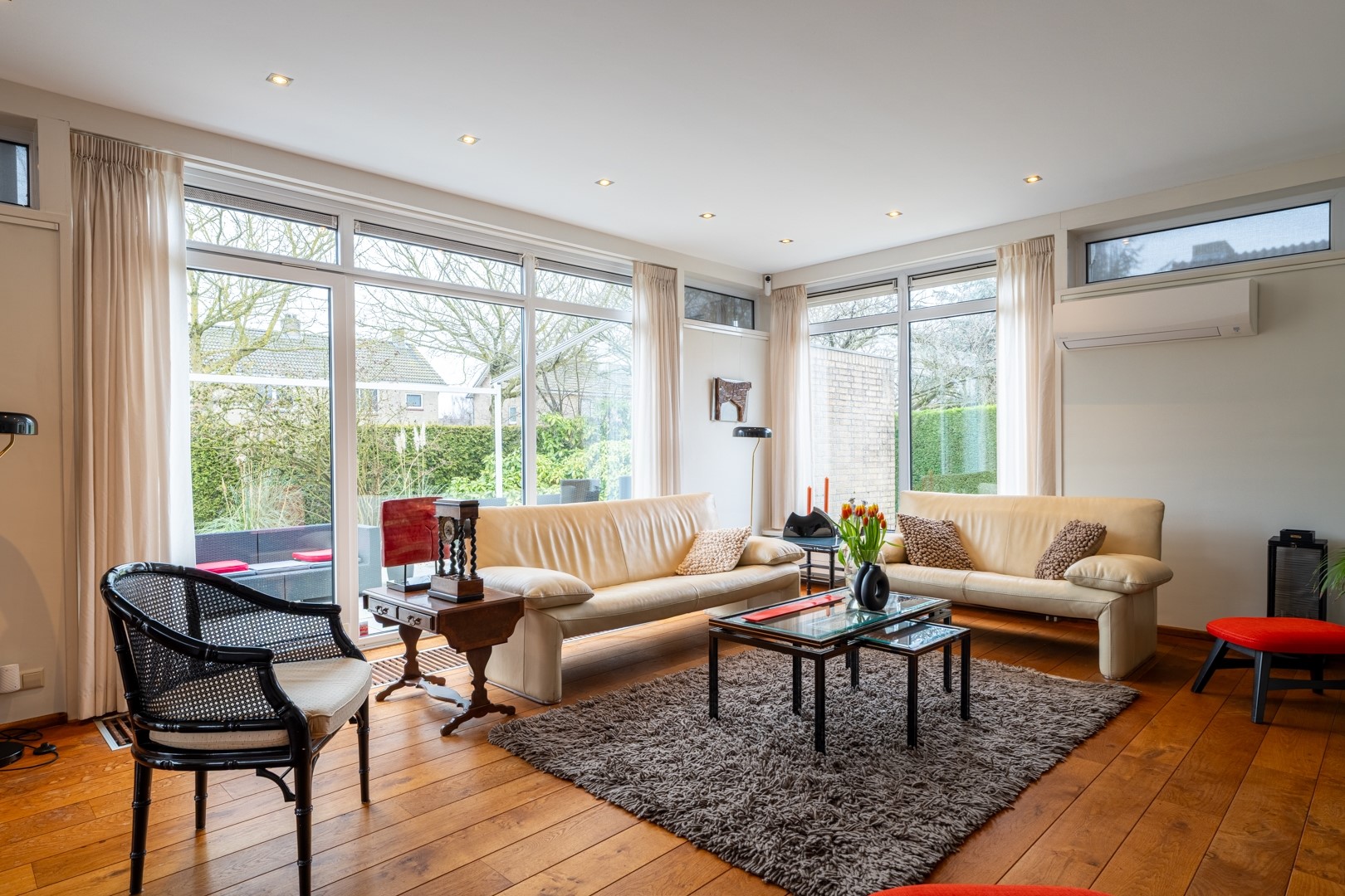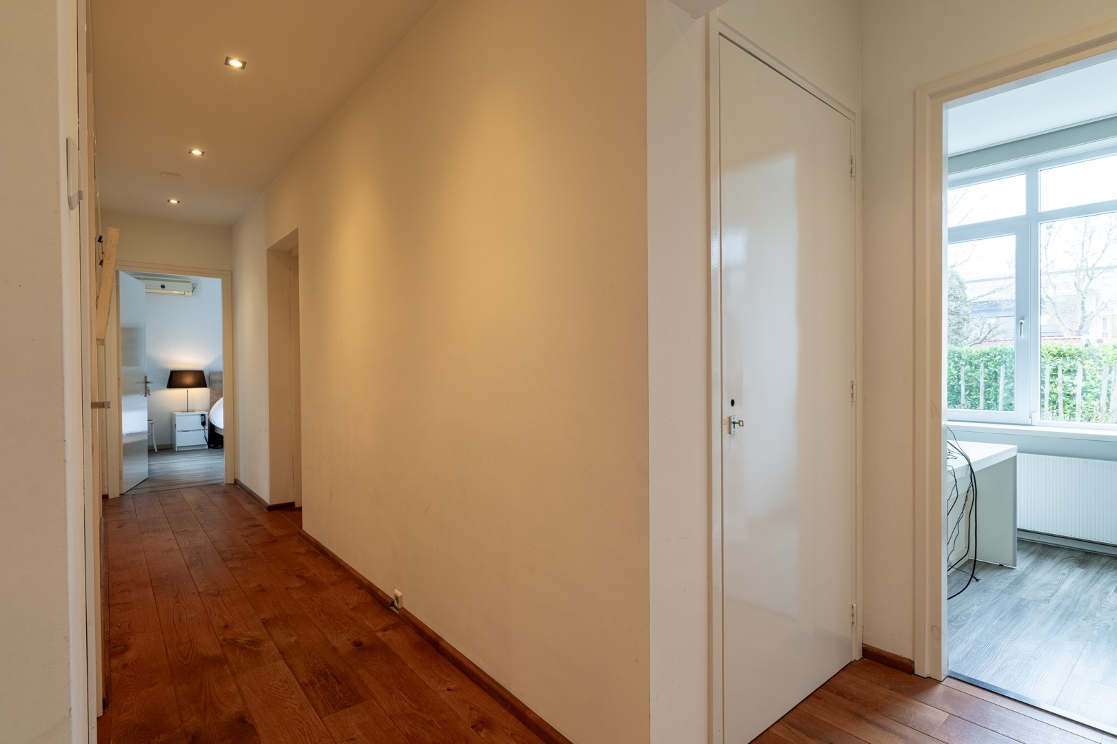 Via de entree kom je in een centrale hal die toegang biedt tot vrijwel alle vertrekken – praktisch en overzichtelijk. De woonkamer is dankzij de grote raampartijen aan de zonzijde heerlijk licht en staat in open verbinding met de keuken. Deze luxe keuken is uitgevoerd in een hoekopstelling met een zwart composiet werkblad (wat aanvoelt als natuursteen) en voorzien van onder andere een dubbele combioven, inductiekookplaat, vaatwasser en koelkast. In de woonkamer/keuken zorgen, naast een airco, zonnescherm en screens voor een aangenaam klimaat in de zomer. Aan bergruimte geen gebrek. In de hal vind je daarnaast meerdere vaste kasten en een modern toilet met zwevend closet en wastafelmeubel.