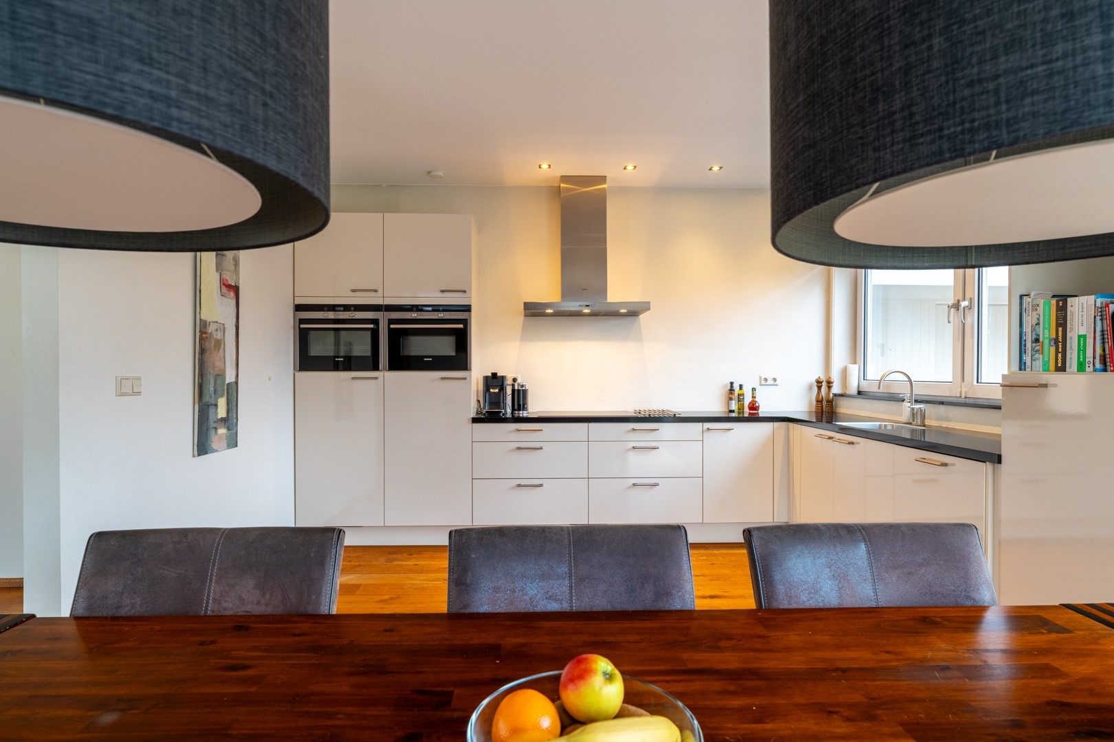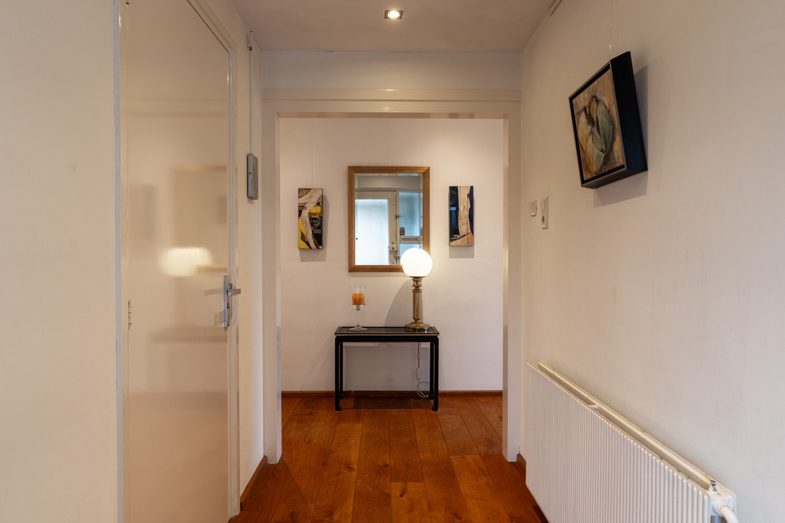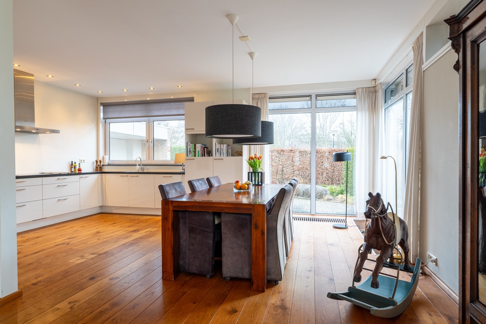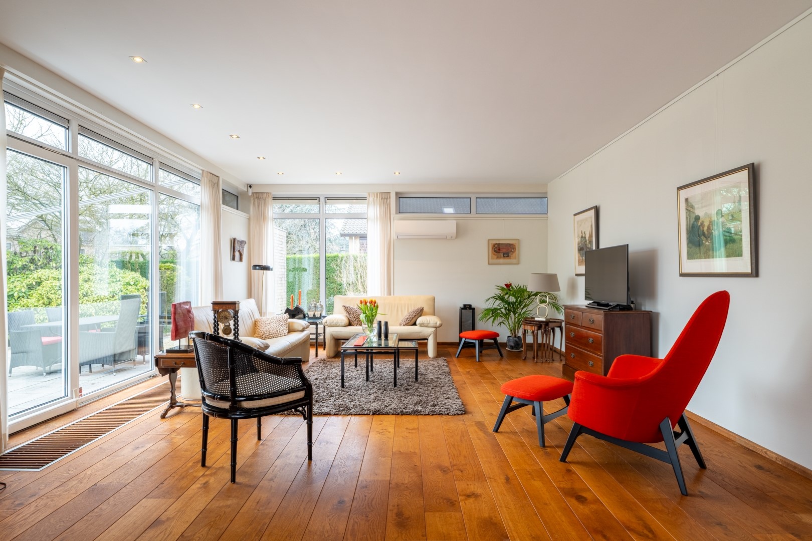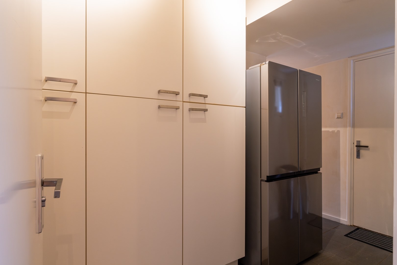Via de entree kom je in een centrale hal die toegang biedt tot vrijwel alle vertrekken – praktisch en overzichtelijk. De woonkamer is dankzij de grote raampartijen aan de zonzijde heerlijk licht en staat in open verbinding met de keuken. Deze luxe keuken is uitgevoerd in een hoekopstelling met een zwart composiet werkblad (wat aanvoelt als natuursteen) en voorzien van onder andere een dubbele combioven, inductiekookplaat, vaatwasser en koelkast. In de woonkamer/keuken zorgen, naast een airco, zonnescherm en screens voor een aangenaam klimaat in de zomer. Aan bergruimte geen gebrek. In de hal vind je daarnaast meerdere vaste kasten en een modern toilet met zwevend closet en wastafelmeubel.