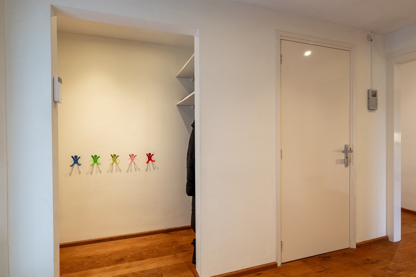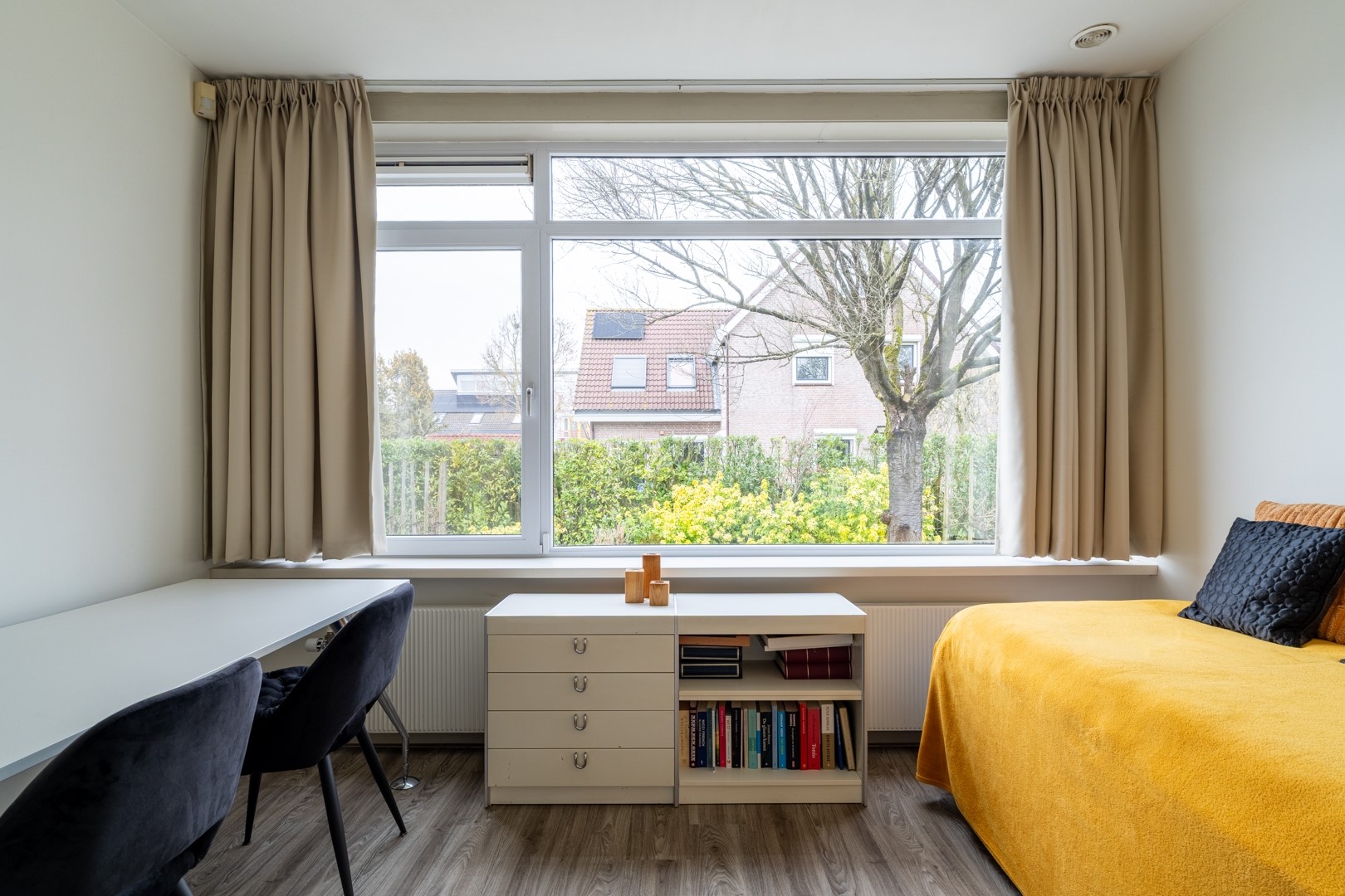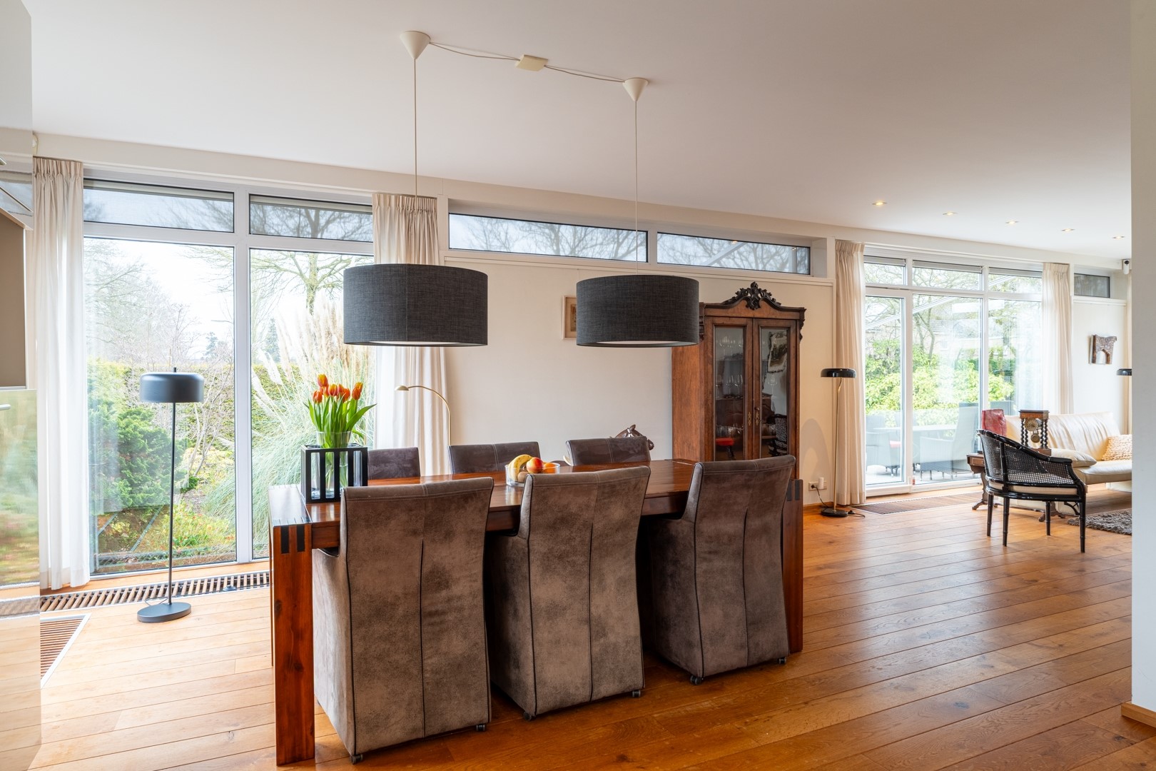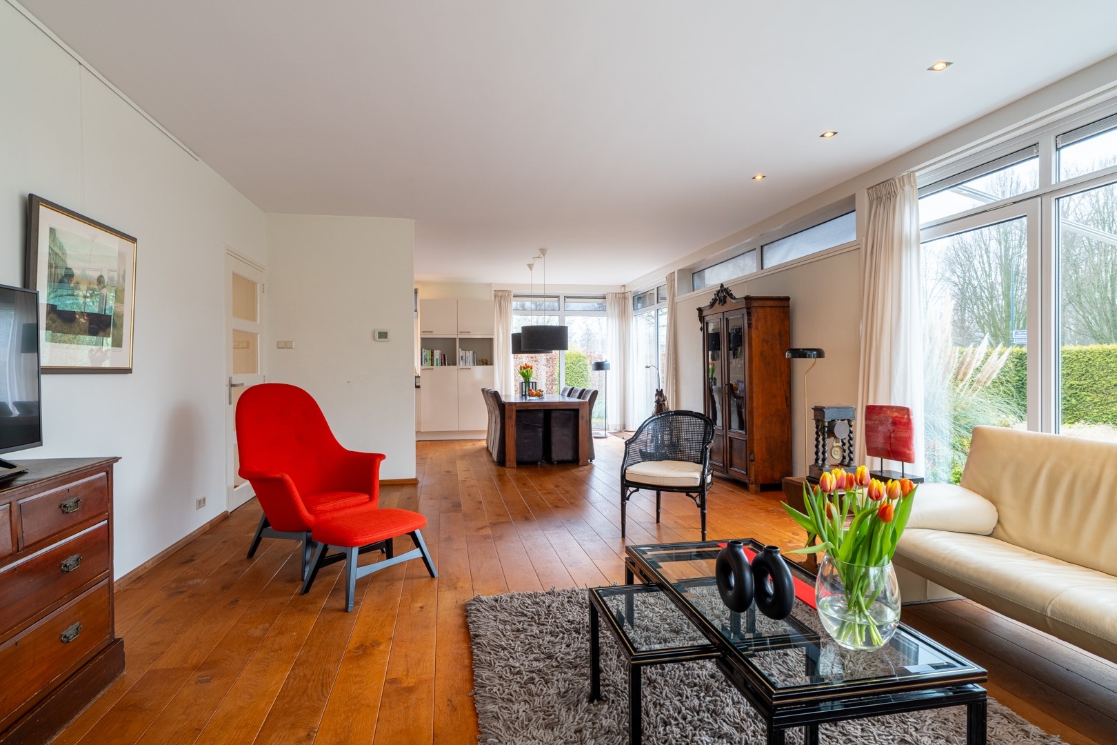 Via de entree kom je in een centrale hal die toegang biedt tot vrijwel alle vertrekken – praktisch en overzichtelijk. De woonkamer is dankzij de grote raampartijen aan de zonzijde heerlijk licht en staat in open verbinding met de keuken. Deze luxe keuken is uitgevoerd in een hoekopstelling met een zwart composiet werkblad (wat aanvoelt als natuursteen) en voorzien van onder andere een dubbele combioven, inductiekookplaat, vaatwasser en koelkast. In de woonkamer/keuken zorgen, naast een airco, zonnescherm en screens voor een aangenaam klimaat in de zomer. Aan bergruimte geen gebrek. In de hal vind je daarnaast meerdere vaste kasten en een modern toilet met zwevend closet en wastafelmeubel.