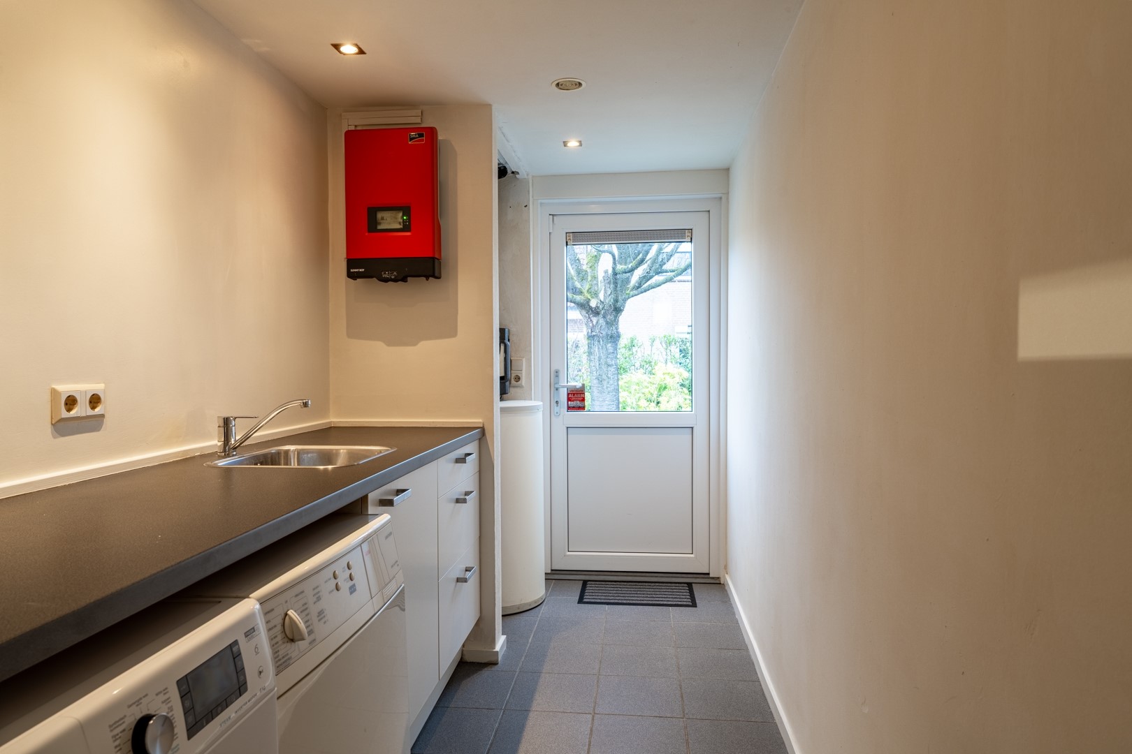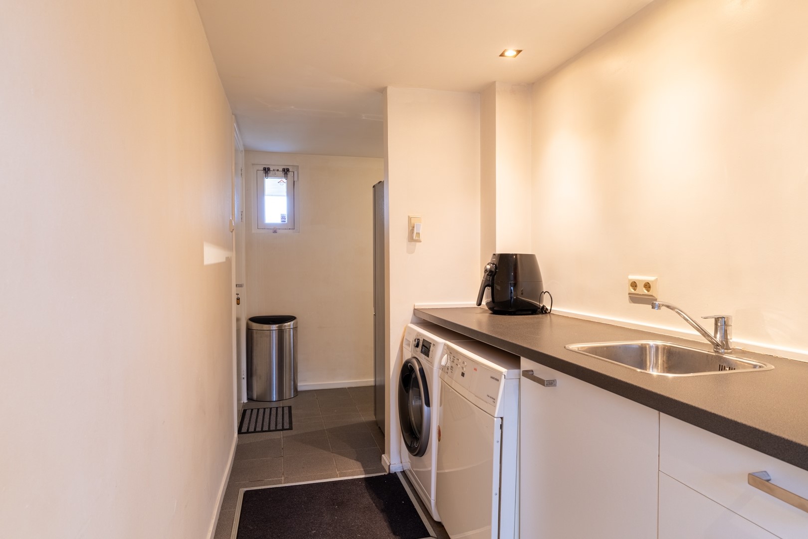 De garage is binnendoor bereikbaar via de bijkeuken, die is ingericht met een kitchenette, washoek en cv-opstelling. Aan de voorzijde bevindt zich een kanteldeur.