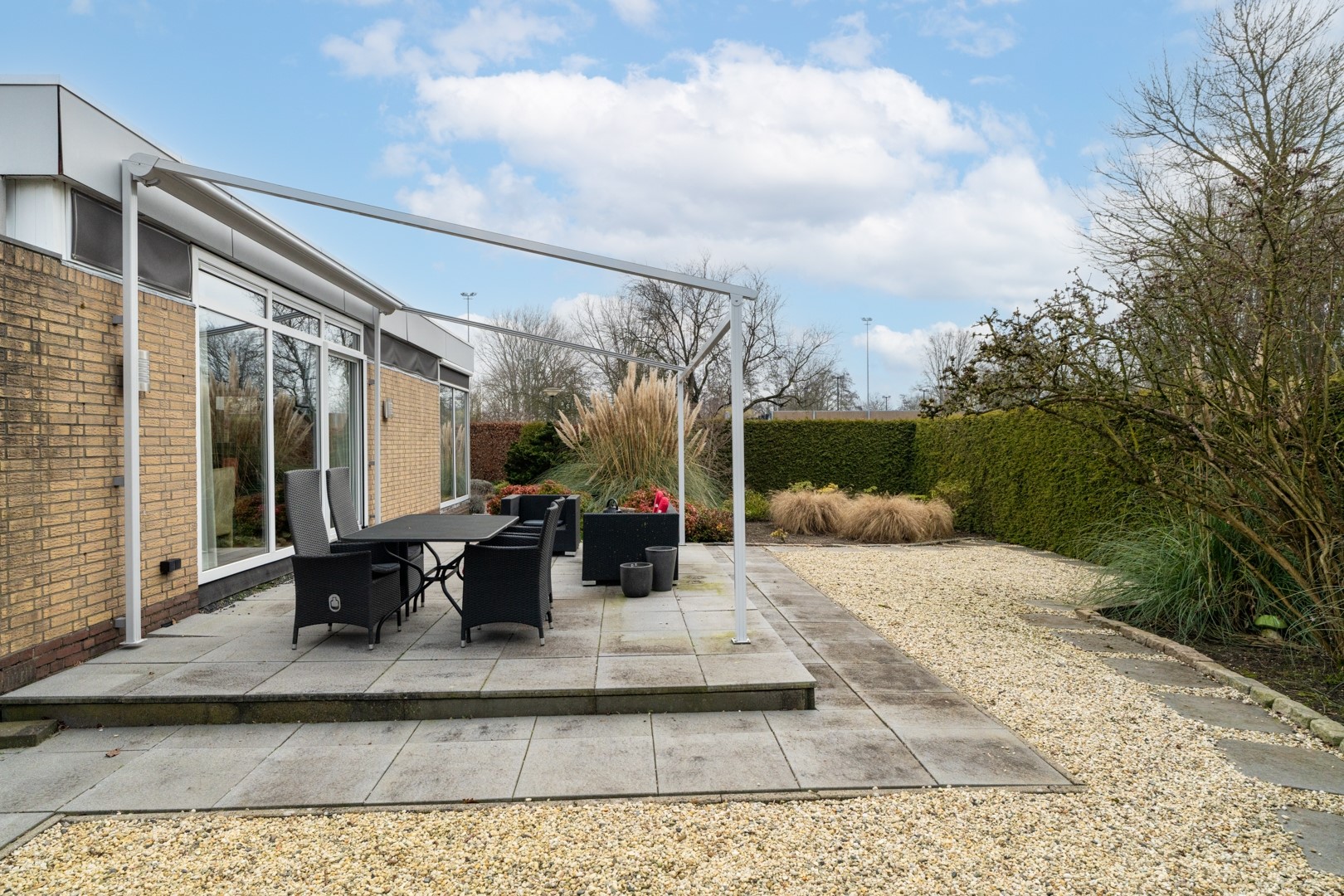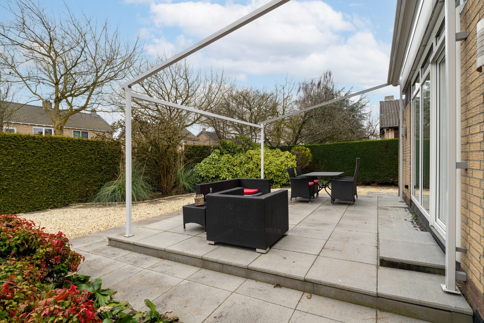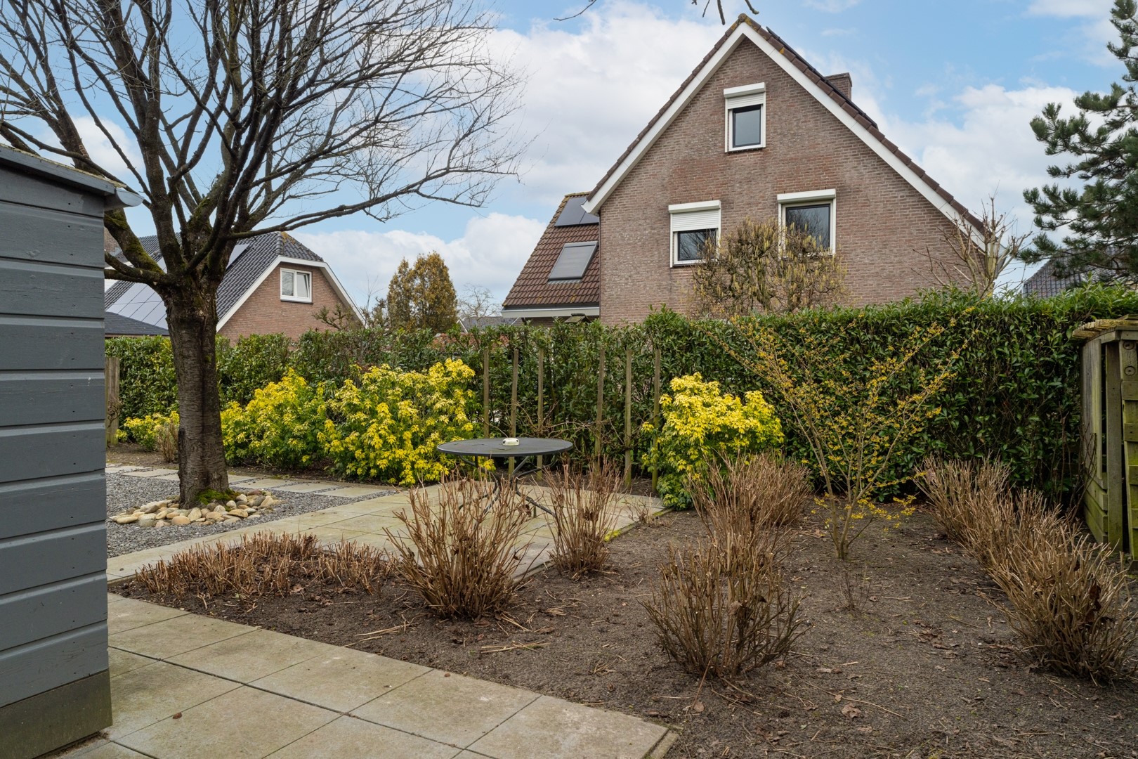 De fraai aangelegde tuin rondom de woning past perfect bij het royale perceel van ruim 1.000 m². Of je nu zon of schaduw zoekt, er is altijd een fijne plek te vinden. Via schuifpuien in de woonkamer en één van de slaapkamers bereik je de zonneterrassen. In totaal zijn er vier terrassen aanwezig. Daarnaast beschikt de tuin over een tuinhuis met separate houtopslag en is er aan de garage een houten fietsenstalling gebouwd. Rust en privacy staan hier centraal. Aan de voorzijde is er volop parkeergelegenheid én de mogelijkheid om te laden op eigen terrein.