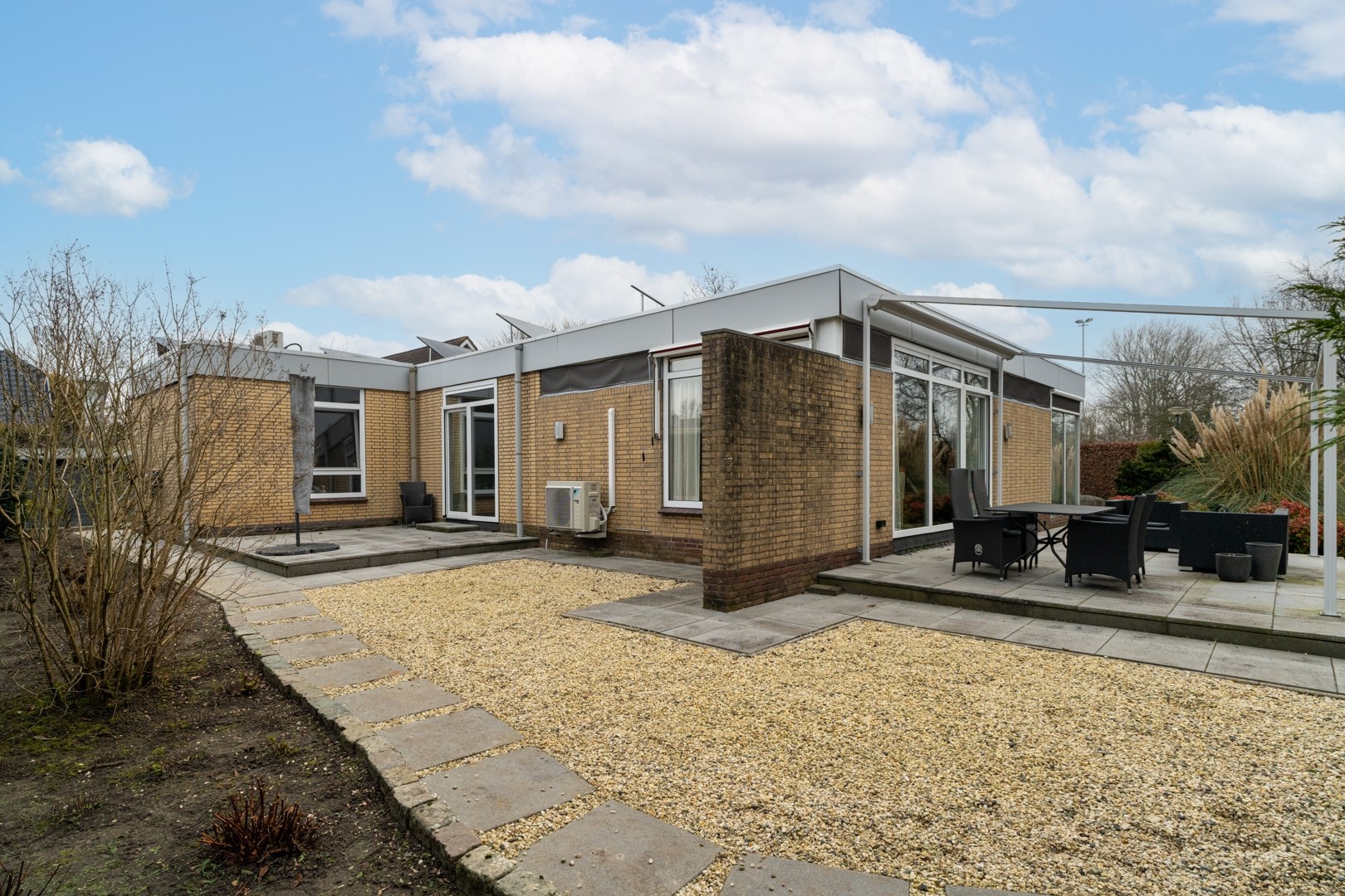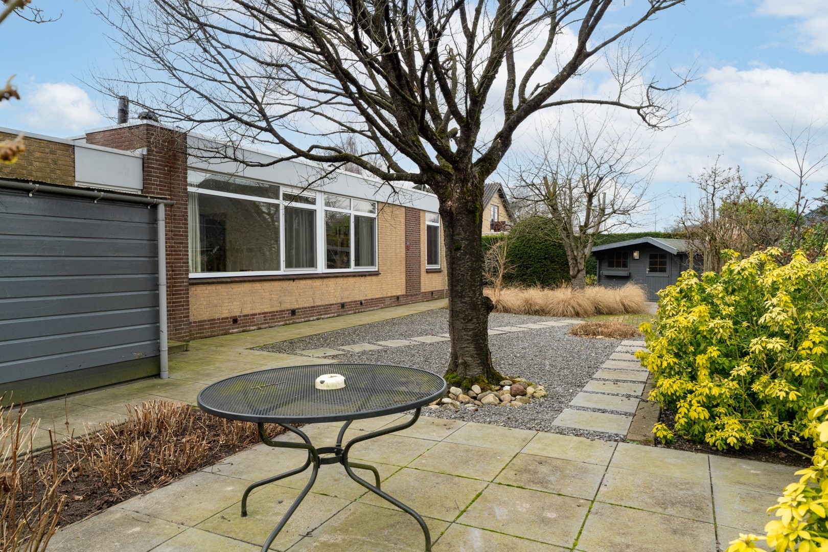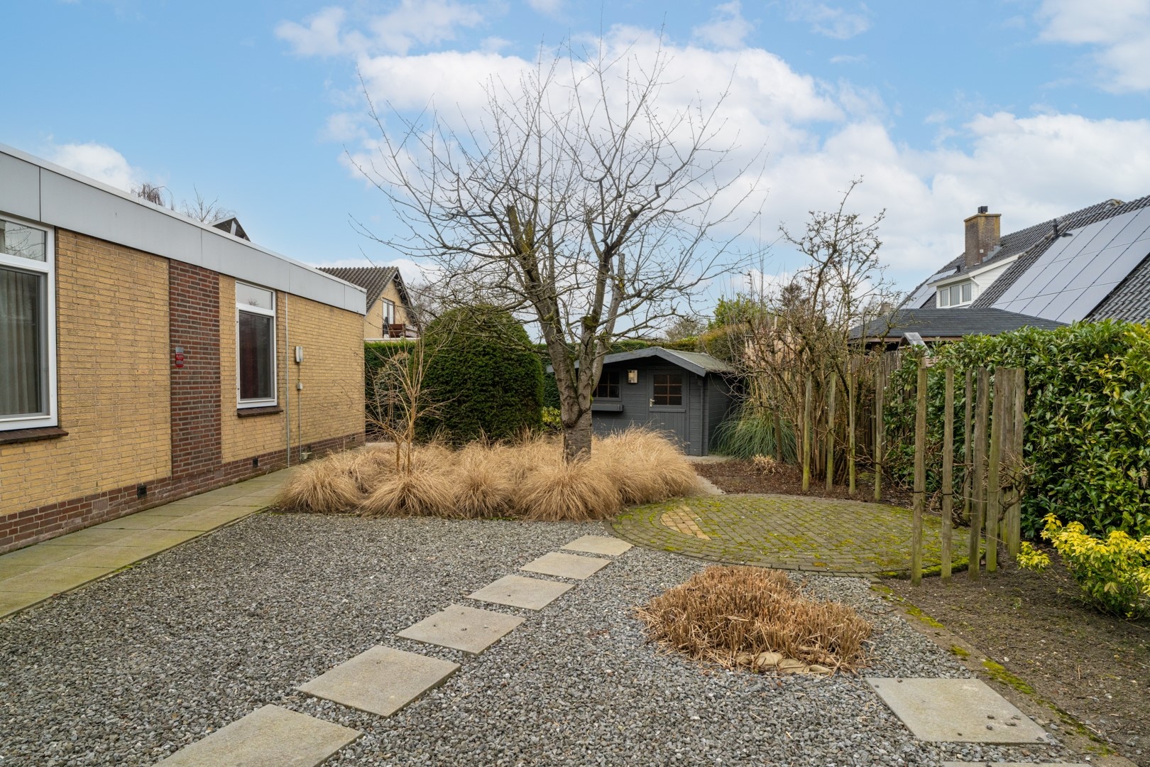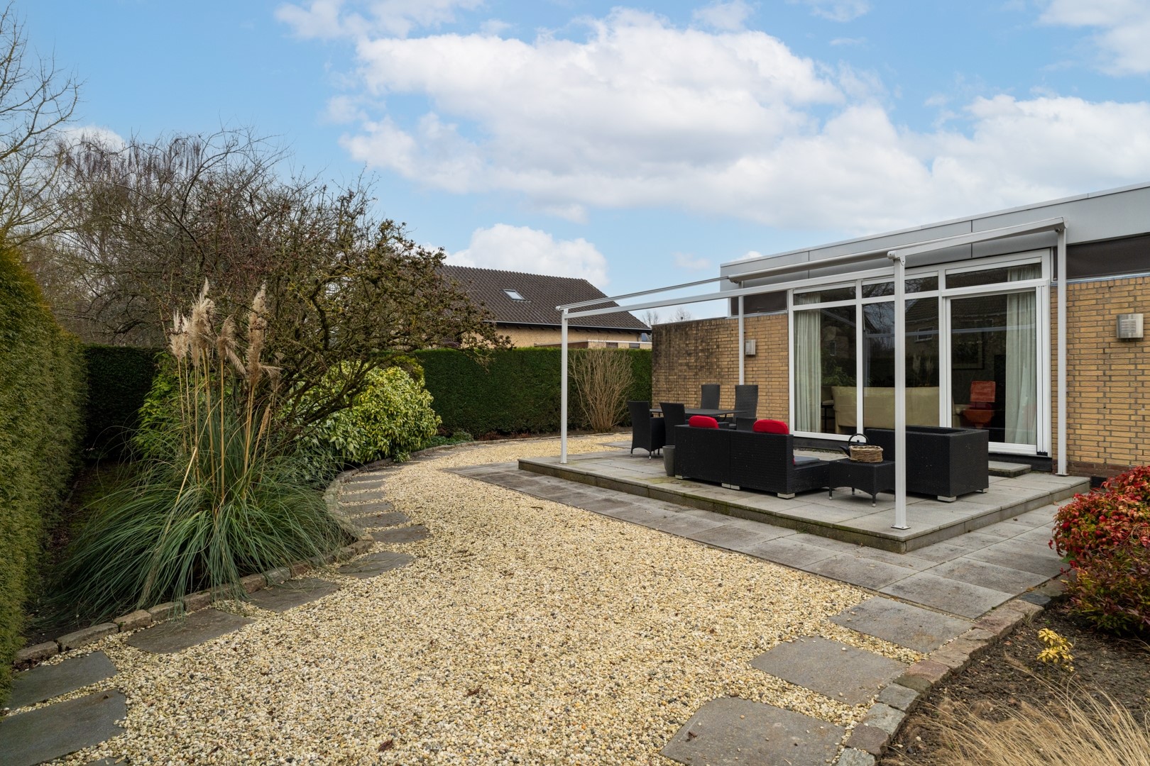 De fraai aangelegde tuin rondom de woning past perfect bij het royale perceel van ruim 1.000 m². Of je nu zon of schaduw zoekt, er is altijd een fijne plek te vinden. Via schuifpuien in de woonkamer en één van de slaapkamers bereik je de zonneterrassen. In totaal zijn er vier terrassen aanwezig. Daarnaast beschikt de tuin over een tuinhuis met separate houtopslag en is er aan de garage een houten fietsenstalling gebouwd. Rust en privacy staan hier centraal. Aan de voorzijde is er volop parkeergelegenheid én de mogelijkheid om te laden op eigen terrein.
