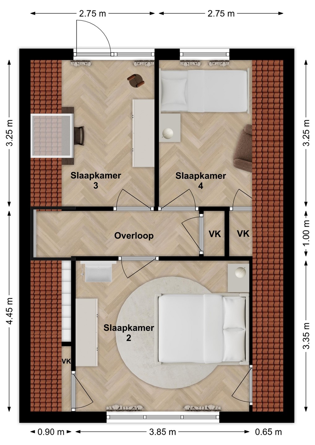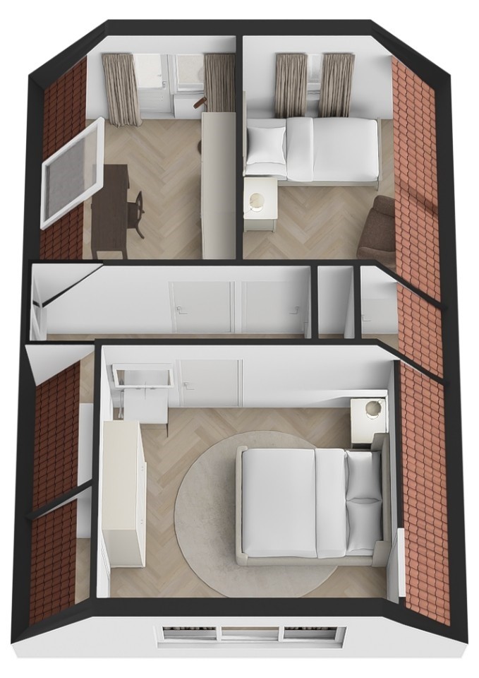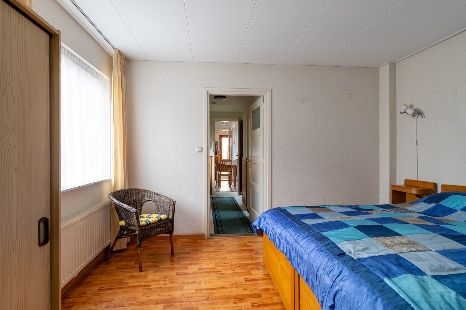 Op de begane grond bevindt zich een grote slaapkamer en een wat gedateerde maar ruime badkamer. Gelijkvloers wonen? Dat kan hier dus gewoon. Ook is er op de uitbouw een zolder gemaakt, die ook te gebruiken is als extra slaapkamer. Boven vind je nog eens drie royale slaapkamers met volop ruimte en bergruimte. Met in totaal vier slaapkamers is dit ook een uitstekende gezinswoning. De badkamer beneden is ruim, functioneel en… opvallend groen. Voorzien van ligbad, douche en wastafel. Wie weet wordt het vanzelf weer hip — anders is vernieuwen natuurlijk ook een optie.
