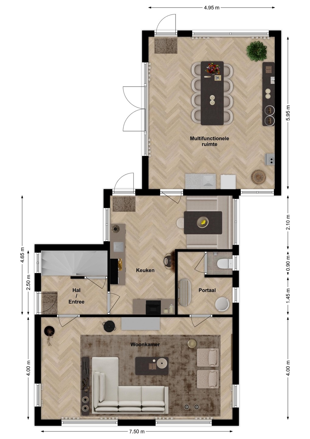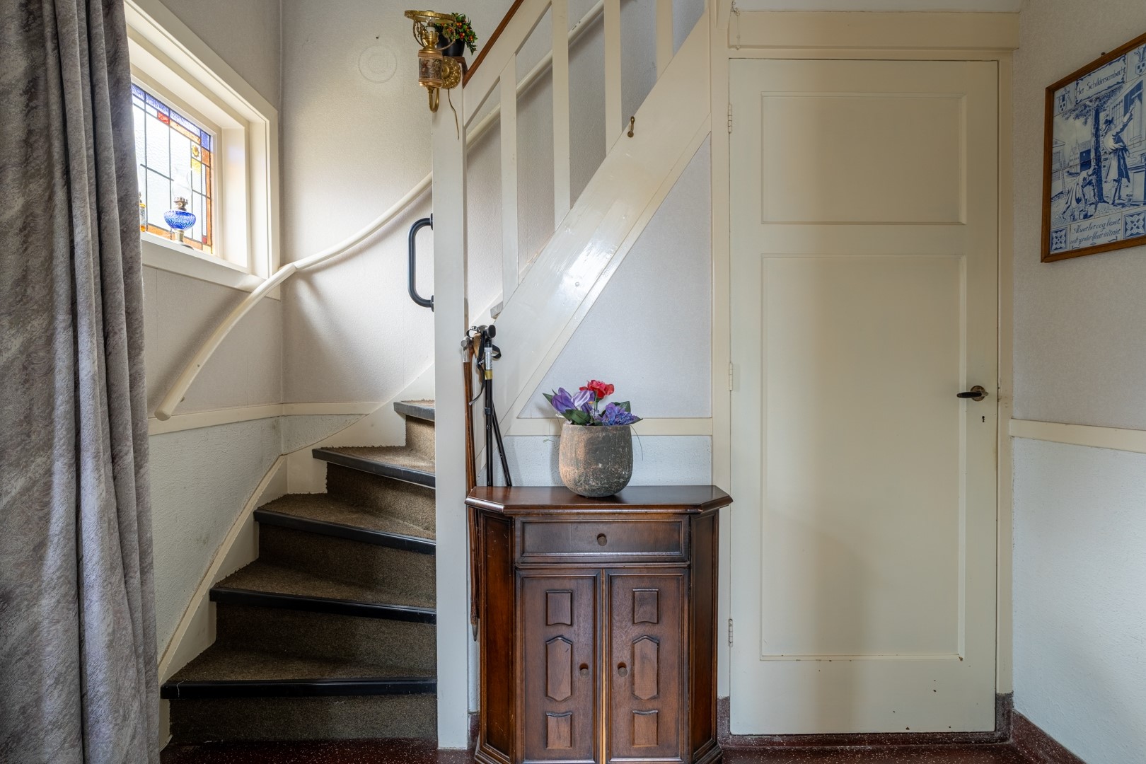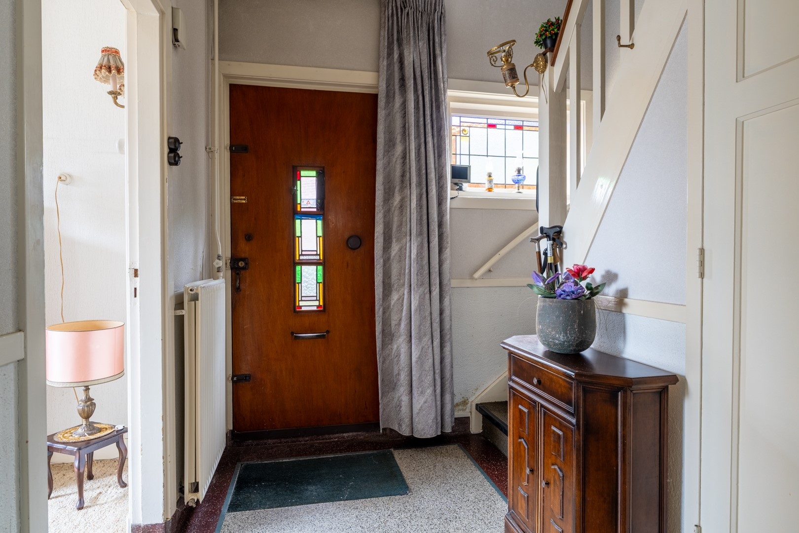 De entree bevindt zich in de zijgevel. Vanuit de hal heb je toegang tot de woonkamer, de keuken en de trap naar de eerste verdieping.