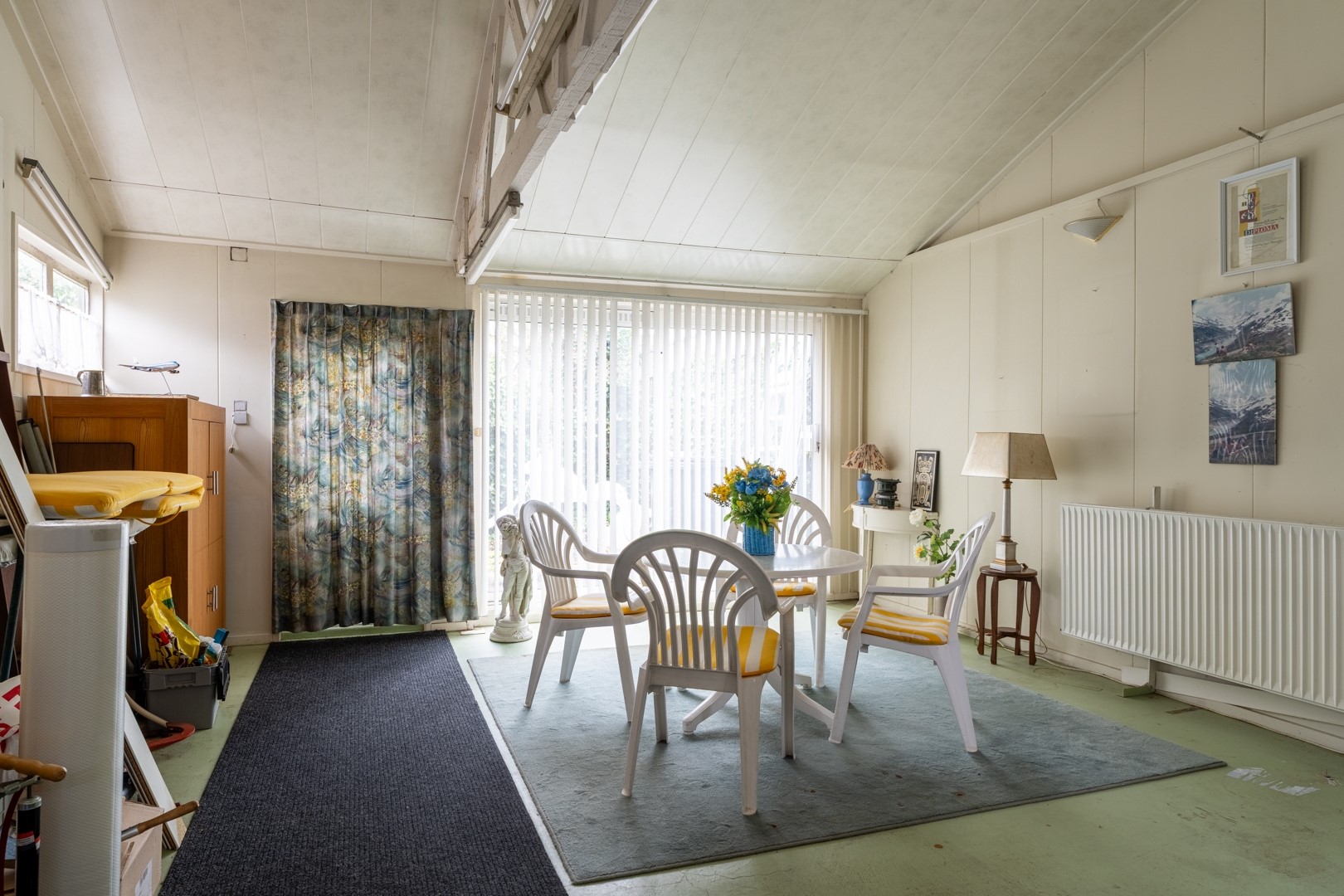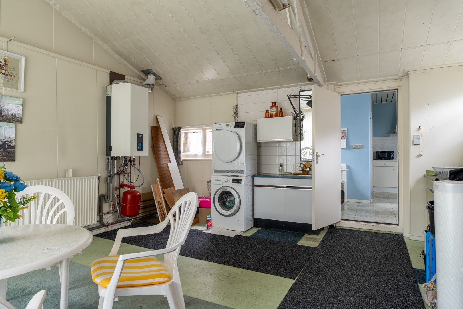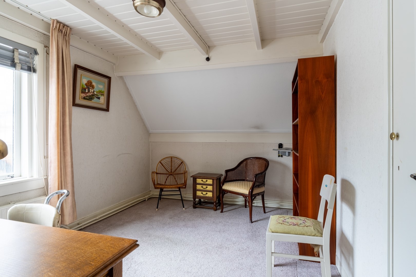 De woonkamer ligt aan de voorzijde van de woning en is een prettige ruimte met hoge plafonds en grote raampartijen. Dat betekent: veel licht, een fijne sfeer en een goede basis voor een eigentijdse make-over. Op de begane grond vind je verder een tussenportaal met toilet en aan de achterzijde de keuken. Deze keuken is gezellig en functioneel, maar duidelijk toe aan vernieuwing – ideaal dus voor wie al droomt van een nieuwe keukenopstelling. Aan de achterzijde is een royale uitbouw gerealiseerd. Je zou deze ruimte kunnen bestempelen als berging of schuur, maar dankzij de aanwezigheid van verwarming zien wij dit toch als volwaardige woonruimte. En ja, deze meters tellen dan ook mee in het woonoppervlak. Perfect als hobbyruimte, werkplek, speelkamer of misschien wel jouw toekomstige woonkeuken.