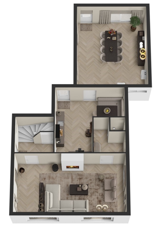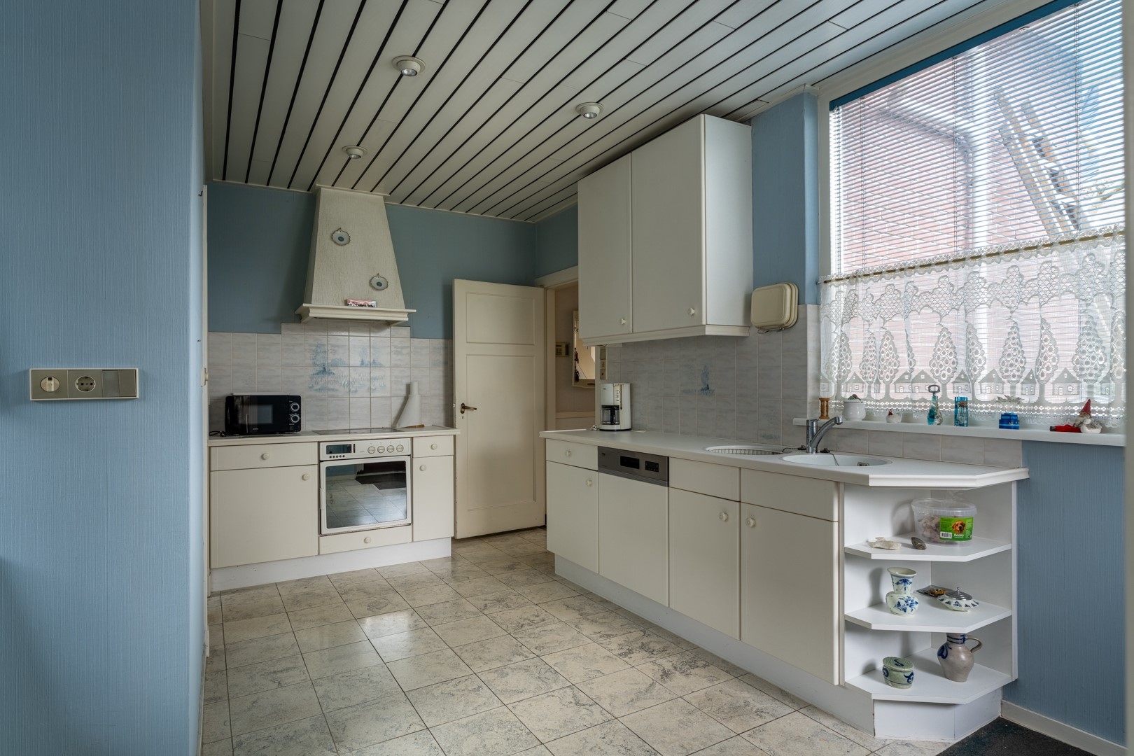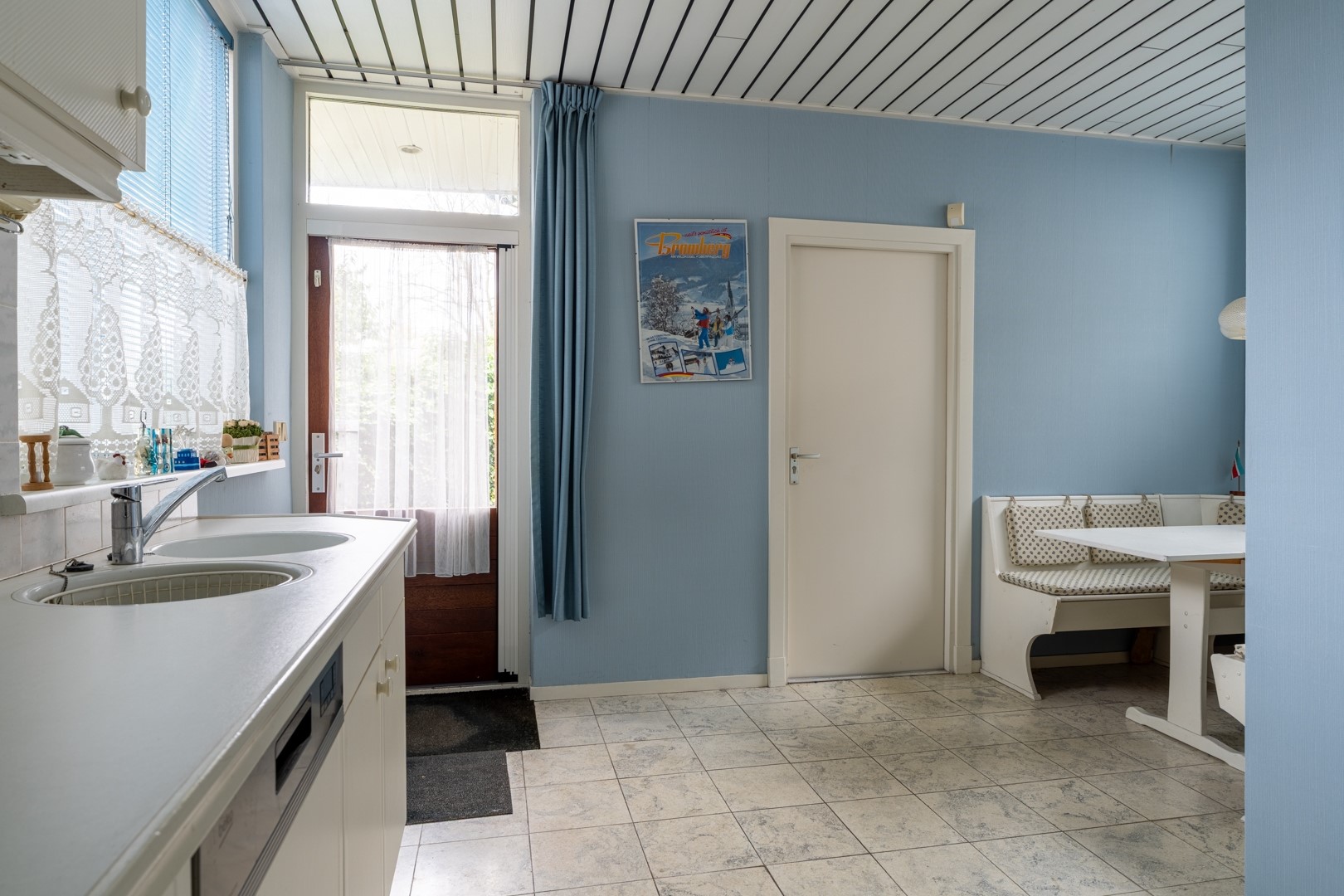 De woonkamer ligt aan de voorzijde van de woning en is een prettige ruimte met hoge plafonds en grote raampartijen. Dat betekent: veel licht, een fijne sfeer en een goede basis voor een eigentijdse make-over. Op de begane grond vind je verder een tussenportaal met toilet en aan de achterzijde de keuken. Deze keuken is gezellig en functioneel, maar duidelijk toe aan vernieuwing – ideaal dus voor wie al droomt van een nieuwe keukenopstelling. Aan de achterzijde is een royale uitbouw gerealiseerd. Je zou deze ruimte kunnen bestempelen als berging of schuur, maar dankzij de aanwezigheid van verwarming zien wij dit toch als volwaardige woonruimte. En ja, deze meters tellen dan ook mee in het woonoppervlak. Perfect als hobbyruimte, werkplek, speelkamer of misschien wel jouw toekomstige woonkeuken.