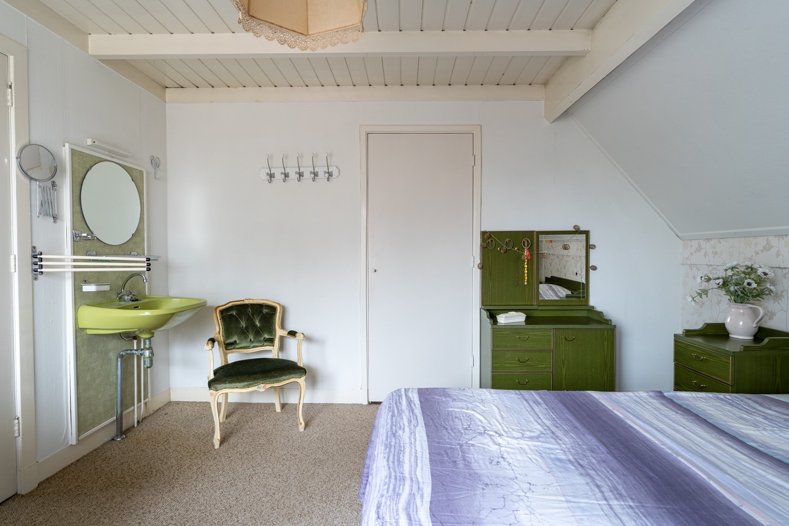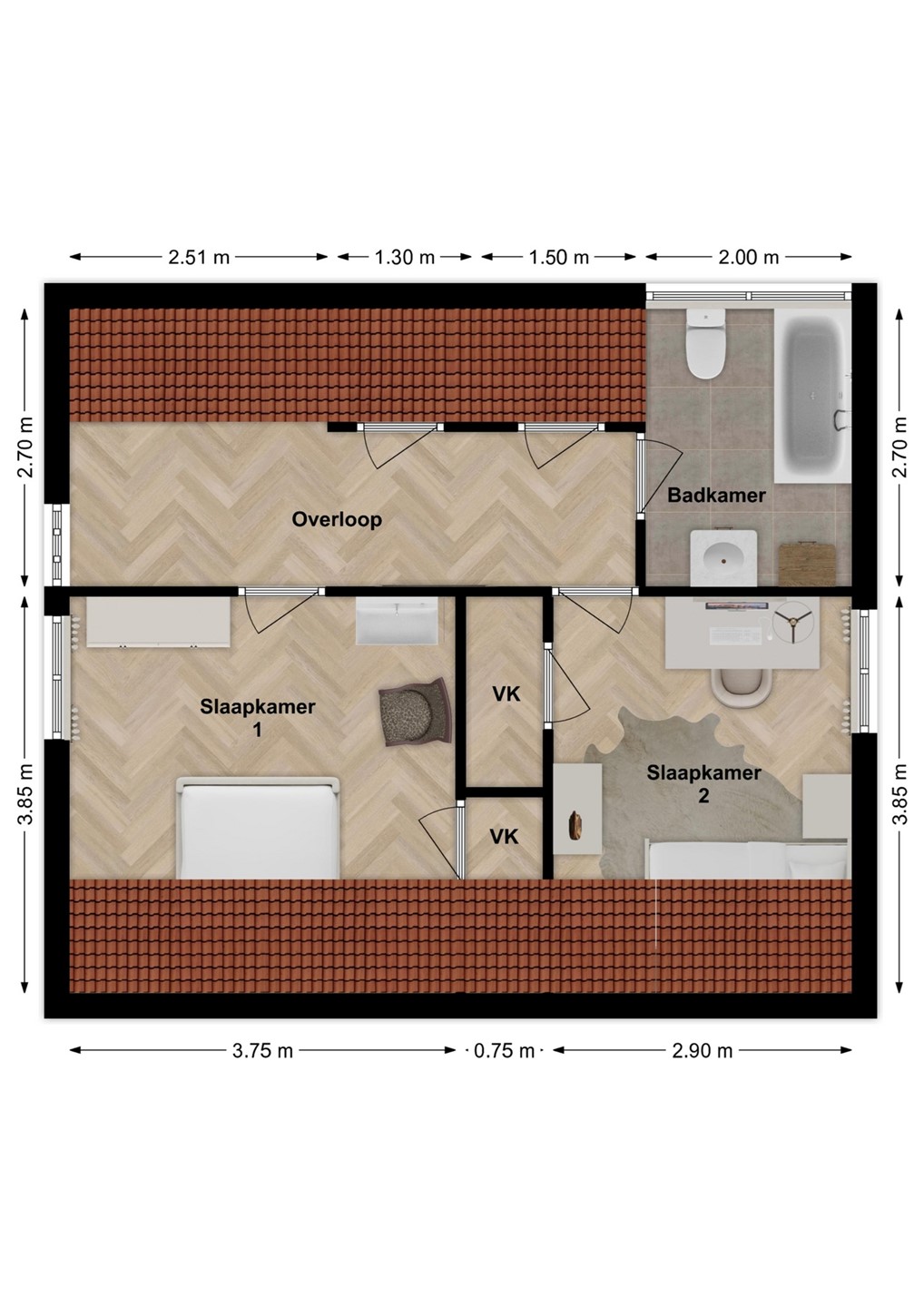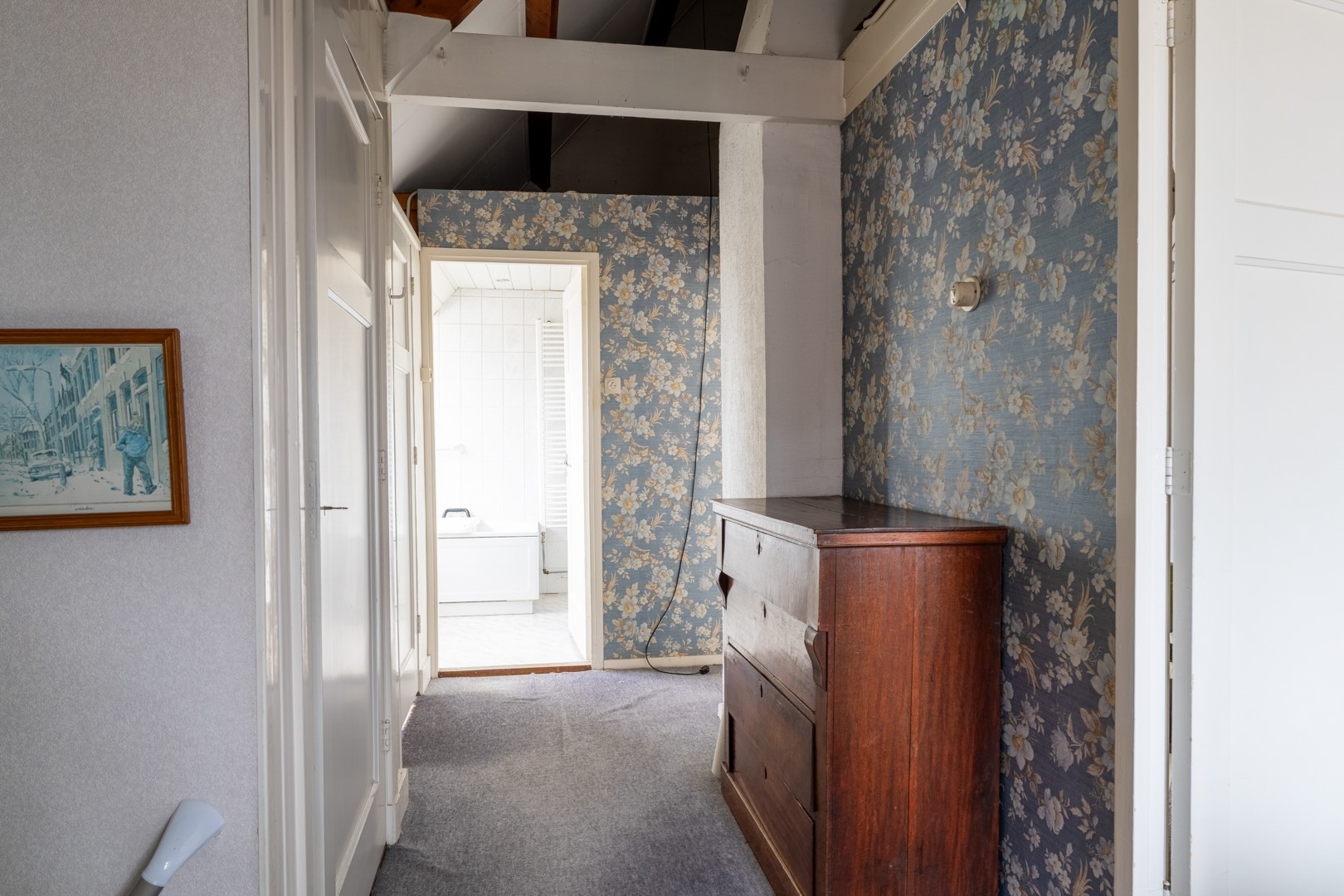 Op de eerste verdieping bevinden zich twee ruime slaapkamers en een royale badkamer. De badkamer is voorzien van een ligbad, toilet en wastafelmeubel. Niet modern, wel functioneel – prima om te gebruiken totdat je besluit dat het tijd is voor een frisse upgrade.