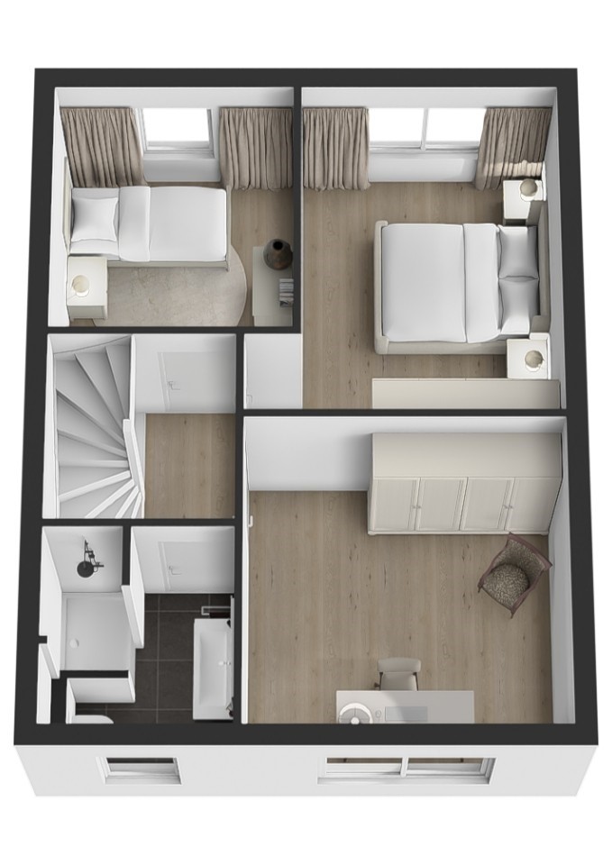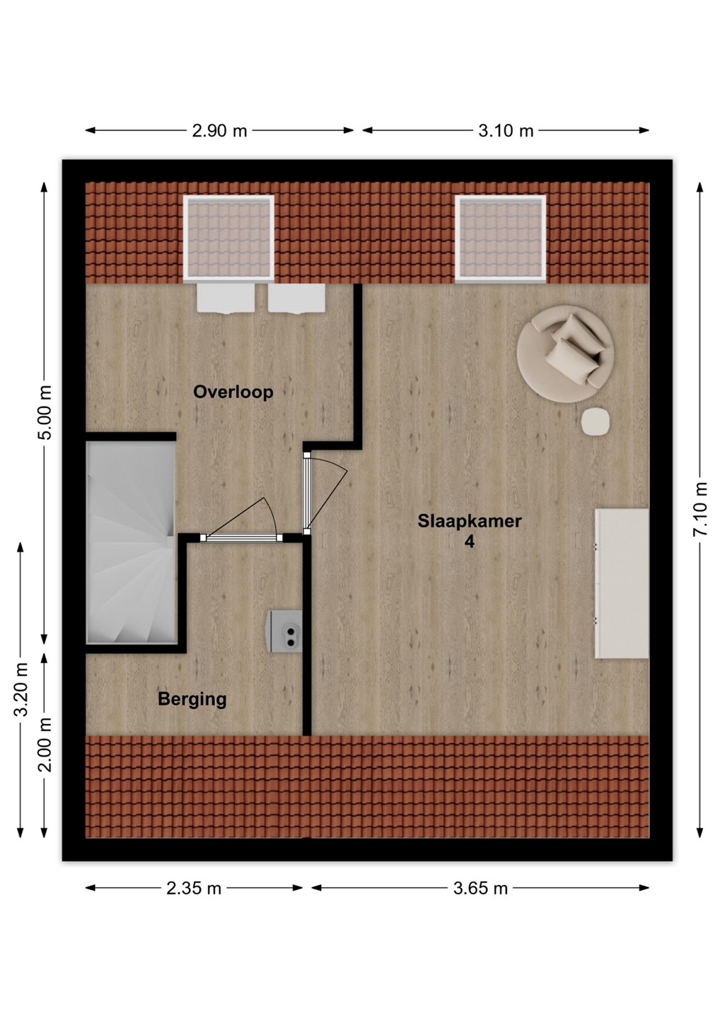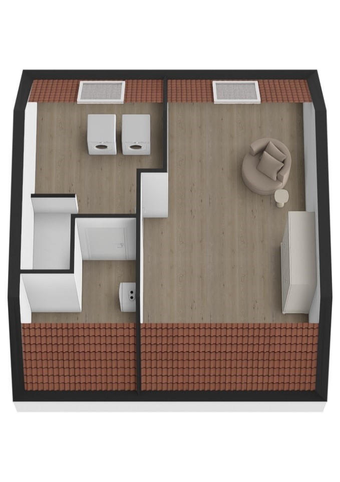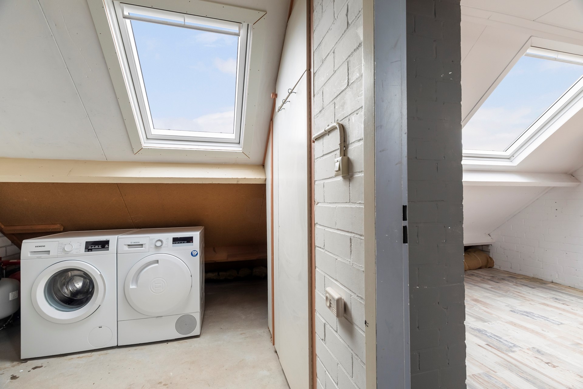 De tweede verdieping verrast met een overloop en een ruime vierde slaapkamer — ideaal als master bedroom, werkruimte of tienerkamer. Op de overloop bevinden zich de cv-opstelling, de luchtwarmtepomp en de unit voor mechanische ventilatie, netjes uit het zicht maar technisch helemaal bij de tijd.