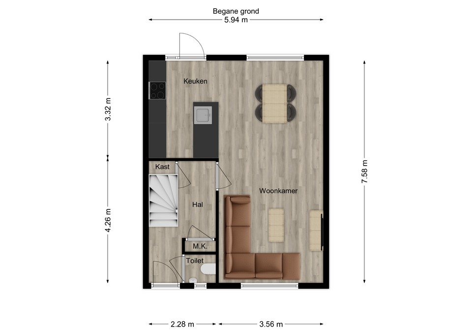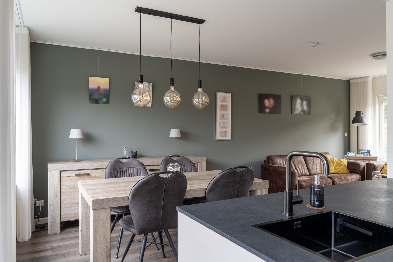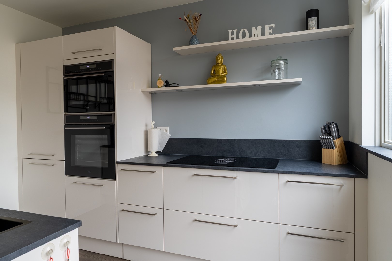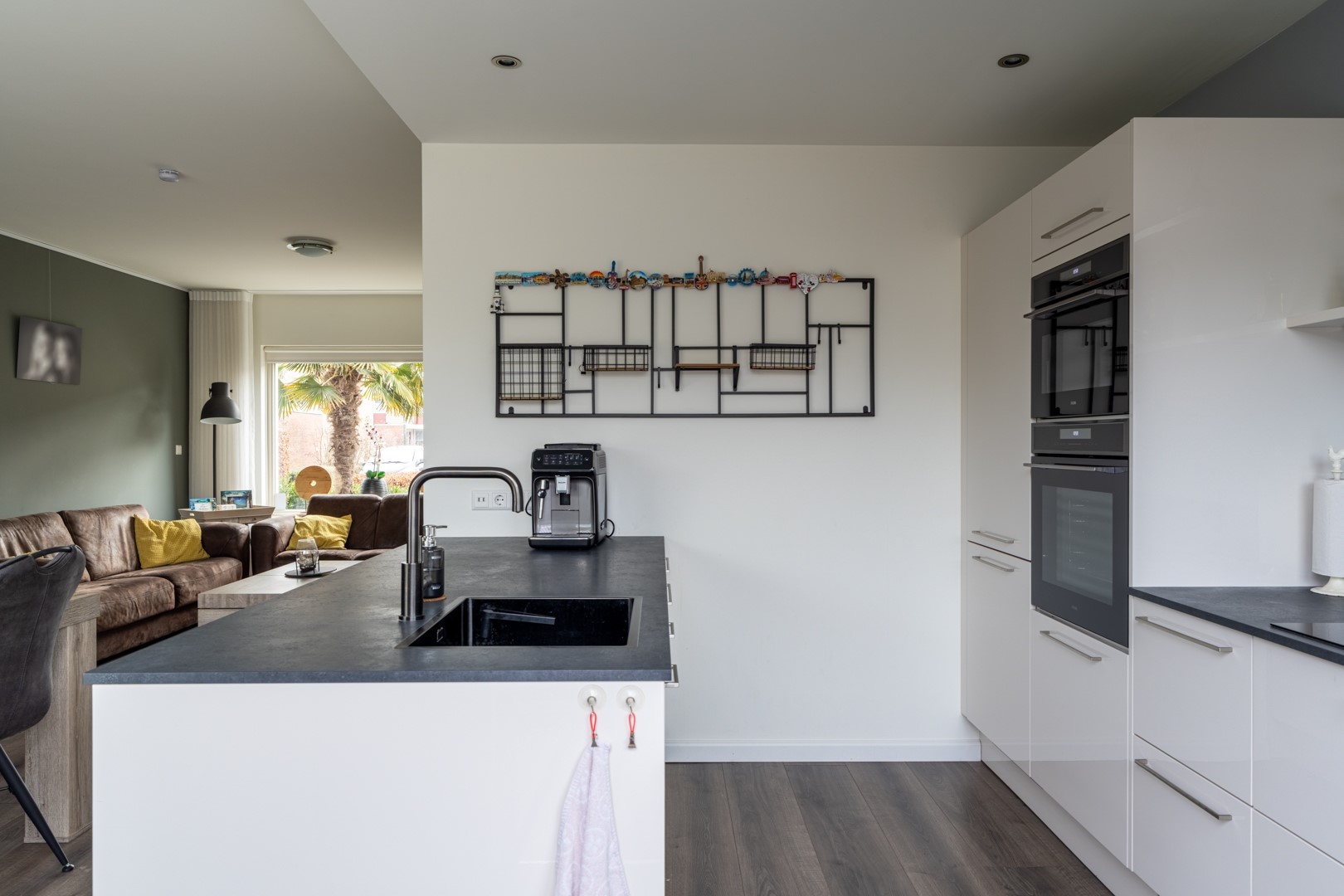 Overkapte entree, hal met meterkast, toilet, provisiekast en de trapopgang naar de verdieping, middels een leuke taats/ glasdeur is de ruime woonkamer bereikbaar, aansluitend de moderne openkeuken met dubbele opstelling en eiland voorzien van inbouwapparatuur waaronder inductiekookplaat met integrale afzuigkap, oven, combimagnetron, koelkast en vriezer tevens de loopdeur naar de achtertuin.