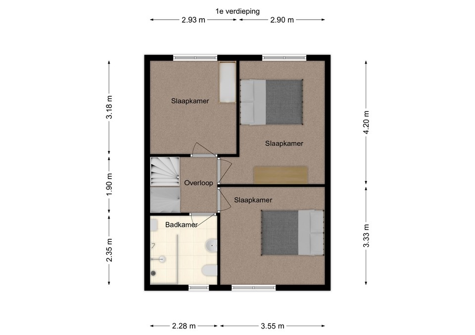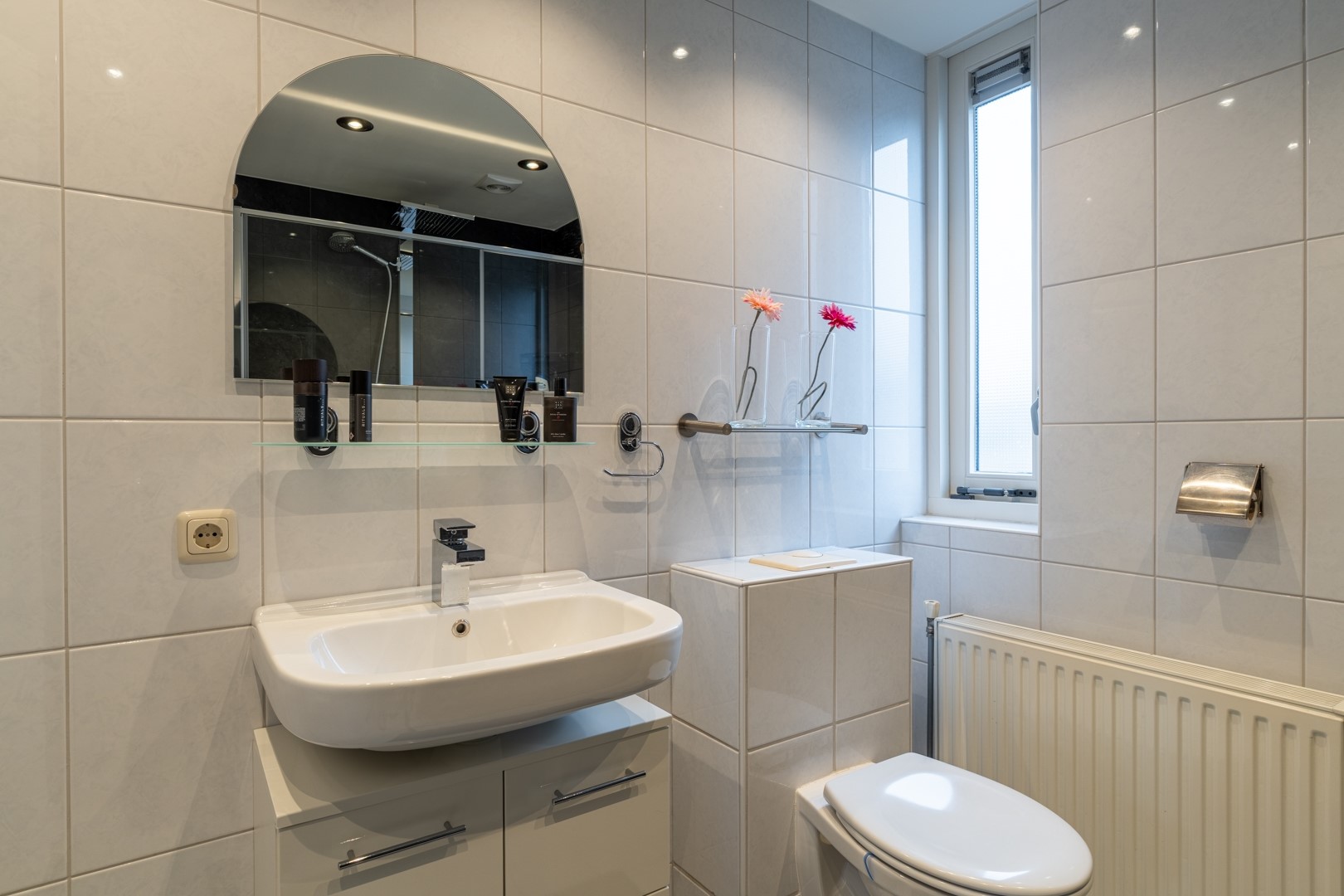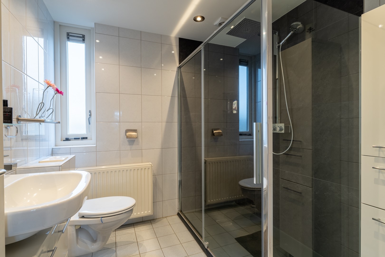 Overloop met vaste trapopgang naar de 2de verdieping, 3 slaapkamers waarvan 1 voorzien van airco en een ruime badkamer met inloopdouche, wastafelmeubel, extra closet (2de toilet) en radiator. De badkamer is van natuurlijke en mechanische ventilatie voorzien.