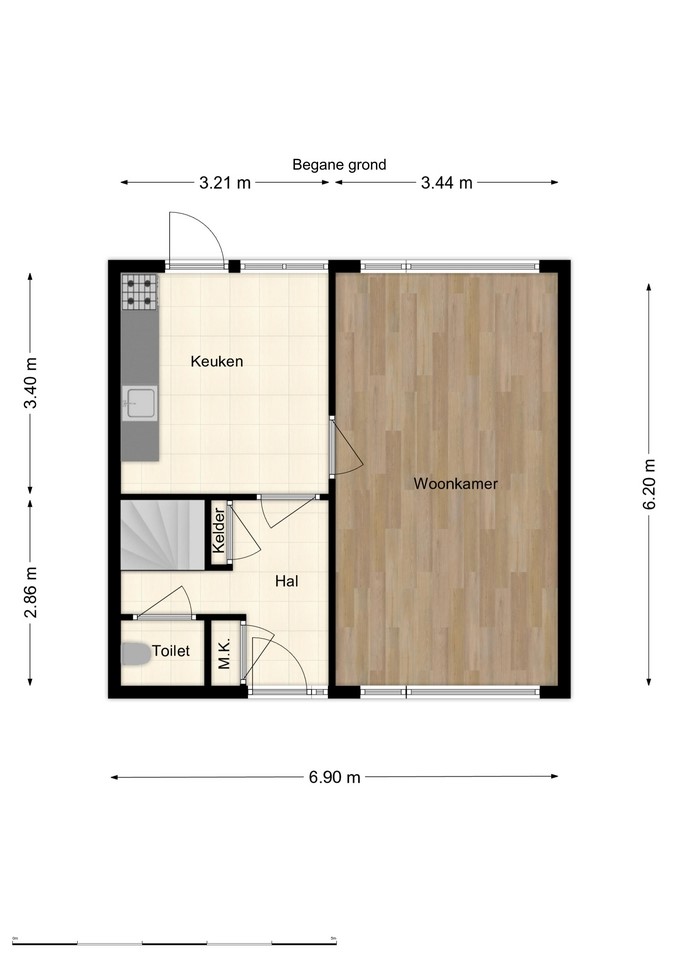 Hal met provisiekast, trapopgang en toilet, woonkeuken ingedeeld met rechte opstelling en aanbouw met loopdeur naar het terras en achtertuin en aangrenzend een ruime ‘doorzon’ woonkamer.