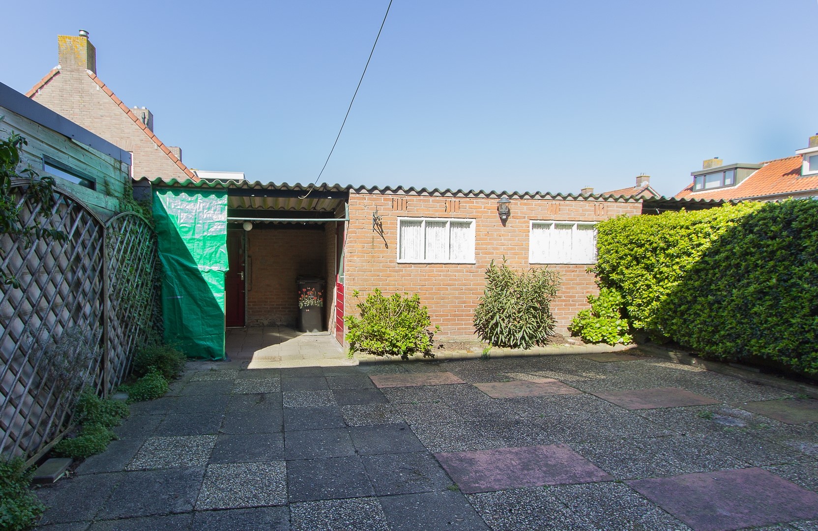 De omsloten achtertuin met terras is onderhoudsvriendelijk ingedeeld. Tegen de stenen berging is een overkapping gecreëerd met een poort naar de brandgang.