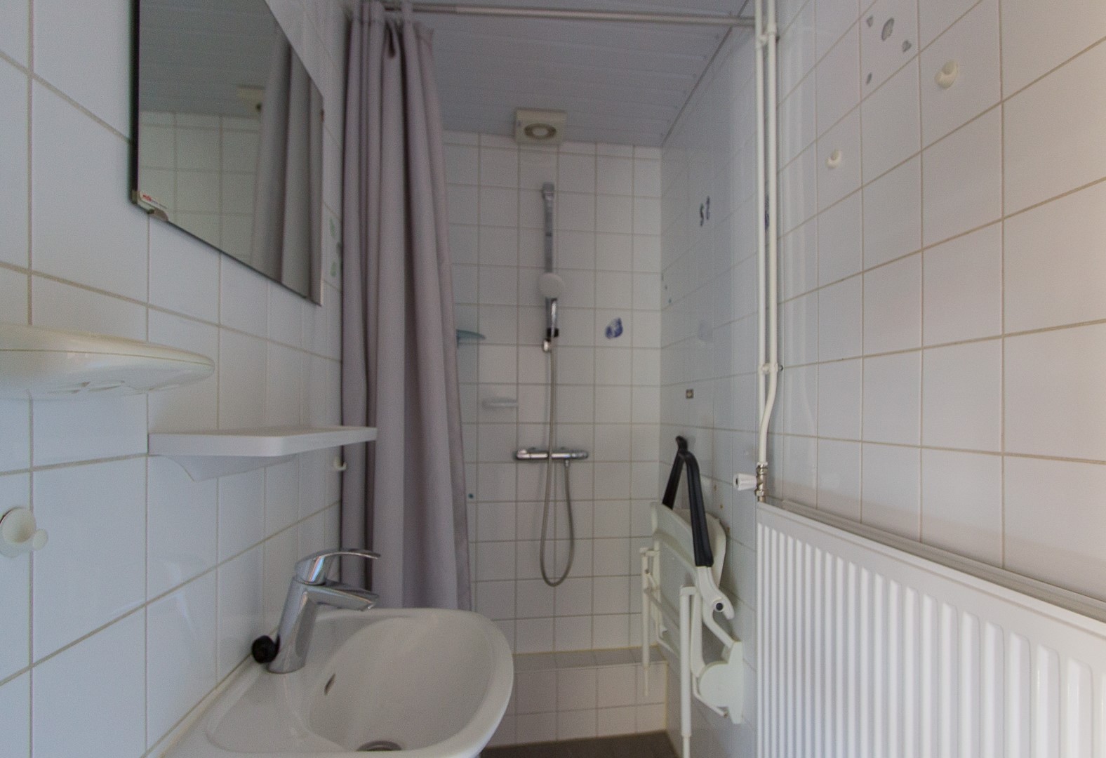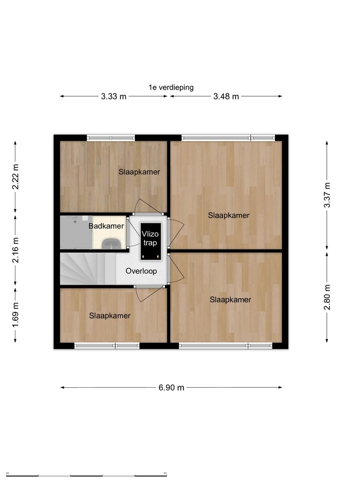 Overloop, 4 slaapkamers en een badkamer ingedeeld met douche en wastafel.