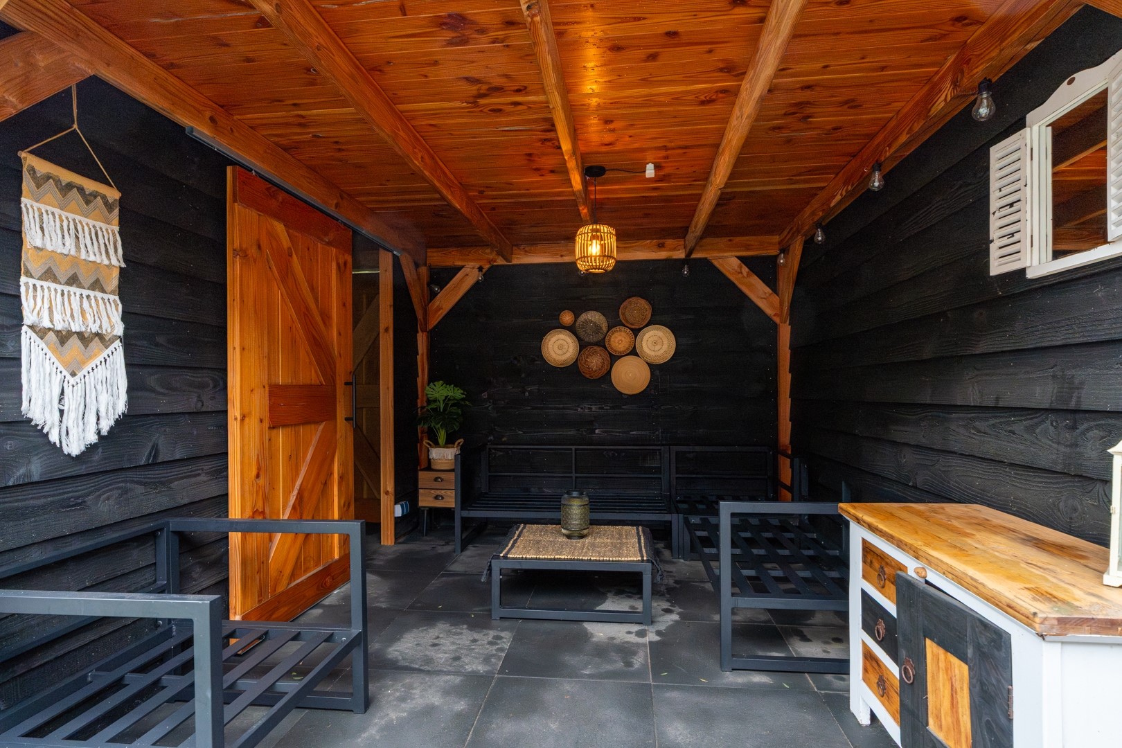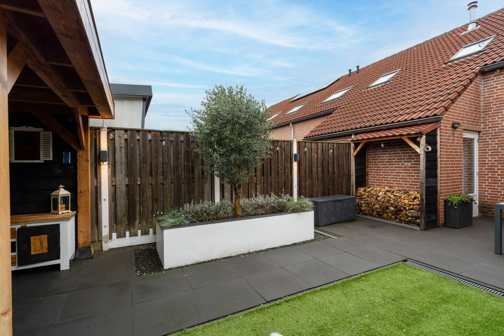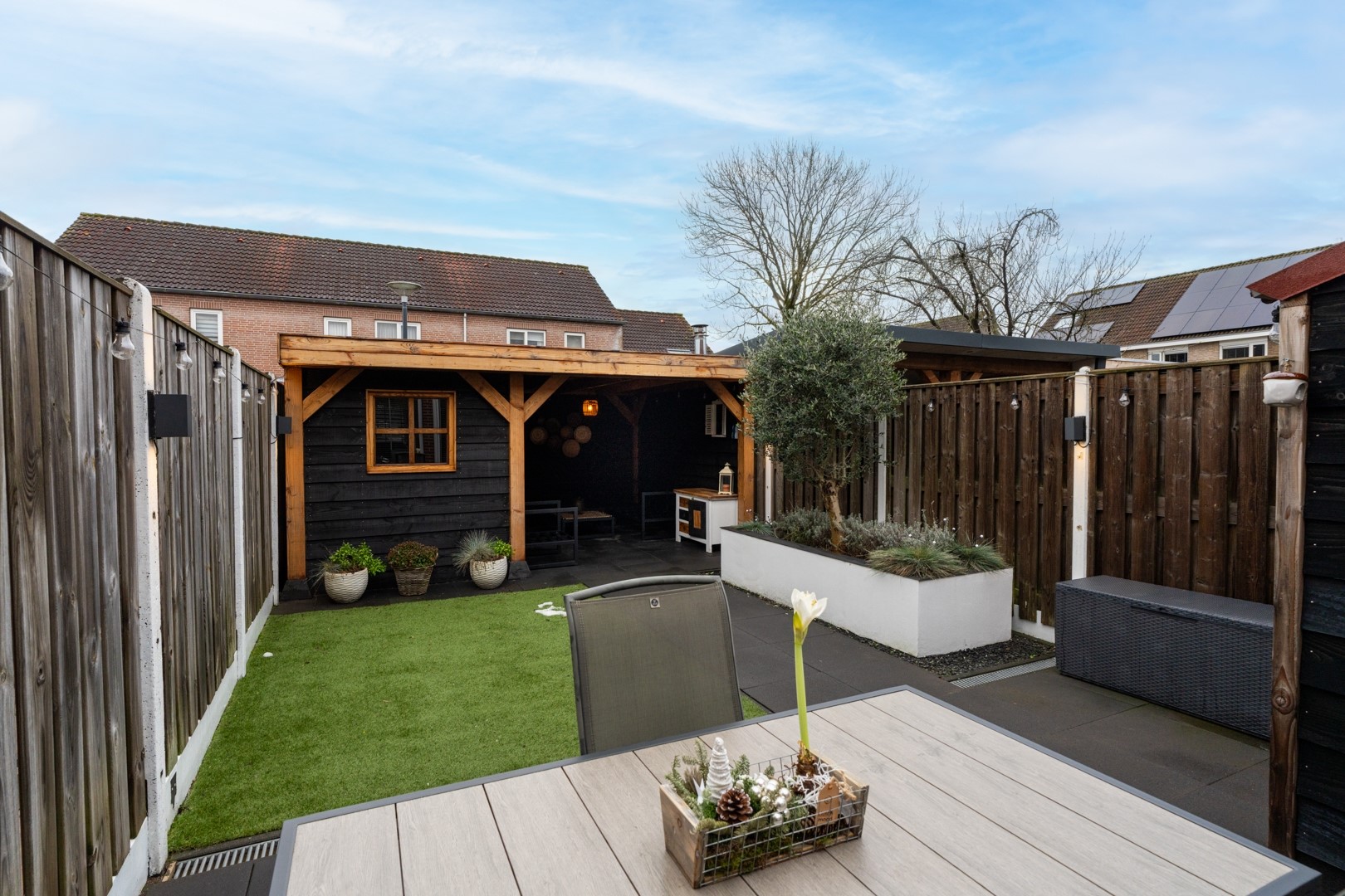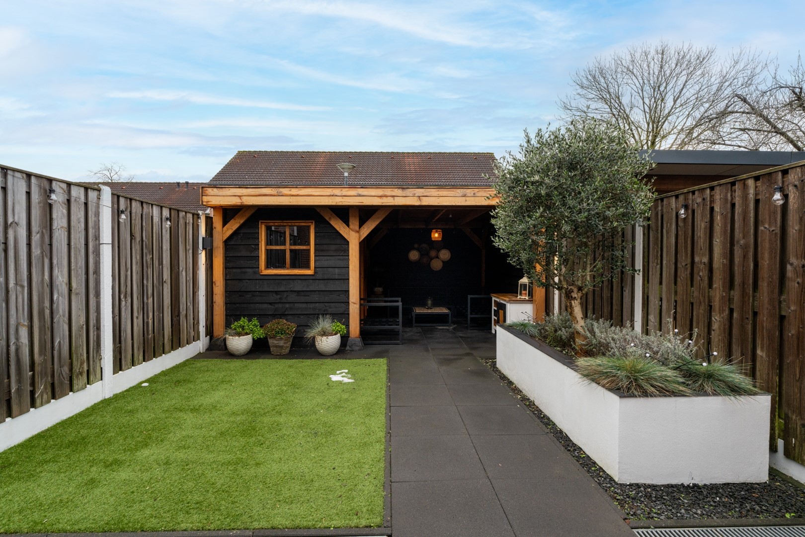 De voortuin is ingedeeld met sierbestrating. De omsloten achtertuin op het zonnige zuiden is in 2020 gemoderniseerd en onderhoudsvriendelijk ingedeeld met luxe overkapping met berging, terras, sierbestrating, gazon en plantenborders. Tegen de achtergevel van de woning is een leuke maar ook praktische houtopslag gecreëerd. Middels de achterom poort in de berging is de achtergelegen brandgang bereikbaar. In de straat bevindt zich verder voldoende openbare parkeergelegenheid.