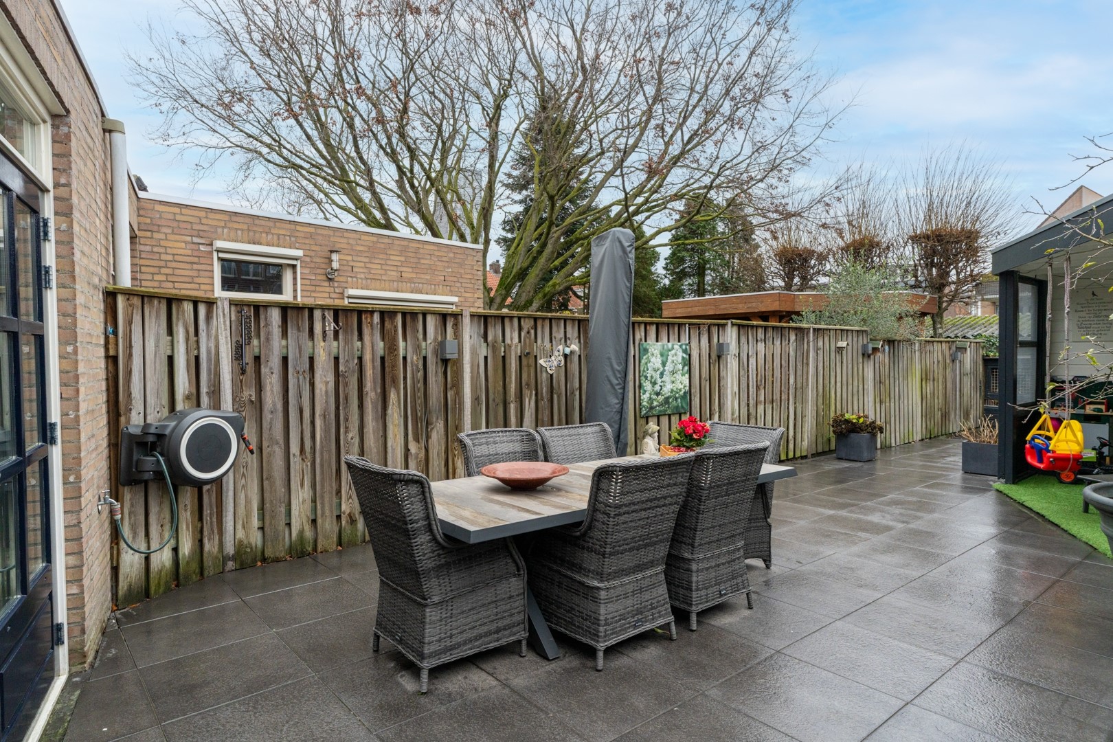 De omsloten diepe achtertuin met eigen achterom is onderhoudsvriendelijk ingedeeld met sierbestrating en diversen bergingen. Achterop het perceel de originele berging (circa 2m x 3m) en de achterom poort naar de achtergelegen brandgang. Diversen gebouwen kunnen in overleg achterblijven of afgebroken worden. Tevens een fijne overkapping.