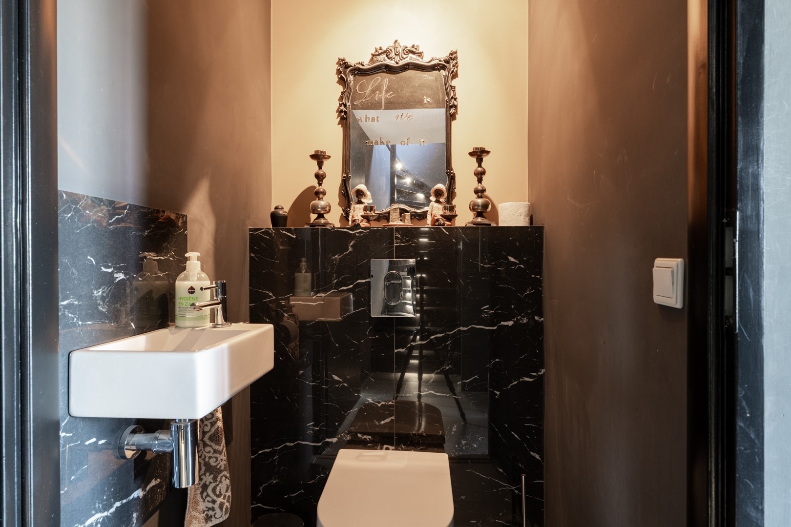De begane grond is afgewerkt met een moderne tegelvloer met comfortabele vloerverwarming. Via de hal met toilet, meterkast en verlichte trapopgang bereikt u de leefruimte met open keuken. De luxe keuken is voorzien van hoogwaardige inbouwapparatuur, waaronder een inductiekookplaat met geïntegreerd afzuigsysteem, Quooker, magnetron, oven, stoomoven, vaatwasser en maar liefst twee koel-vriescombinaties. Via de schuifpui heeft u direct toegang tot de fraai aangelegde achtertuin met kunstgras en een stijlvolle overkapping.