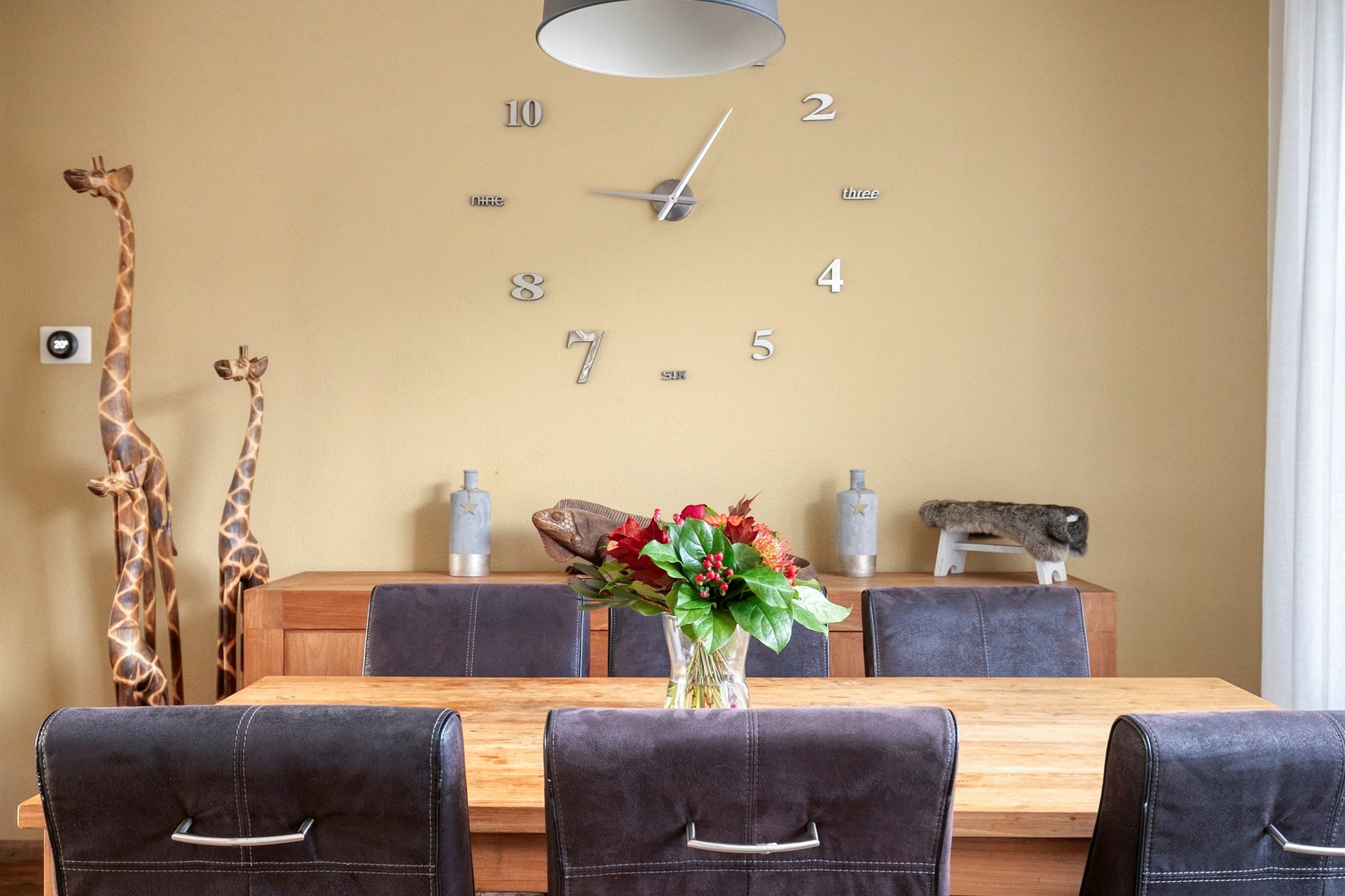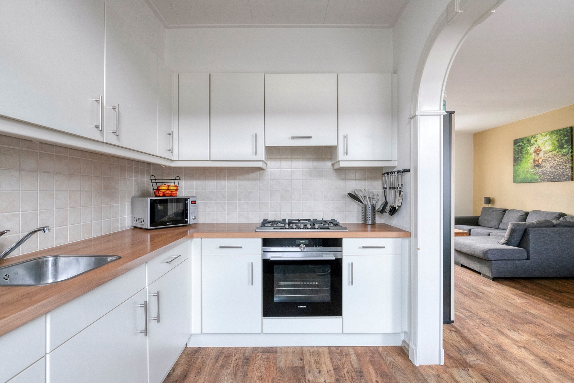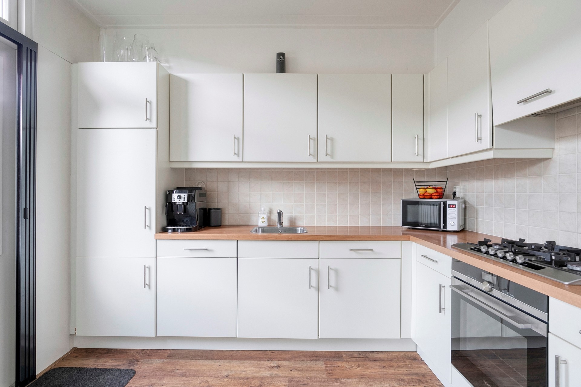 De keuken is praktisch ingericht en van alle gemakken voorzien: 5-pits gaskookplaat, afzuigkap, oven, koelkast, vaatwasser én een deur naar de tuin. Of je nu snel iets opwarmt of uitgebreid staat te koken – hier is het gewoon fijn werken. Alles wat je nodig hebt, zit er al in.