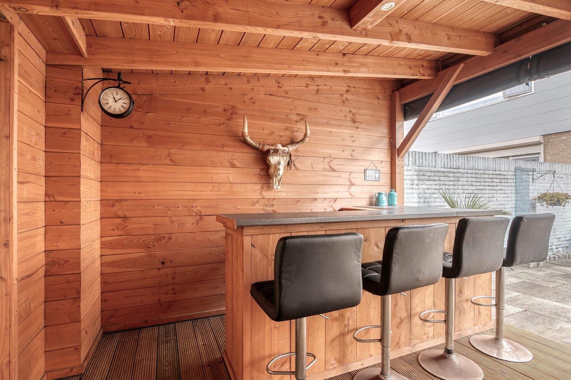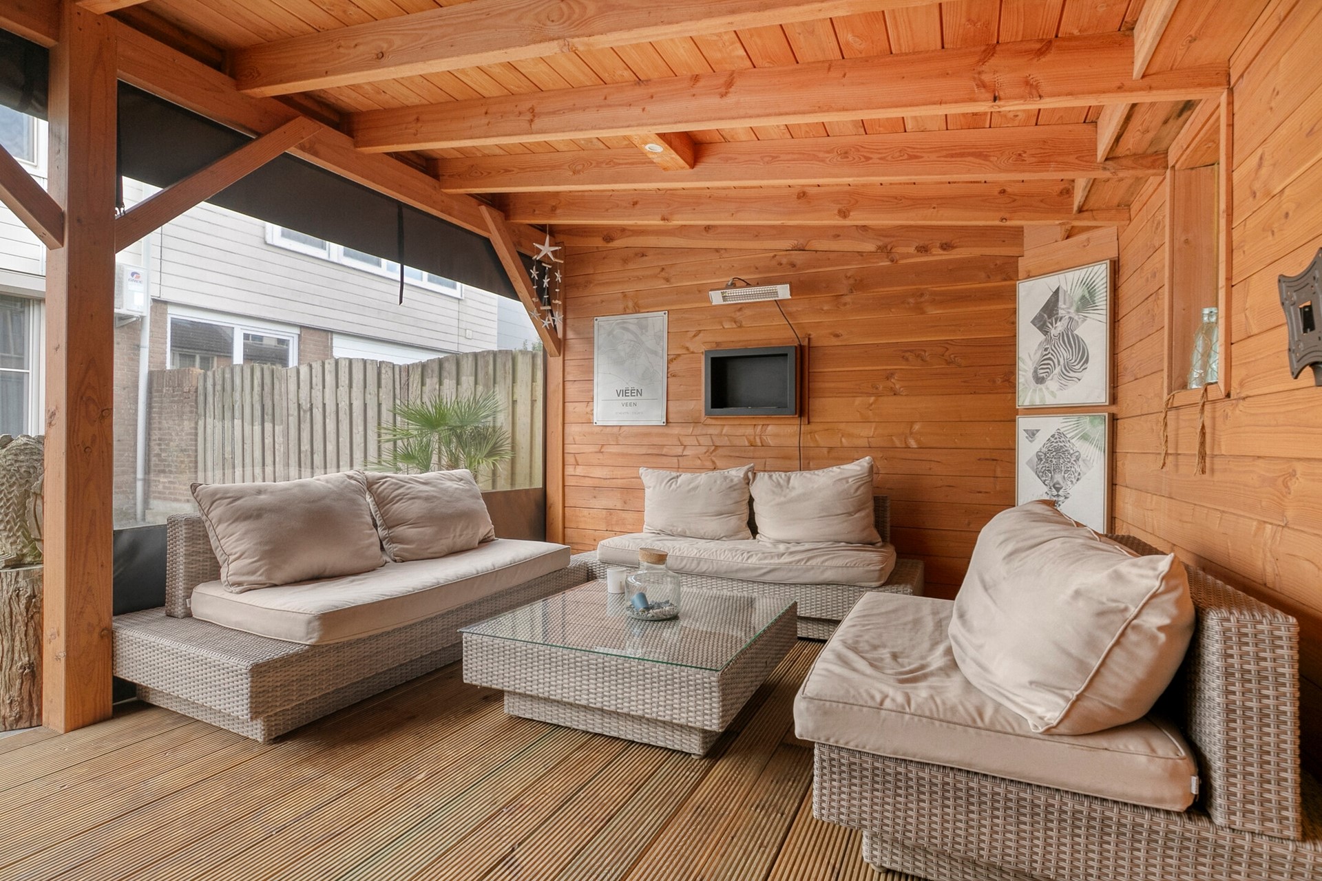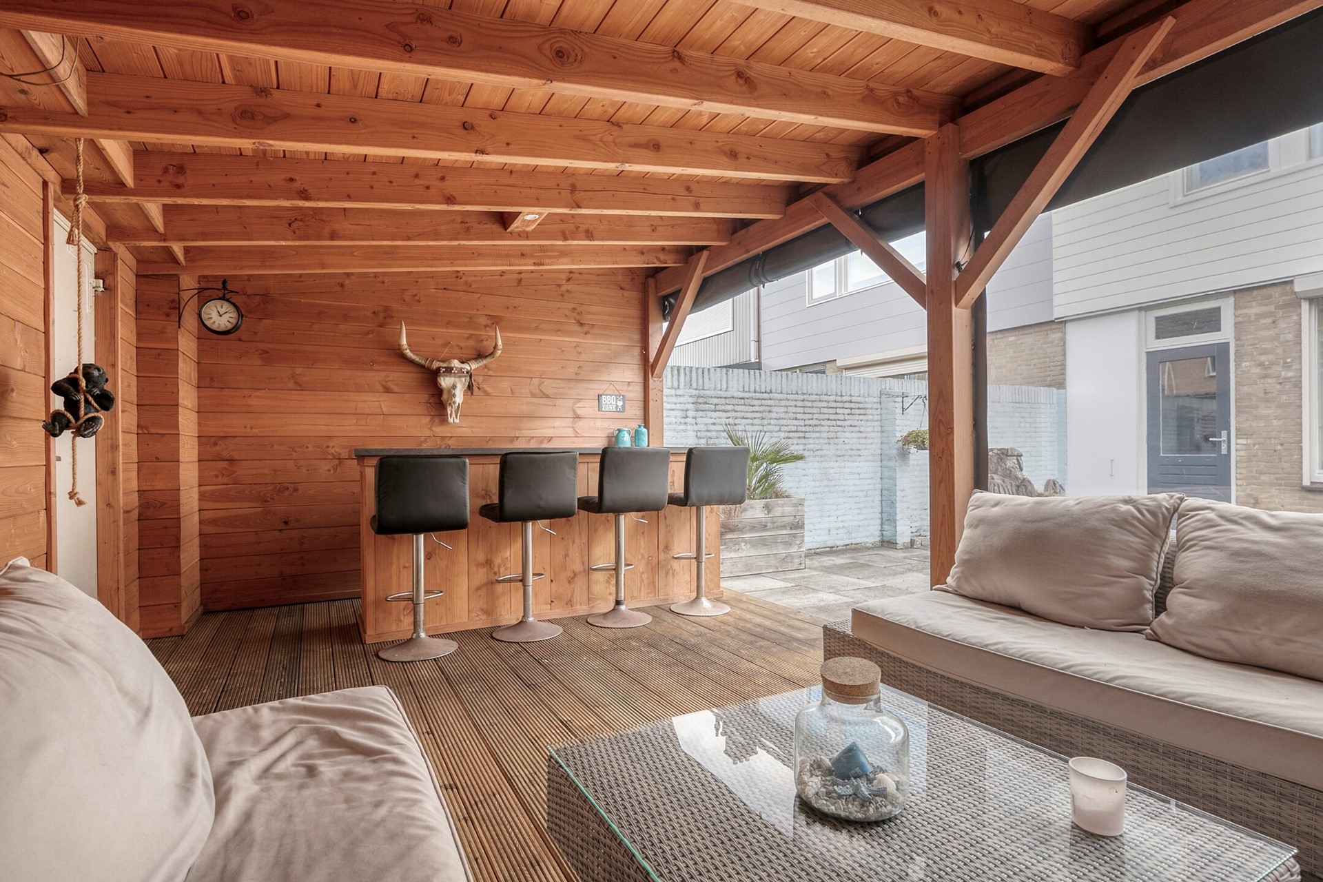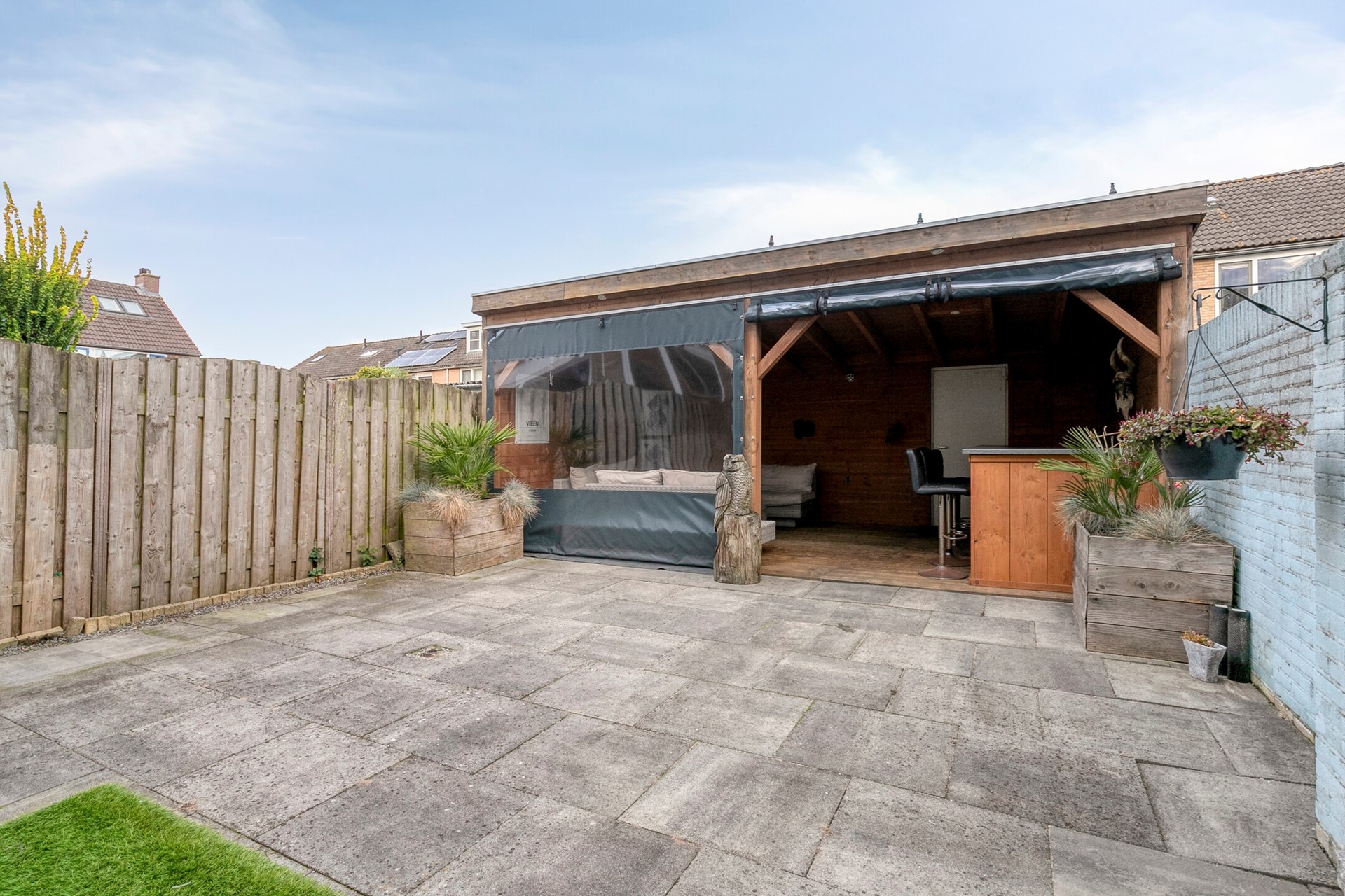 De achtertuin is echt een pareltje. Gelegen op het westen, dus volop middag- en avondzon. Achterin vind je een grote berging met elektra – handig voor fietsen, klusspullen of je hobbyprojecten. En dan die overkapping… ruim, modern en voorzien van elektra, heater en een gezellige bio-ethanol haard. Zie het als je tweede woonkamer, maar dan buiten. Hier zit je het hele jaar door goed – met een wijntje, boek of barbecue.