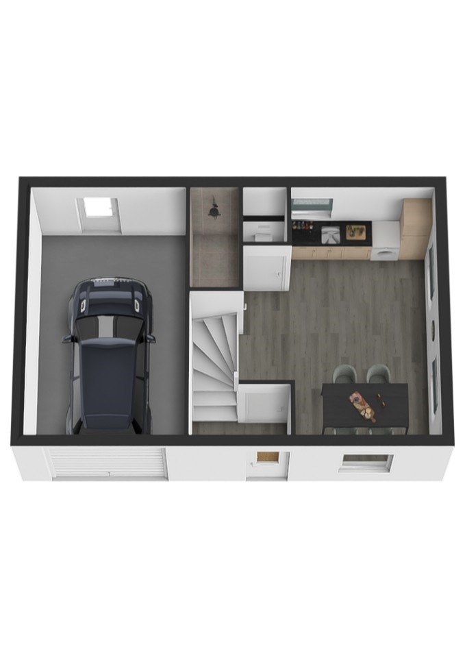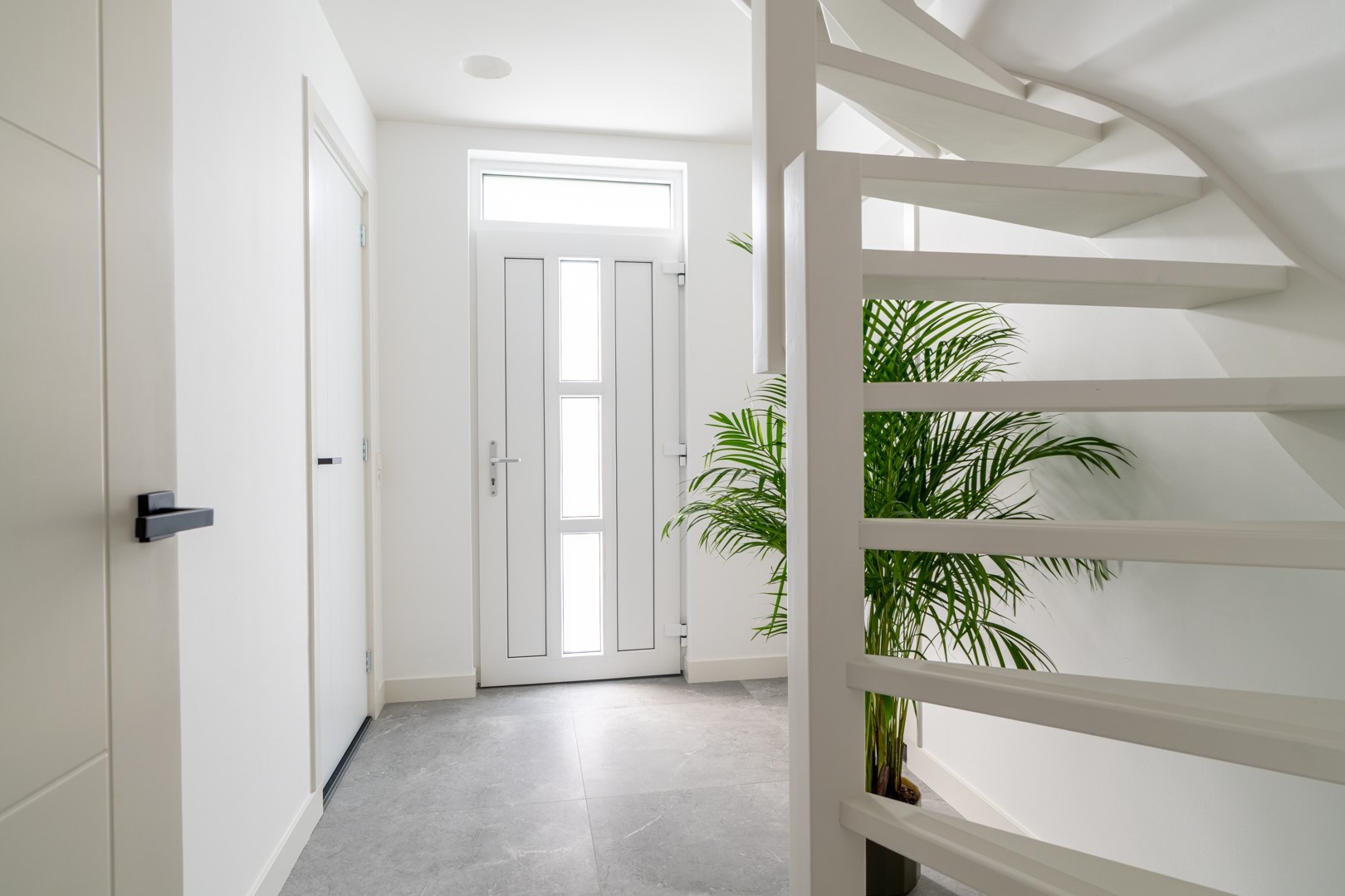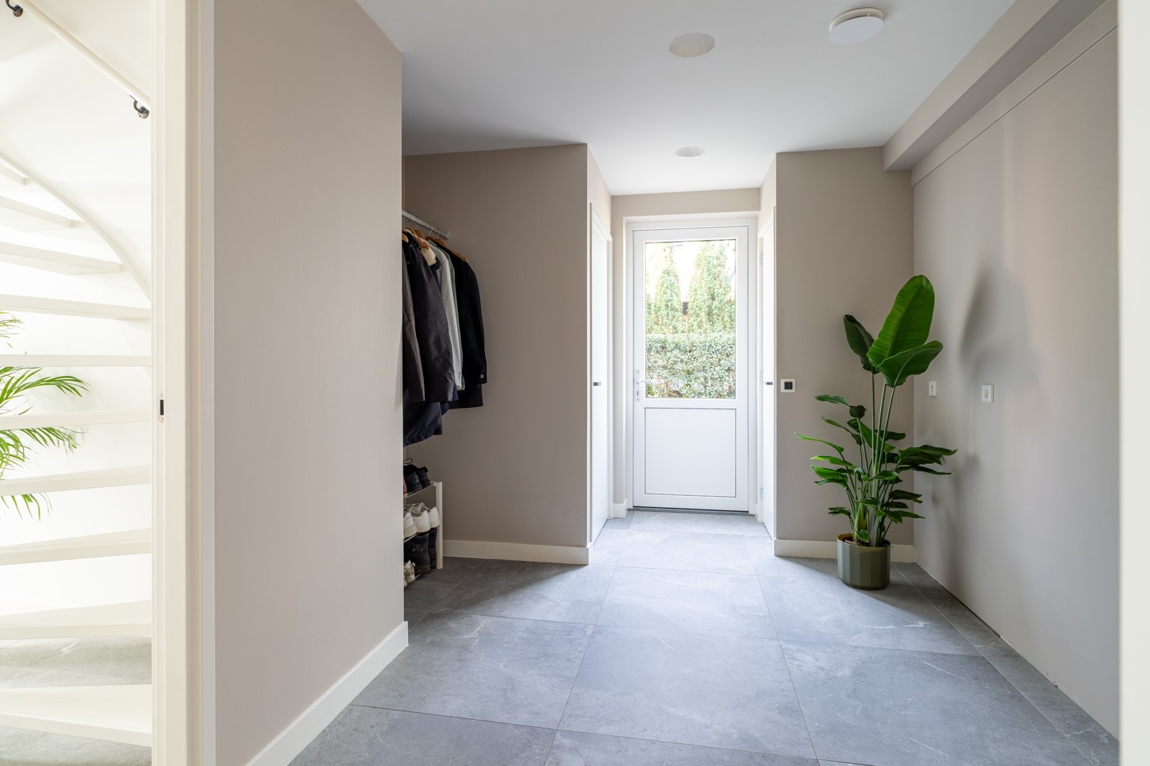 De ontvangsthal bevindt zich aan de voorzijde van de woning. Vanuit hier heb je toegang tot de bijkeuken en de badkamer. Via een vaste trap bereik je de verdieping. De woonkamer ligt aan de voorzijde van het huis en voelt knus en gezellig aan. Een fijne plek om rustig te ontspannen, terwijl de woonkeuken het levendige middelpunt van de woning vormt.