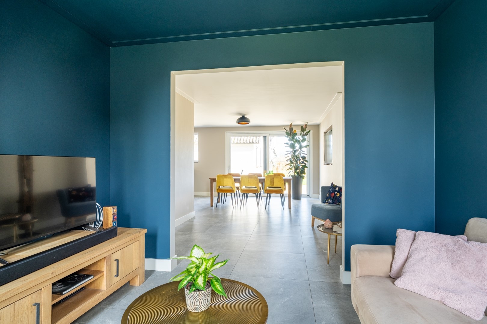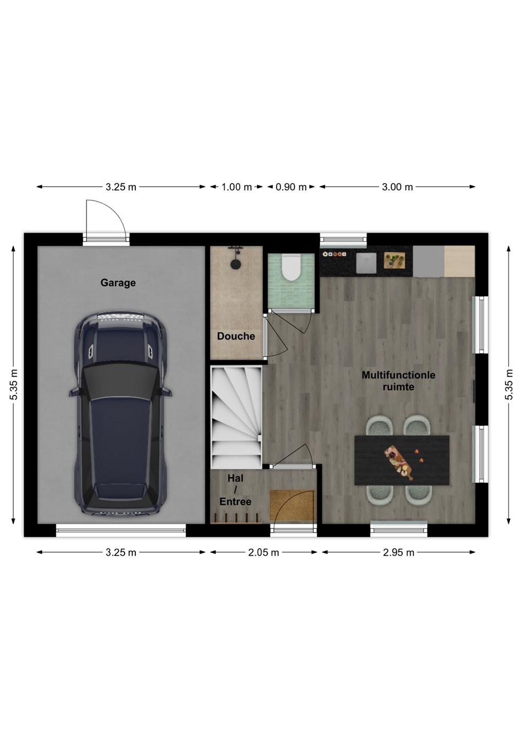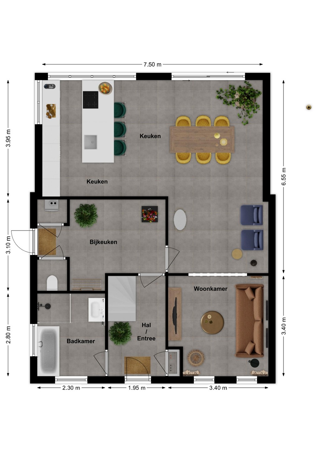 De ontvangsthal bevindt zich aan de voorzijde van de woning. Vanuit hier heb je toegang tot de bijkeuken en de badkamer. Via een vaste trap bereik je de verdieping. De woonkamer ligt aan de voorzijde van het huis en voelt knus en gezellig aan. Een fijne plek om rustig te ontspannen, terwijl de woonkeuken het levendige middelpunt van de woning vormt.