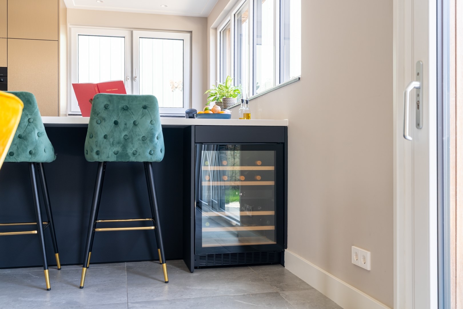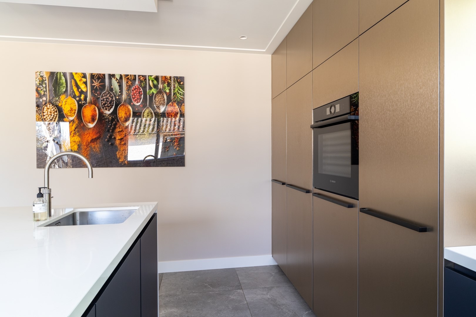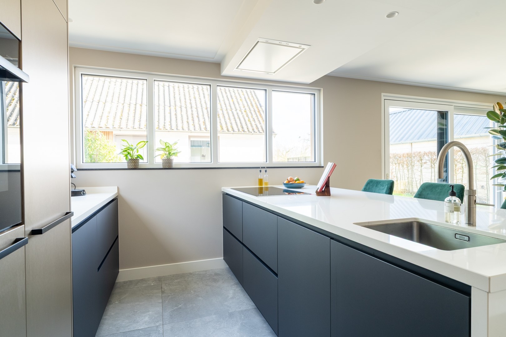 De woonkeuken is ruim, licht en modern ingericht. Dankzij de grote schuifpui valt er veel daglicht binnen en heb je direct toegang tot het zonneterras. De keuken bestaat uit een rechte opstelling met koffiecorner en een royaal spoel- en kookeiland met een natuurstenen werkblad. Uiteraard is de keuken voorzien van diverse inbouwapparatuur, waaronder een inductiekookplaat met zes zones, afzuigunit, koelkast, vriezer, vaatwasser, oven en een Quooker-kraan.