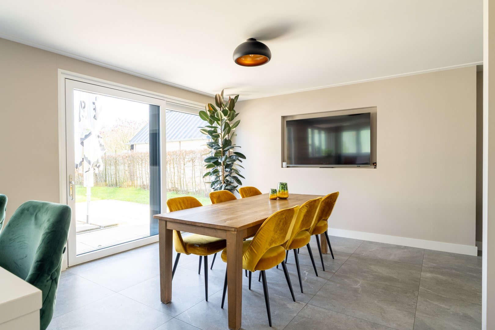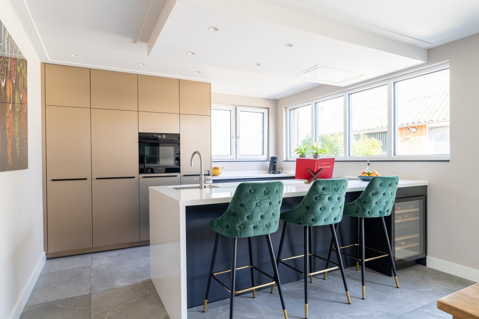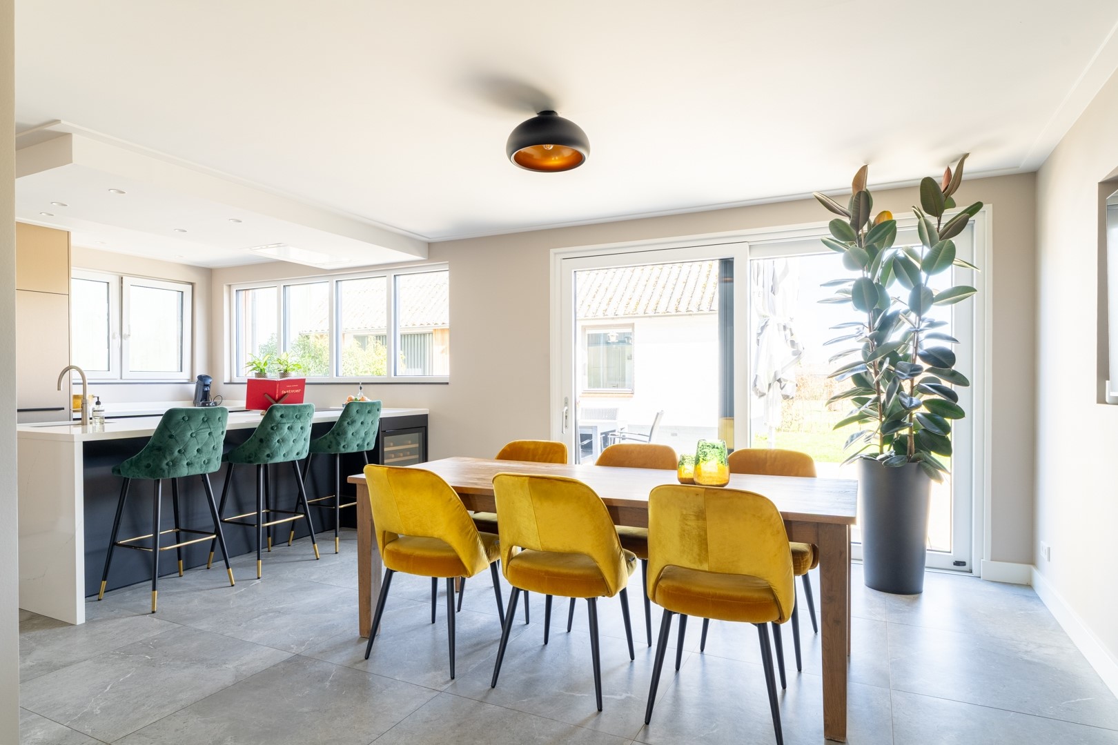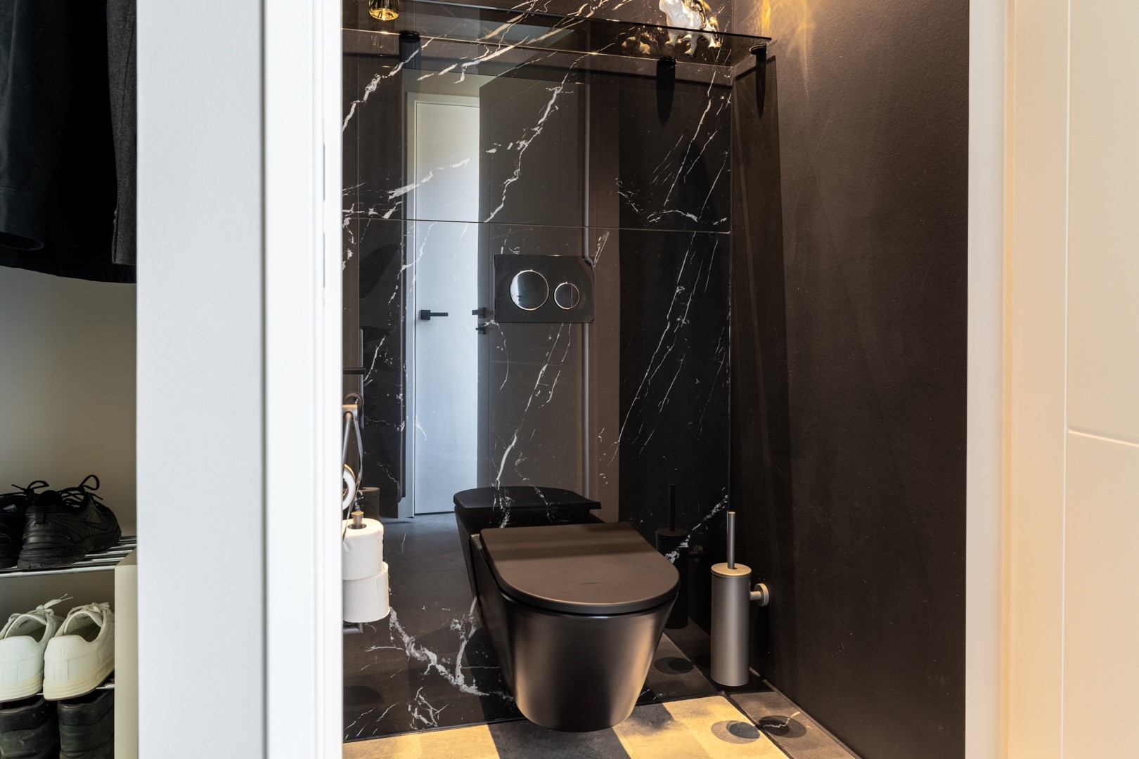 De woonkeuken is ruim, licht en modern ingericht. Dankzij de grote schuifpui valt er veel daglicht binnen en heb je direct toegang tot het zonneterras. De keuken bestaat uit een rechte opstelling met koffiecorner en een royaal spoel- en kookeiland met een natuurstenen werkblad. Uiteraard is de keuken voorzien van diverse inbouwapparatuur, waaronder een inductiekookplaat met zes zones, afzuigunit, koelkast, vriezer, vaatwasser, oven en een Quooker-kraan.