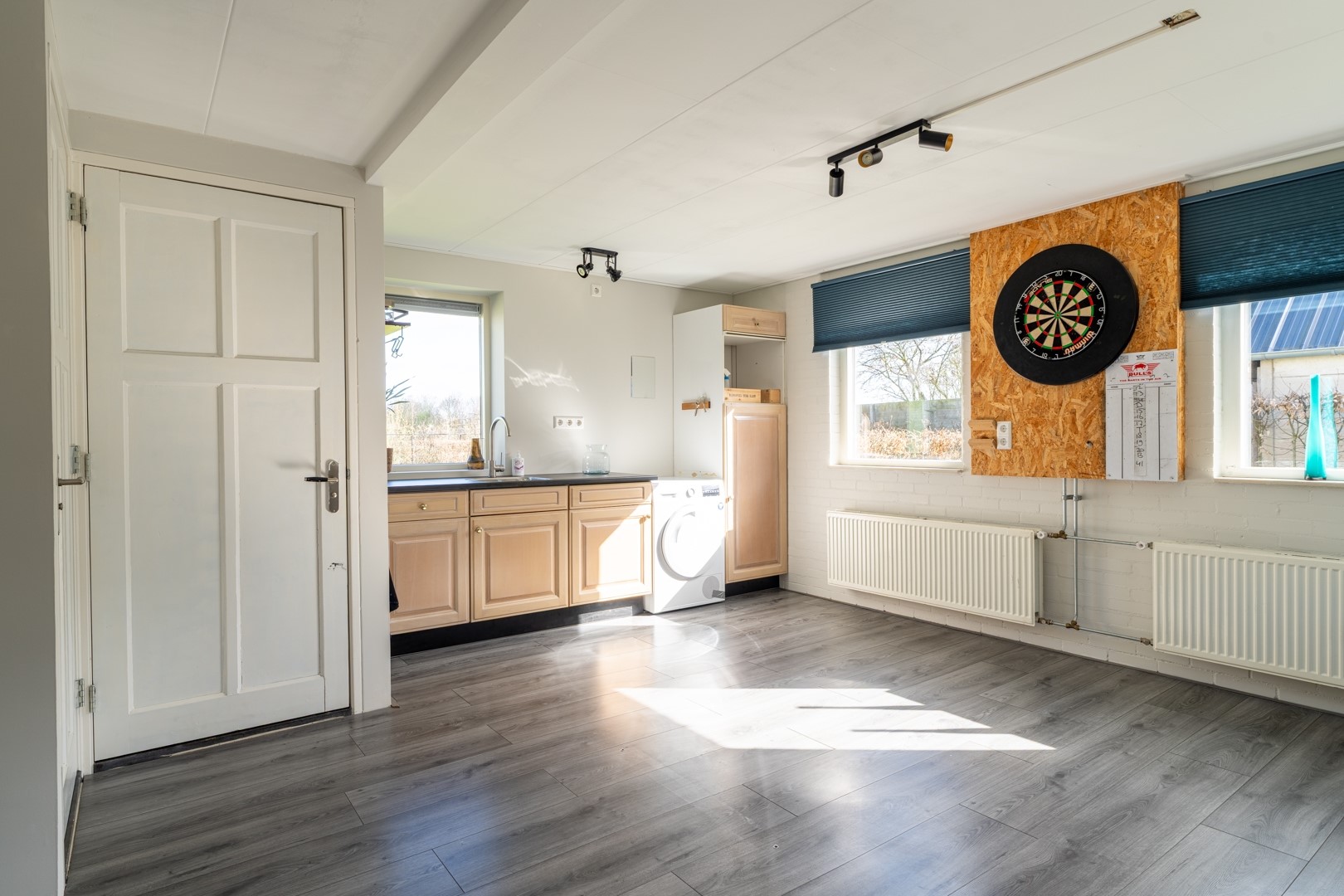 Tijdens de verbouwing van de woning is het gastenverblijf tijdelijk als woonruimte gebruikt. Het beschikt over een eenvoudige keukenopstelling, een toilet, een badkamer met inloopdouche en een gezellige woonkamer. In het portaal bevindt zich de eigen cv-installatie. Via een vaste trap kom je op de slaapverdieping. De afmetingen van de ruimte bedragen circa 5,35 x 5,10 meter.