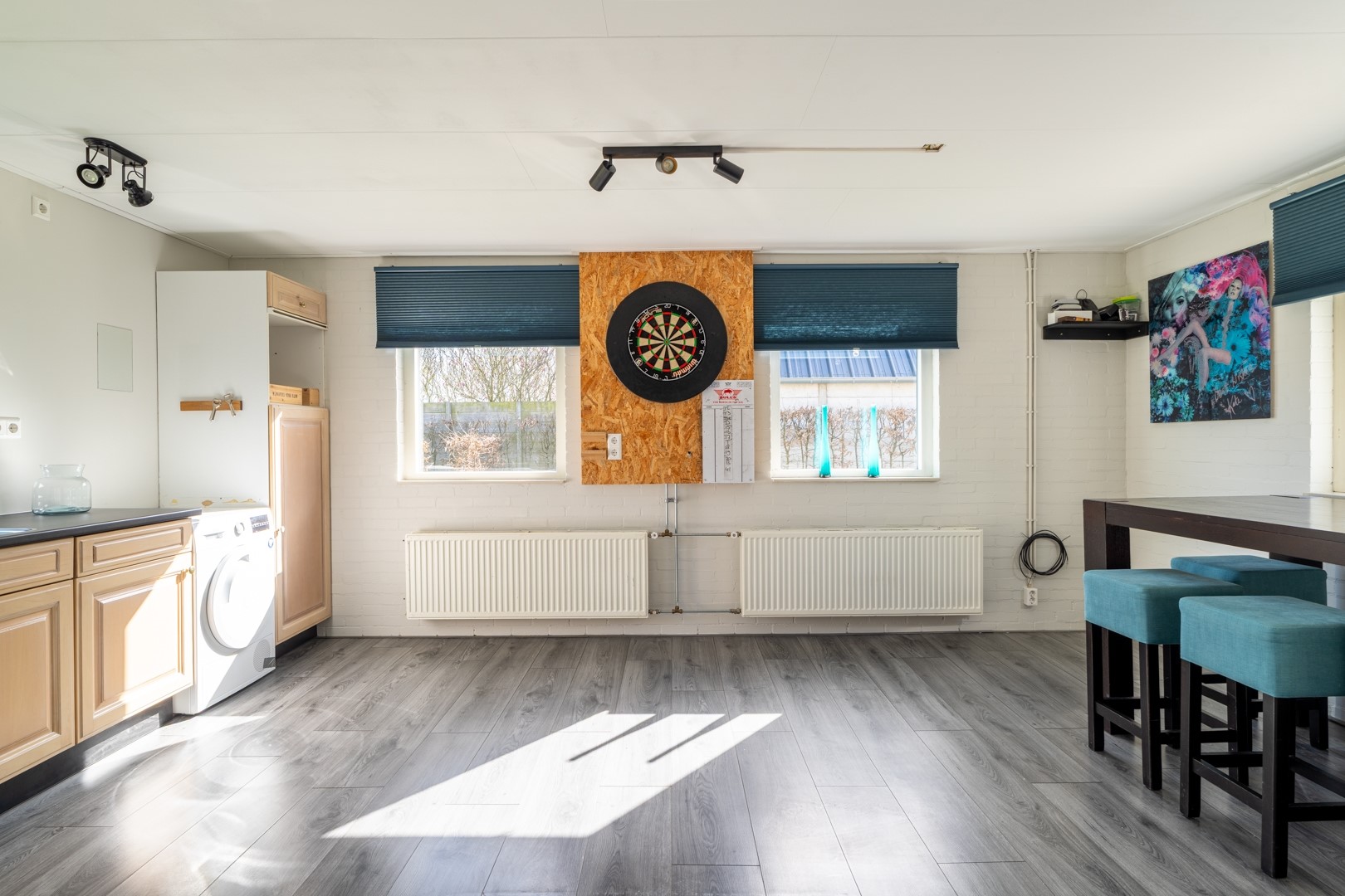 Naast het gastenverblijf staat de garage. Deze is aan de voorzijde voorzien van een elektrische kanteldeur en aan de achterzijde van een handbediende kanteldeur, waardoor je gemakkelijk vanuit de tuin naar de oprit kunt. In de garage is een wateraansluiting aanwezig. Afmetingen circa 5,35 x 3,25 meter.