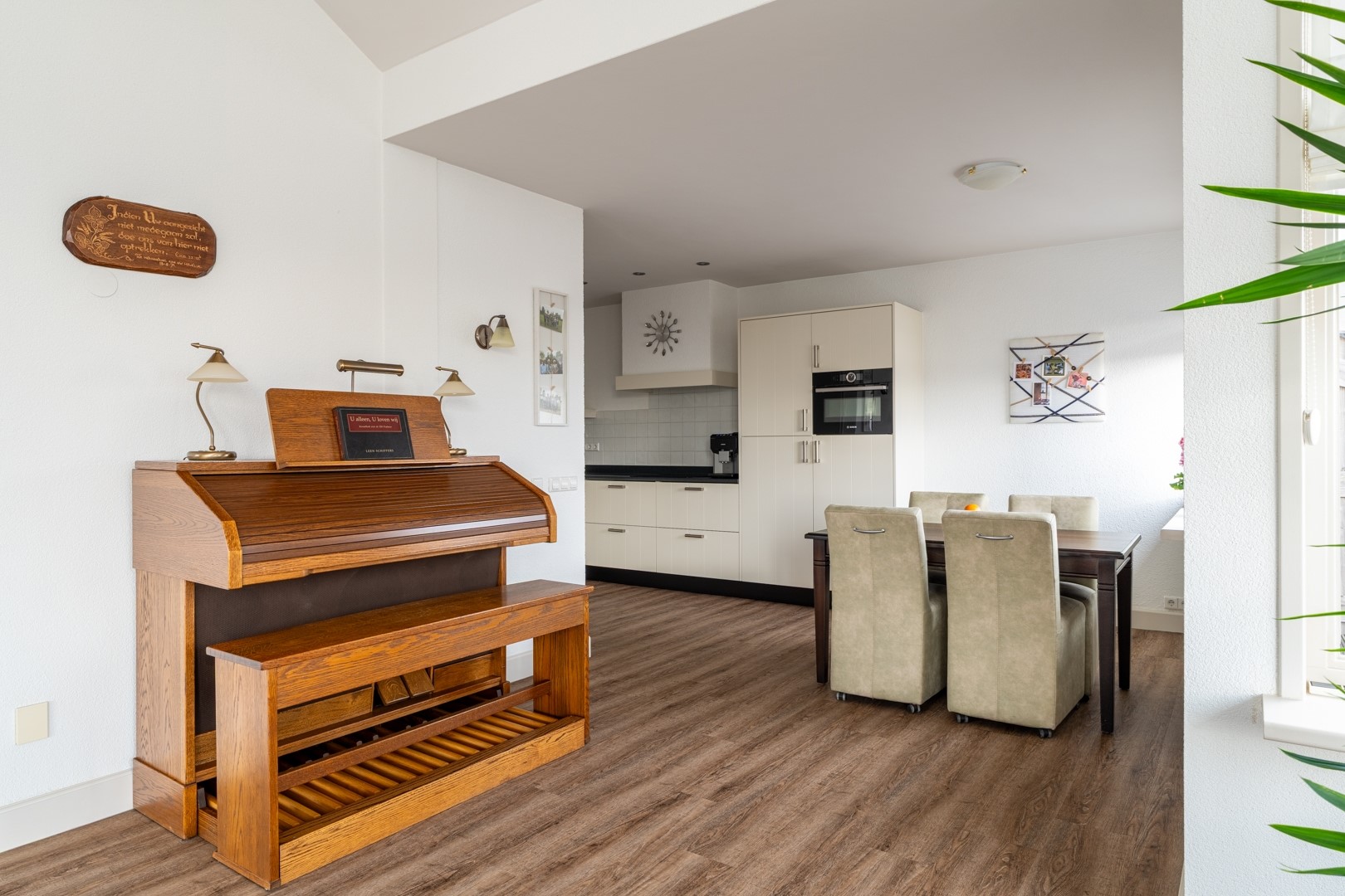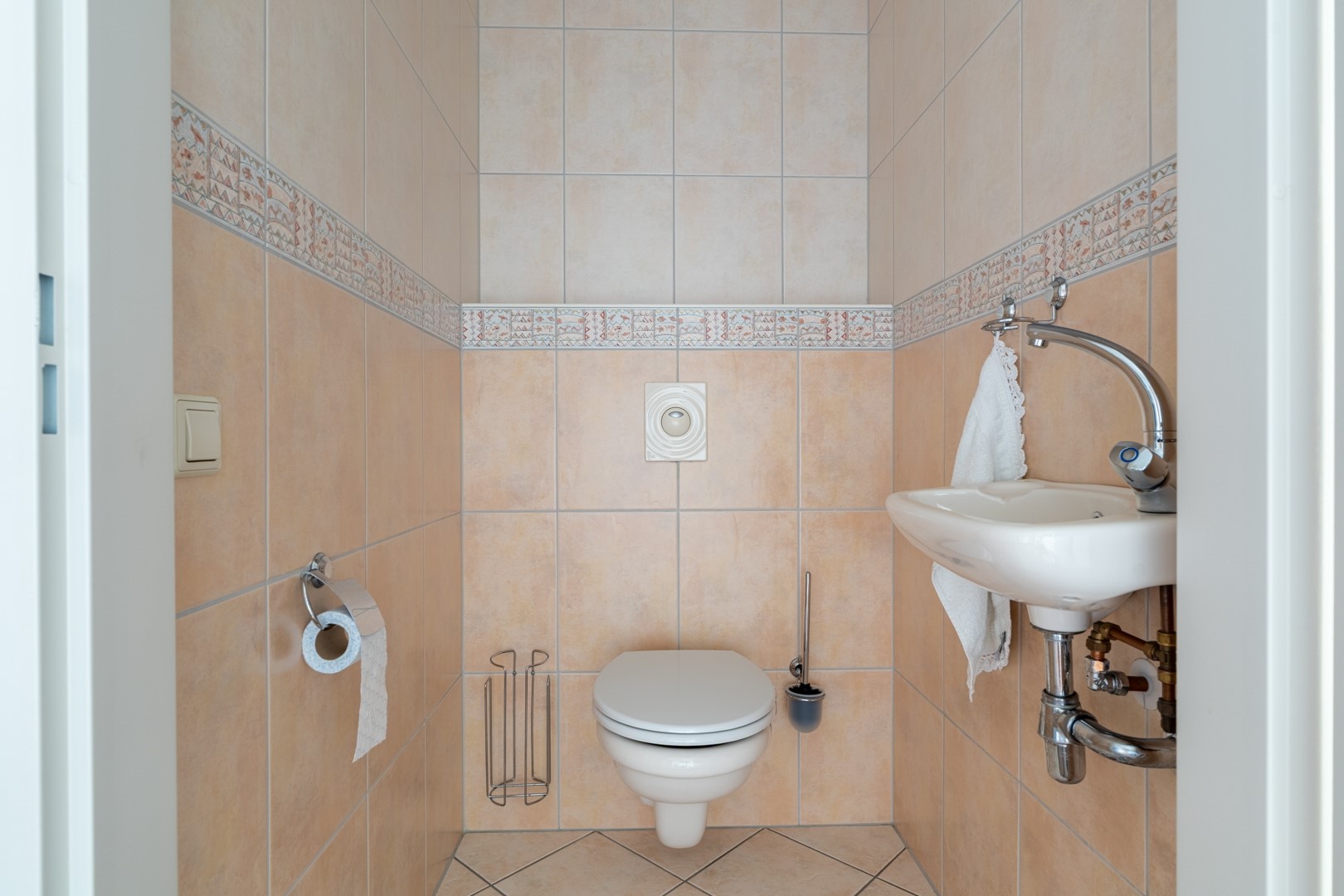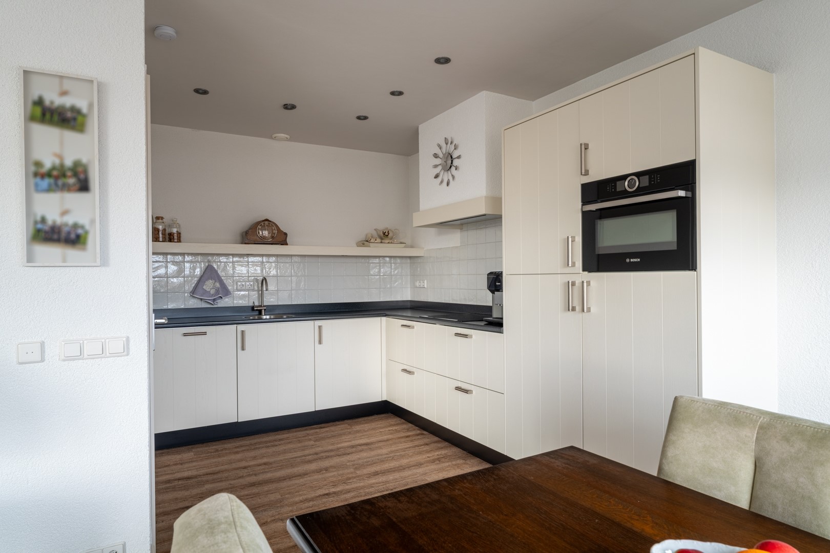 De keuken heeft een open karakter maar is toch subtiel gescheiden van de woonkamer. De praktische hoekopstelling is voorzien van diverse inbouwapparatuur, waaronder een koelkast, inductiekookplaat, schouw met vlakscherm, vaatwasser en een combimagnetron. Aansluitend bevindt zich de bijkeuken, een fijne extra ruimte met aansluitingen voor wasmachine en droger. Hier zijn ook de cv-installatie, de afzuigunit en het aircosysteem (verwarmen en koelen) geplaatst.