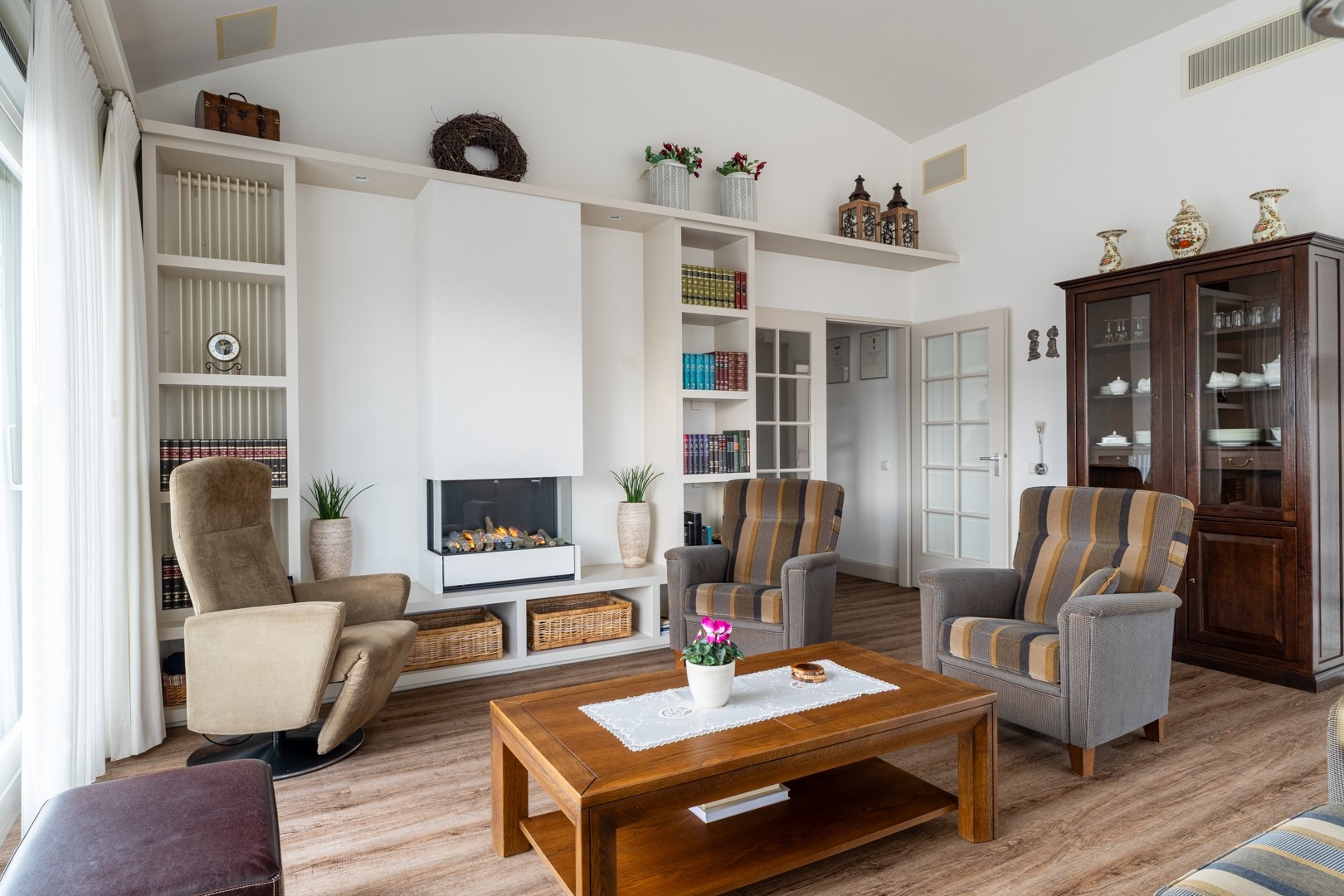 De entree van het appartement bereik je via het trappenhuis of comfortabel met de lift. In de ruime ontvangsthal valt direct de royale opzet op. Hier bevindt zich een praktische garderobenis en vanuit deze centrale ruimte heb je toegang tot de slaapkamers, het toilet, de badkamer en de woonkamer. Ook één van de dakterrassen is vanuit deze hal bereikbaar. De woonkamer is heerlijk licht en ruim. Dankzij de grote raampartijen en twee schuifpuien wordt het dakterras een natuurlijk verlengstuk van de living. De sfeervolle haard zorgt voor warmte en gezelligheid tijdens de koelere dagen. De grotendeels glazen deuren naar de hal geven de ruimte bovendien een elegante en open uitstraling.