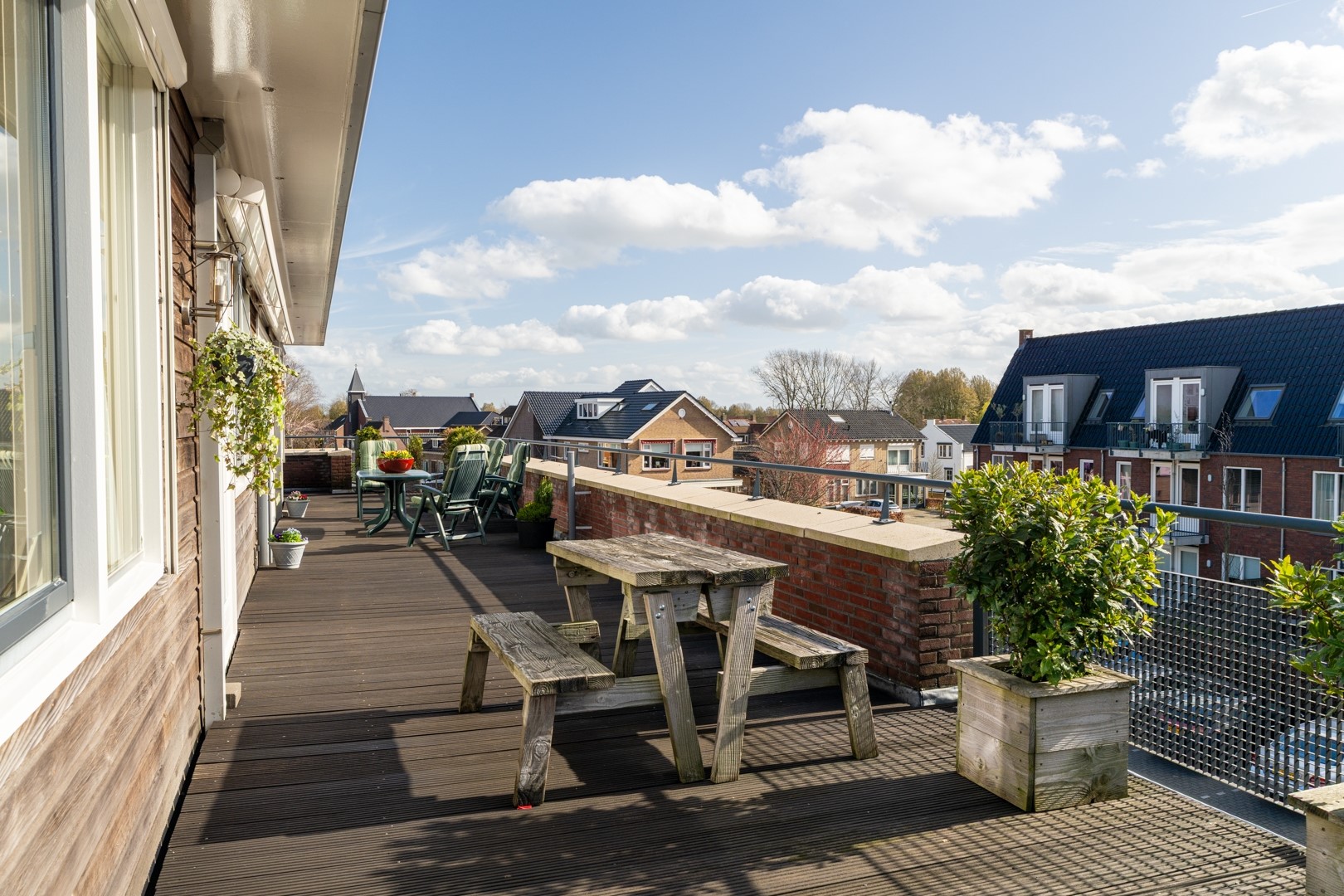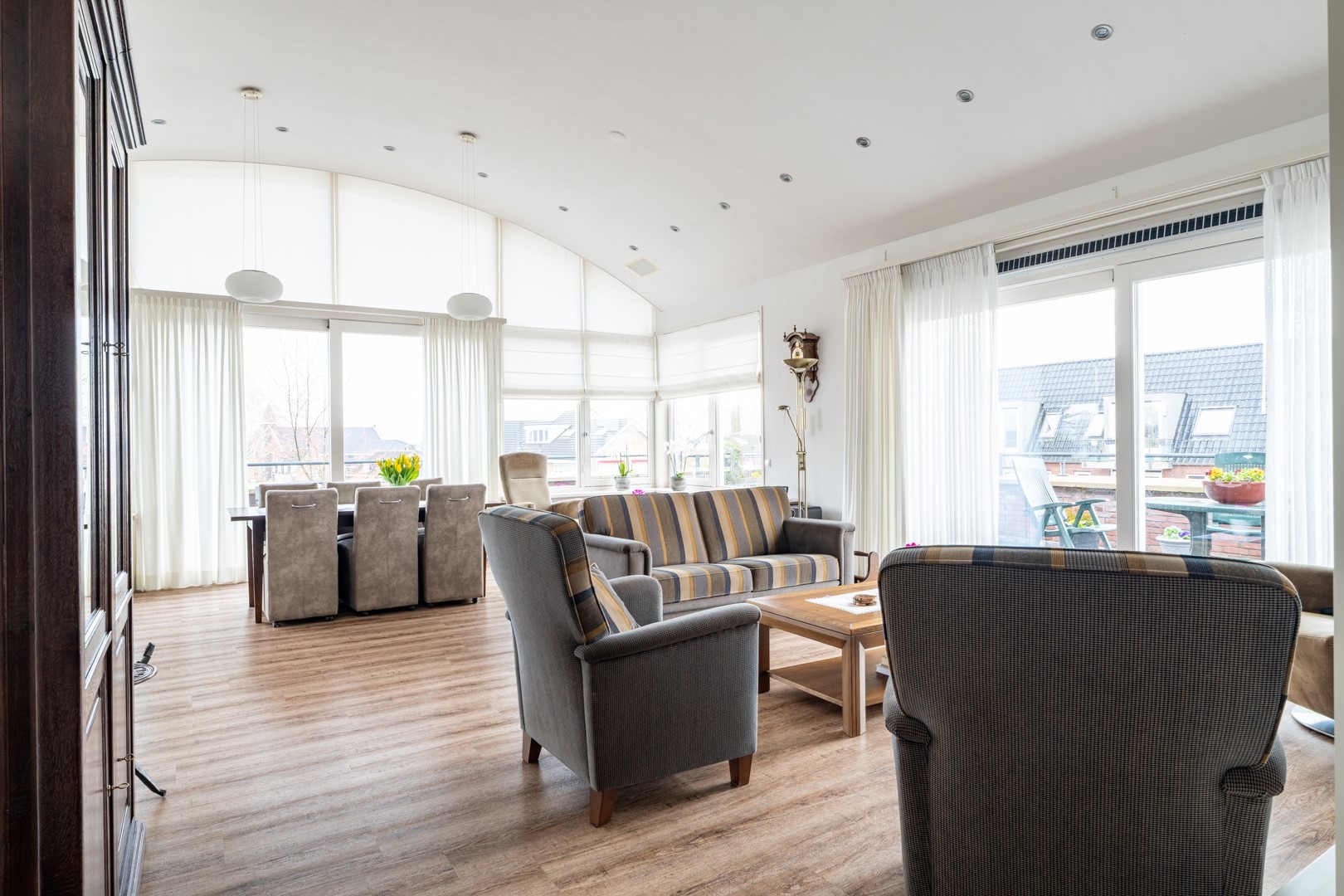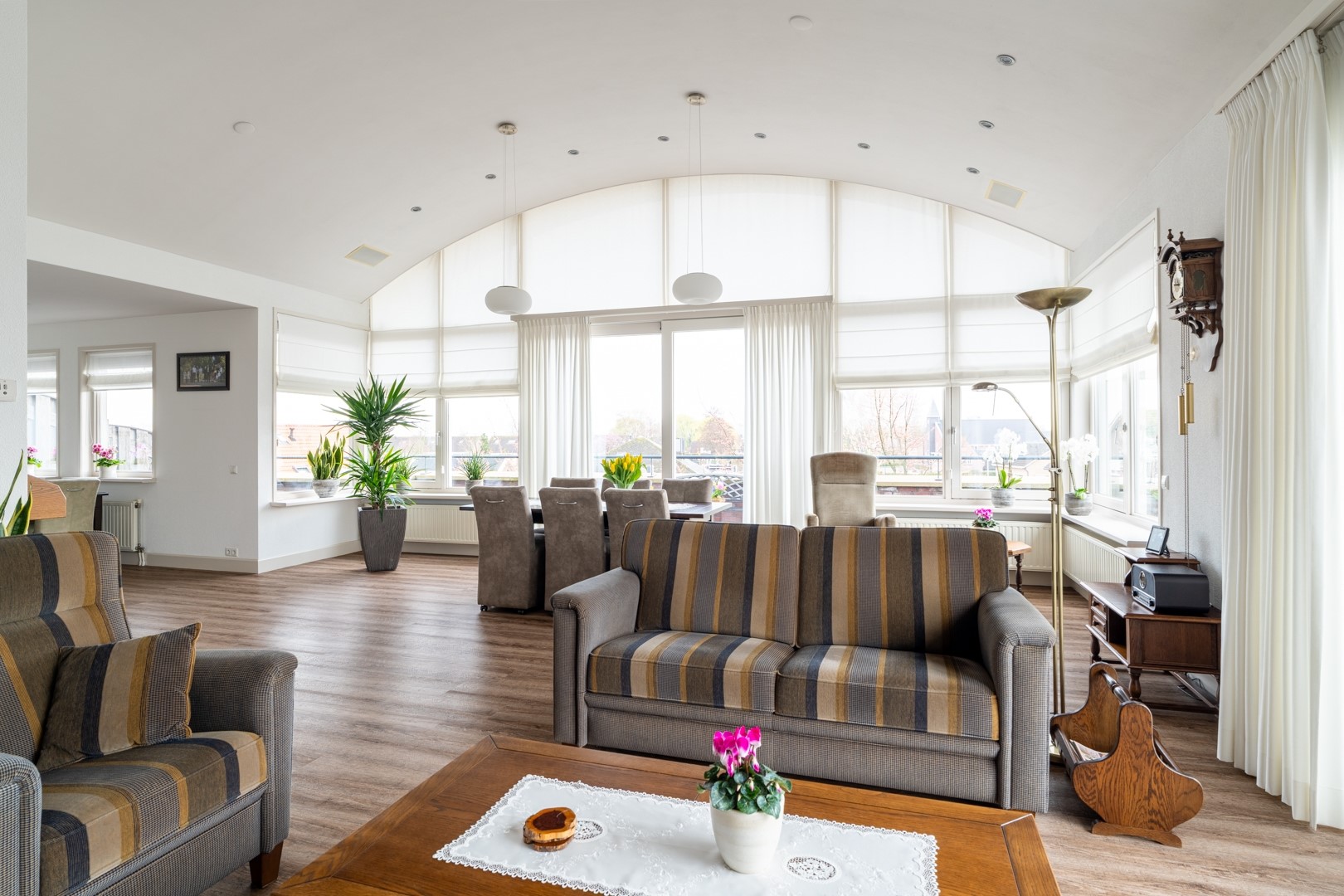 Dit is zo’n woning die je meteen bijblijft. Een indrukwekkend penthouse met een royale opzet, hoge plafonds en een uitzonderlijk groot dakterras dat het wonen hier naar een hoger niveau tilt. Met circa 150 m² woonoppervlak en een dakterras van maar liefst 150 m² biedt deze woning een combinatie van ruimte, licht en privacy die zelden voorkomt. De vele raampartijen zorgen voor een prachtige lichtinval en versterken het ruimtelijke gevoel. De woonkamer staat via twee schuifpuien in directe verbinding met het dakterras, waardoor binnen en buiten moeiteloos in elkaar overlopen. Hier geniet je van lange zomeravonden, het vrije uitzicht over het dorp en gezellige momenten bij de sfeerhaard. Het penthouse beschikt daarnaast over een luxe keuken met praktische bijkeuken, een royale slaapvleugel met vier slaapkamers en een complete badkamer. In het souterrain bevindt zich een eigen berging en op het buitenterrein een privéparkeerplaats. Met airconditioning (koelen en verwarmen) en 6 zonnepanelen is het appartement bovendien comfortabel en energiezuinig. Een bijzonder ruim en compleet penthouse op een prominente plek in het dorp – een woning die je echt moet ervaren.