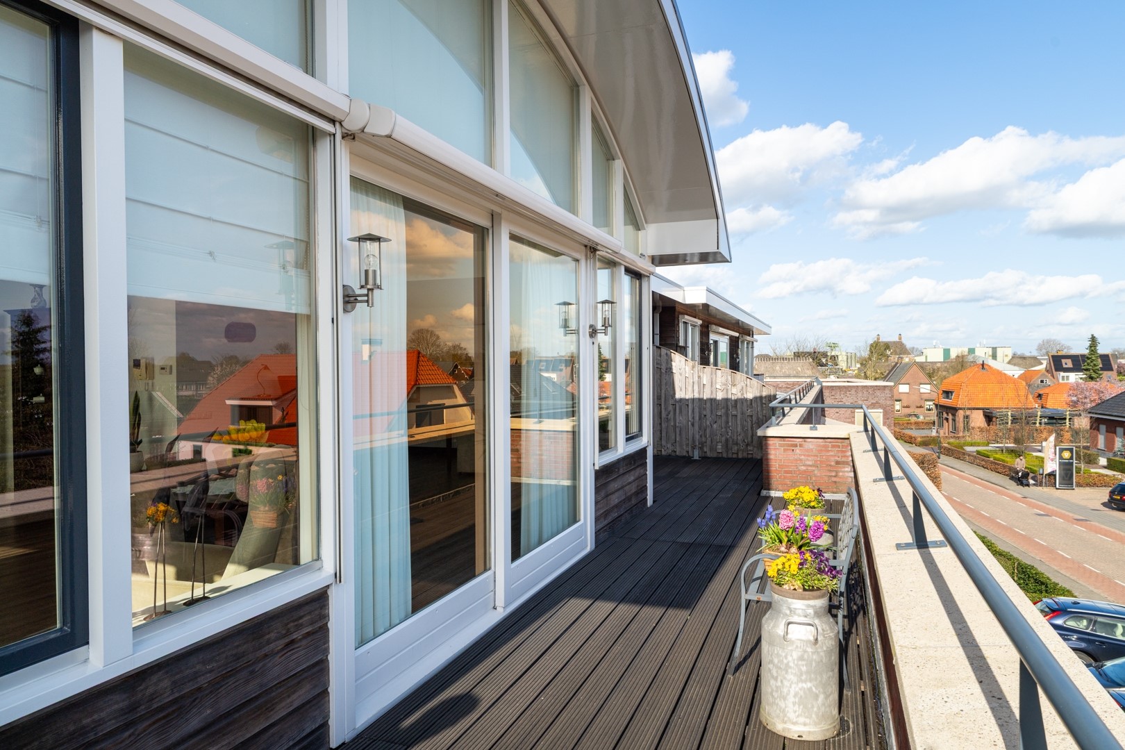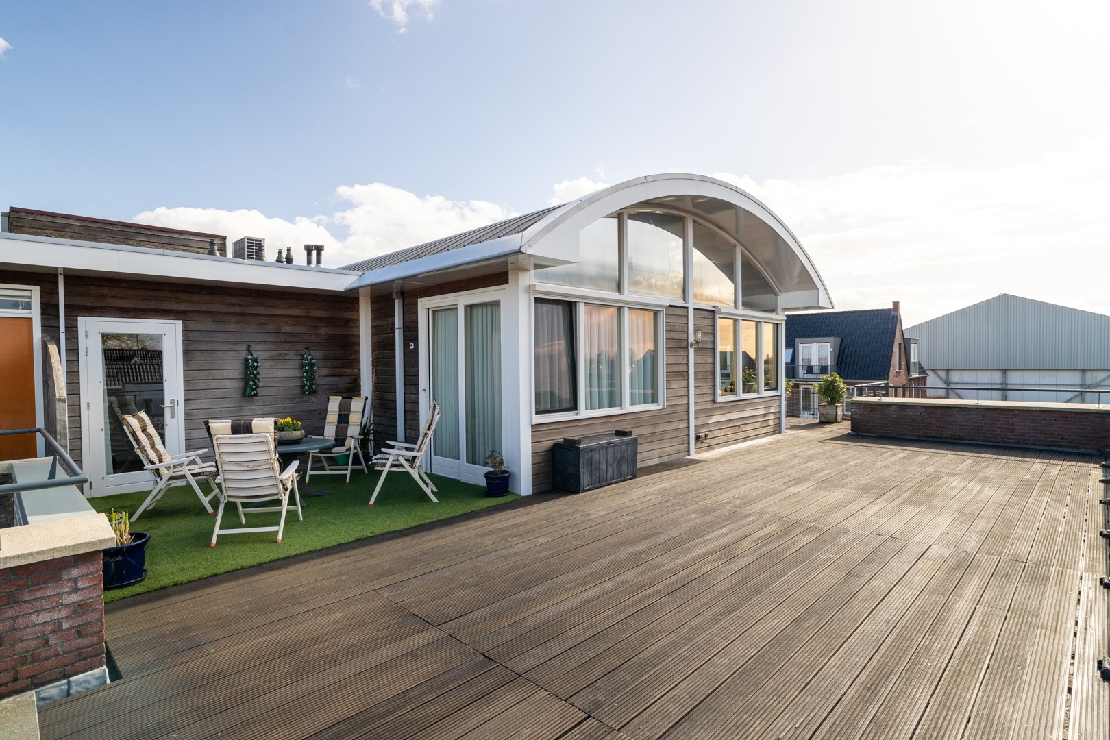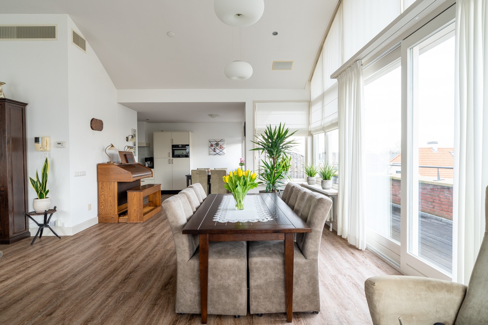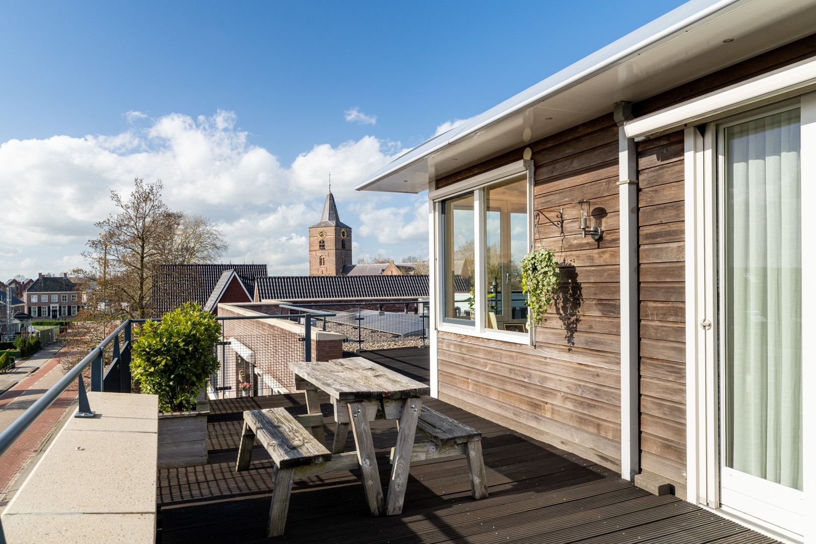 Dit is zo’n woning die je meteen bijblijft. Een indrukwekkend penthouse met een royale opzet, hoge plafonds en een uitzonderlijk groot dakterras dat het wonen hier naar een hoger niveau tilt. Met circa 150 m² woonoppervlak en een dakterras van maar liefst 150 m² biedt deze woning een combinatie van ruimte, licht en privacy die zelden voorkomt. De vele raampartijen zorgen voor een prachtige lichtinval en versterken het ruimtelijke gevoel. De woonkamer staat via twee schuifpuien in directe verbinding met het dakterras, waardoor binnen en buiten moeiteloos in elkaar overlopen. Hier geniet je van lange zomeravonden, het vrije uitzicht over het dorp en gezellige momenten bij de sfeerhaard. Het penthouse beschikt daarnaast over een luxe keuken met praktische bijkeuken, een royale slaapvleugel met vier slaapkamers en een complete badkamer. In het souterrain bevindt zich een eigen berging en op het buitenterrein een privéparkeerplaats. Met airconditioning (koelen en verwarmen) en 6 zonnepanelen is het appartement bovendien comfortabel en energiezuinig. Een bijzonder ruim en compleet penthouse op een prominente plek in het dorp – een woning die je echt moet ervaren.