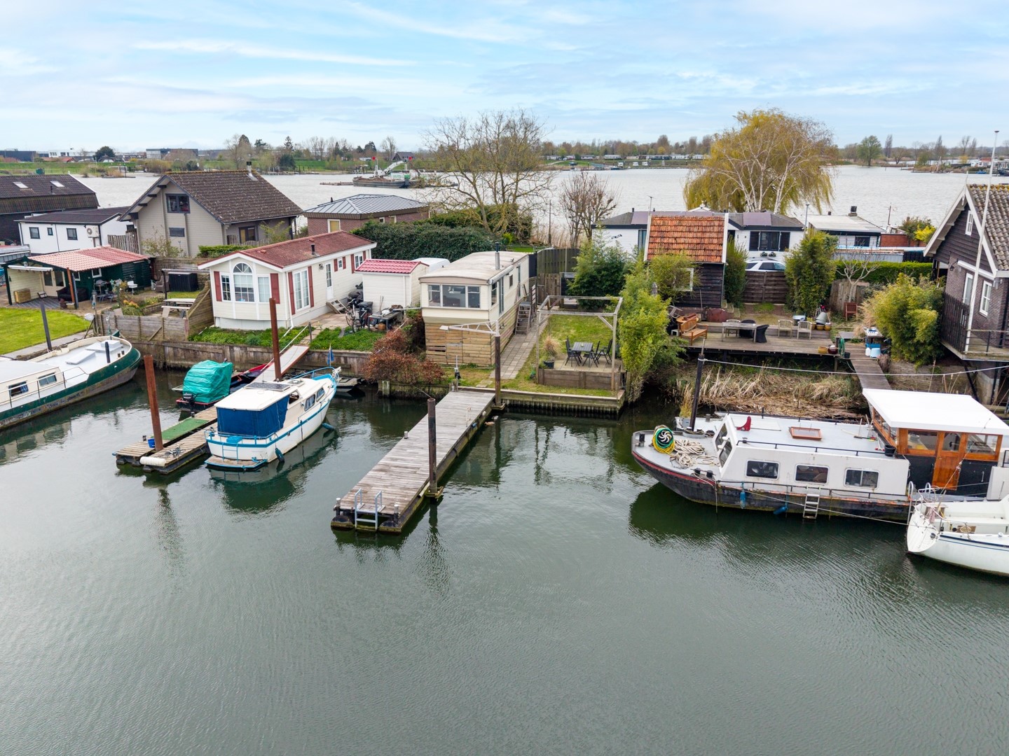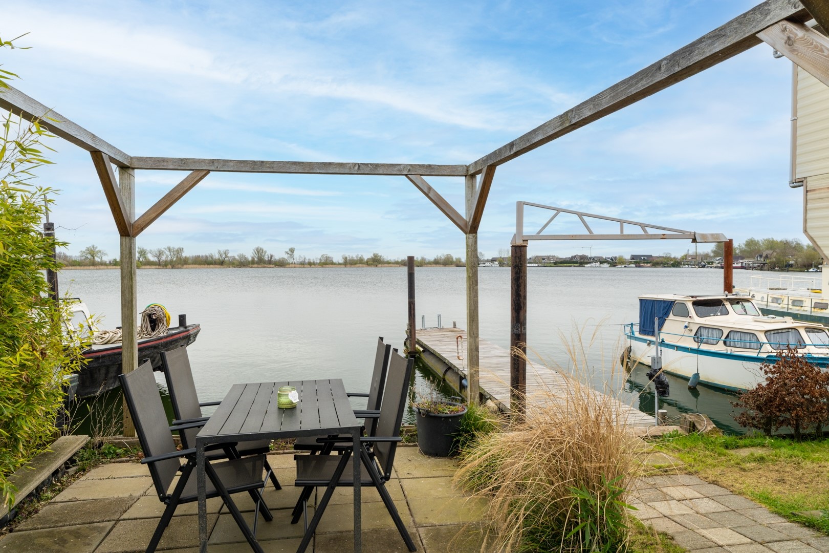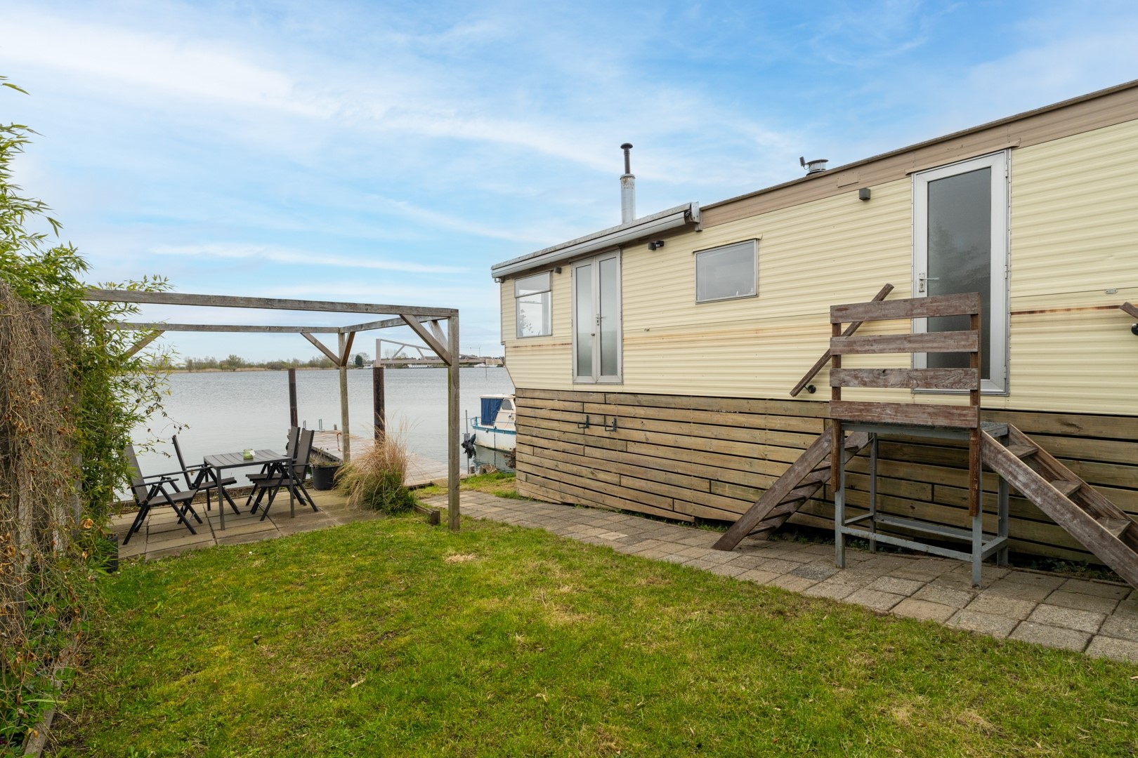 Het buitenleven is hier werkelijk een verlengstuk van de woning. De tuin, gelegen aan zowel de noord- als westzijde, biedt meerdere plekken om te genieten van zon, schaduw en vooral het uitzicht over het water. Of je nu ’s ochtends rustig een kop koffie drinkt of ’s avonds de zon ziet ondergaan, hier kom je volledig tot rust. Een absolute meerwaarde is de eigen steiger, waar het mogelijk is om een boot aan te meren tot maar liefst 20 meter. Voor watersportliefhebbers is dit een unieke kans om direct vanuit huis het water op te gaan. Daarnaast beschikt het chalet over circa 20 m² bergruimte onder de woning, inclusief een wasmachineaansluiting – praktisch en efficiënt benut.