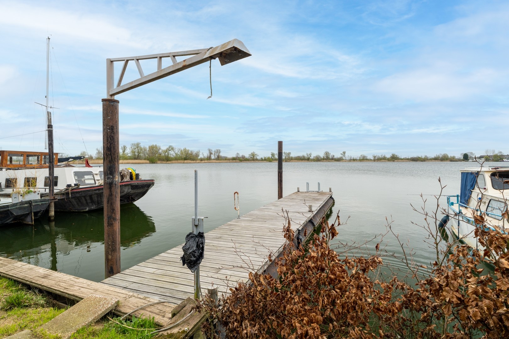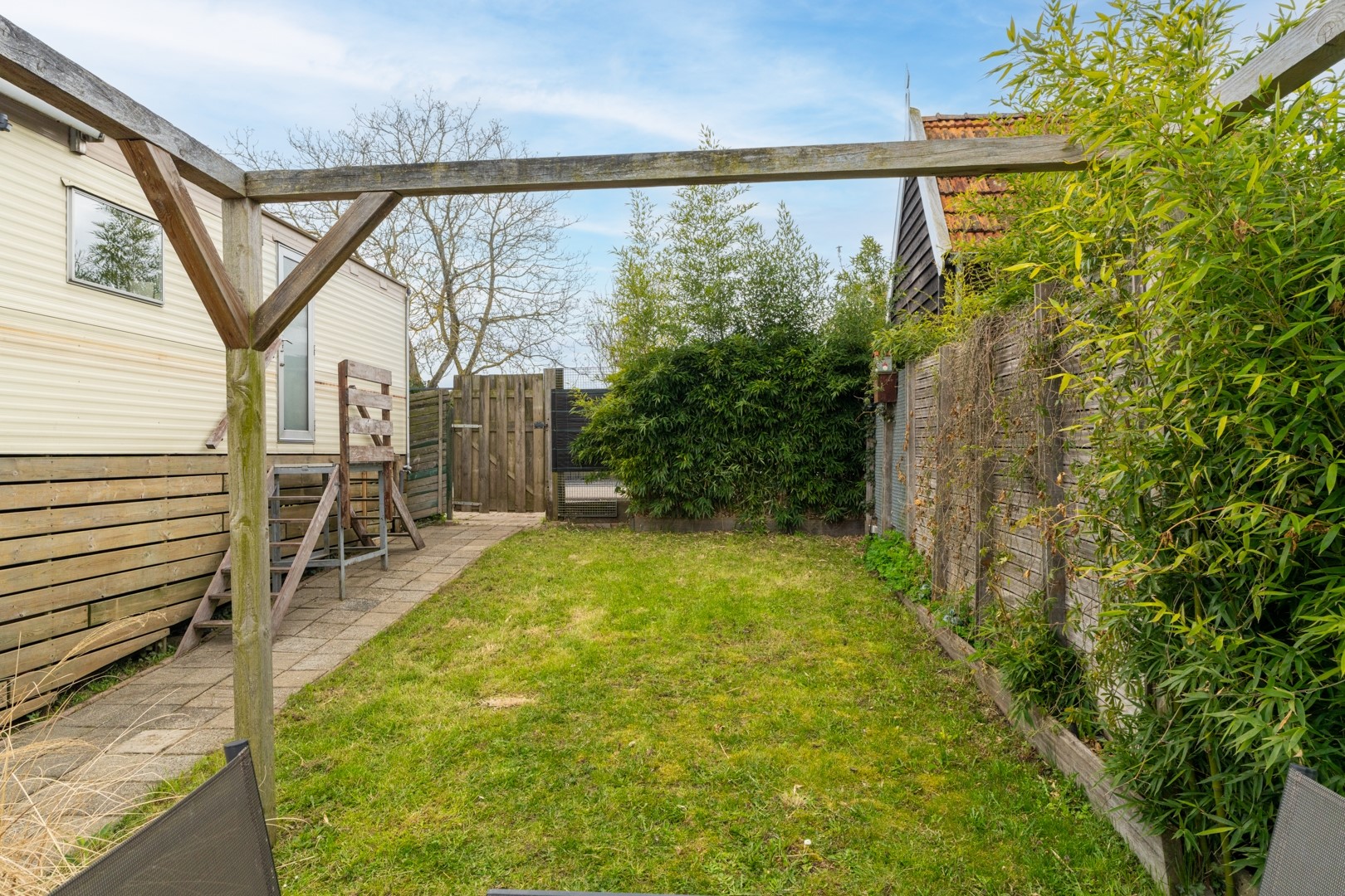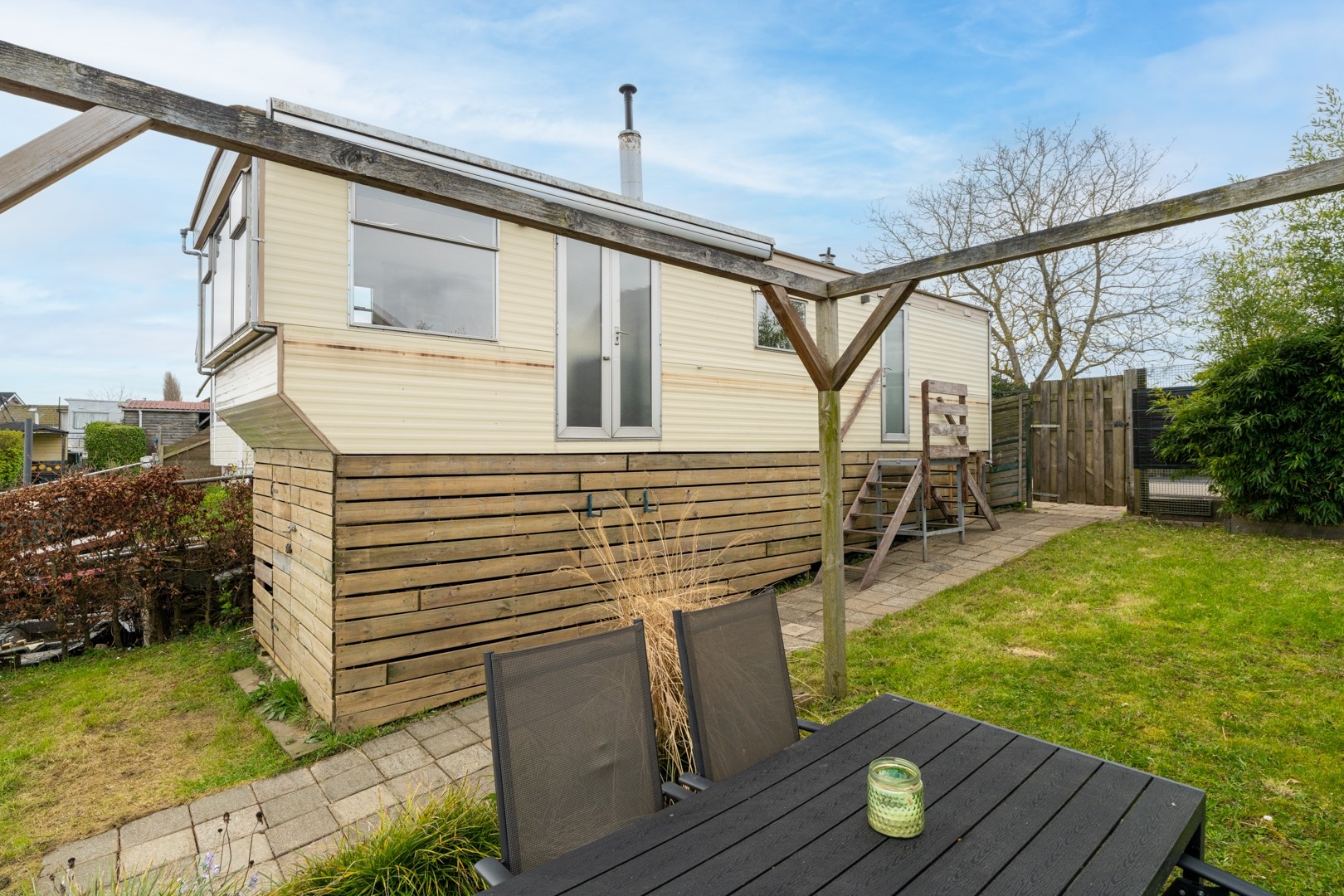 Het buitenleven is hier werkelijk een verlengstuk van de woning. De tuin, gelegen aan zowel de noord- als westzijde, biedt meerdere plekken om te genieten van zon, schaduw en vooral het uitzicht over het water. Of je nu ’s ochtends rustig een kop koffie drinkt of ’s avonds de zon ziet ondergaan, hier kom je volledig tot rust. Een absolute meerwaarde is de eigen steiger, waar het mogelijk is om een boot aan te meren tot maar liefst 20 meter. Voor watersportliefhebbers is dit een unieke kans om direct vanuit huis het water op te gaan. Daarnaast beschikt het chalet over circa 20 m² bergruimte onder de woning, inclusief een wasmachineaansluiting – praktisch en efficiënt benut.
