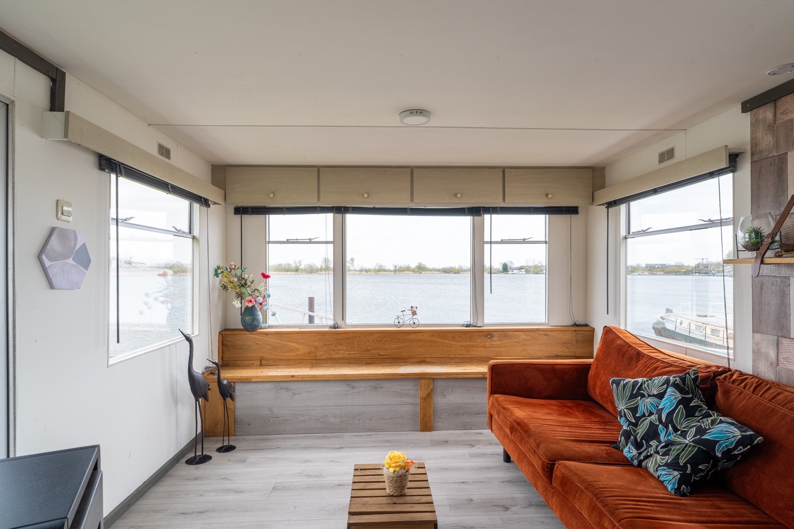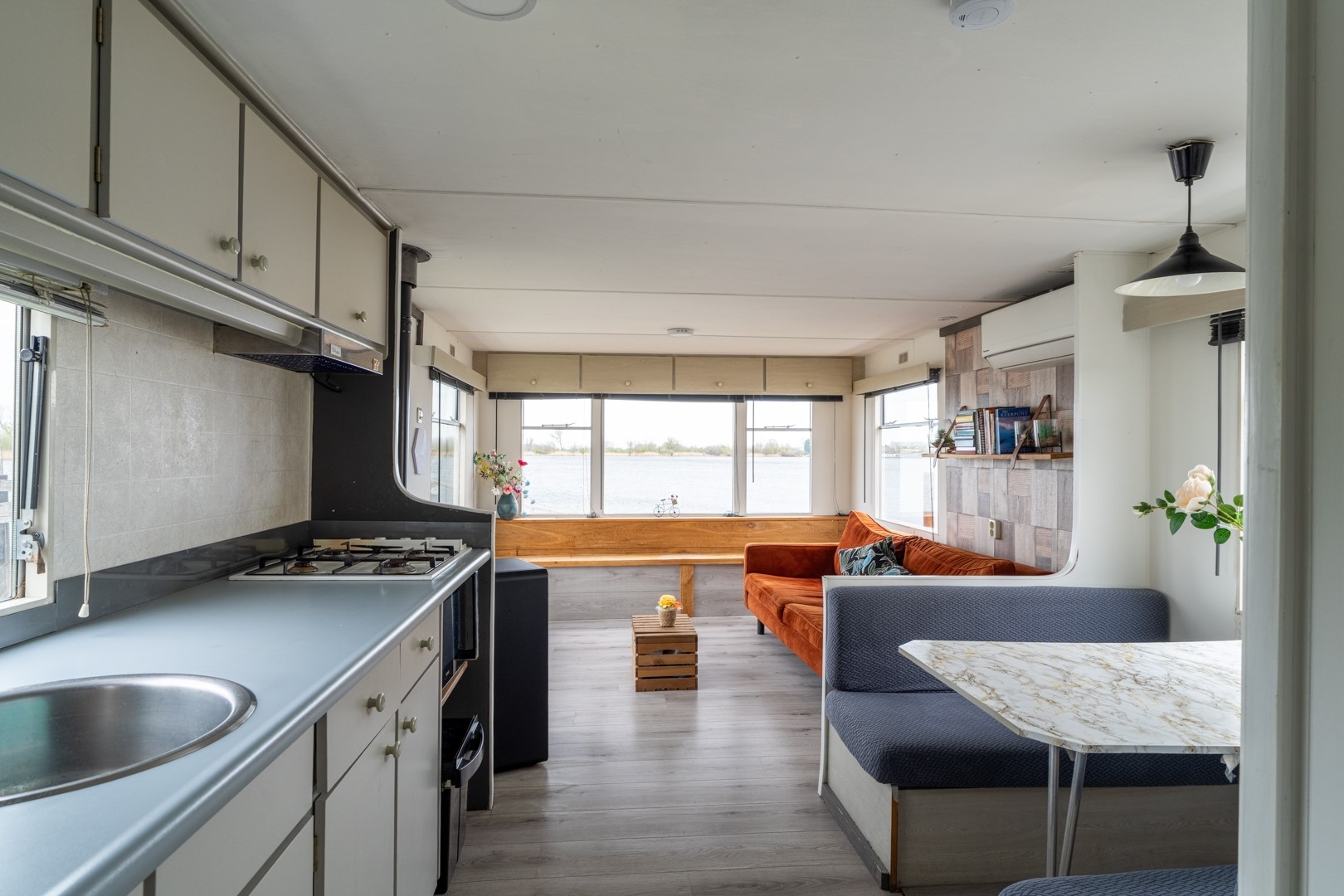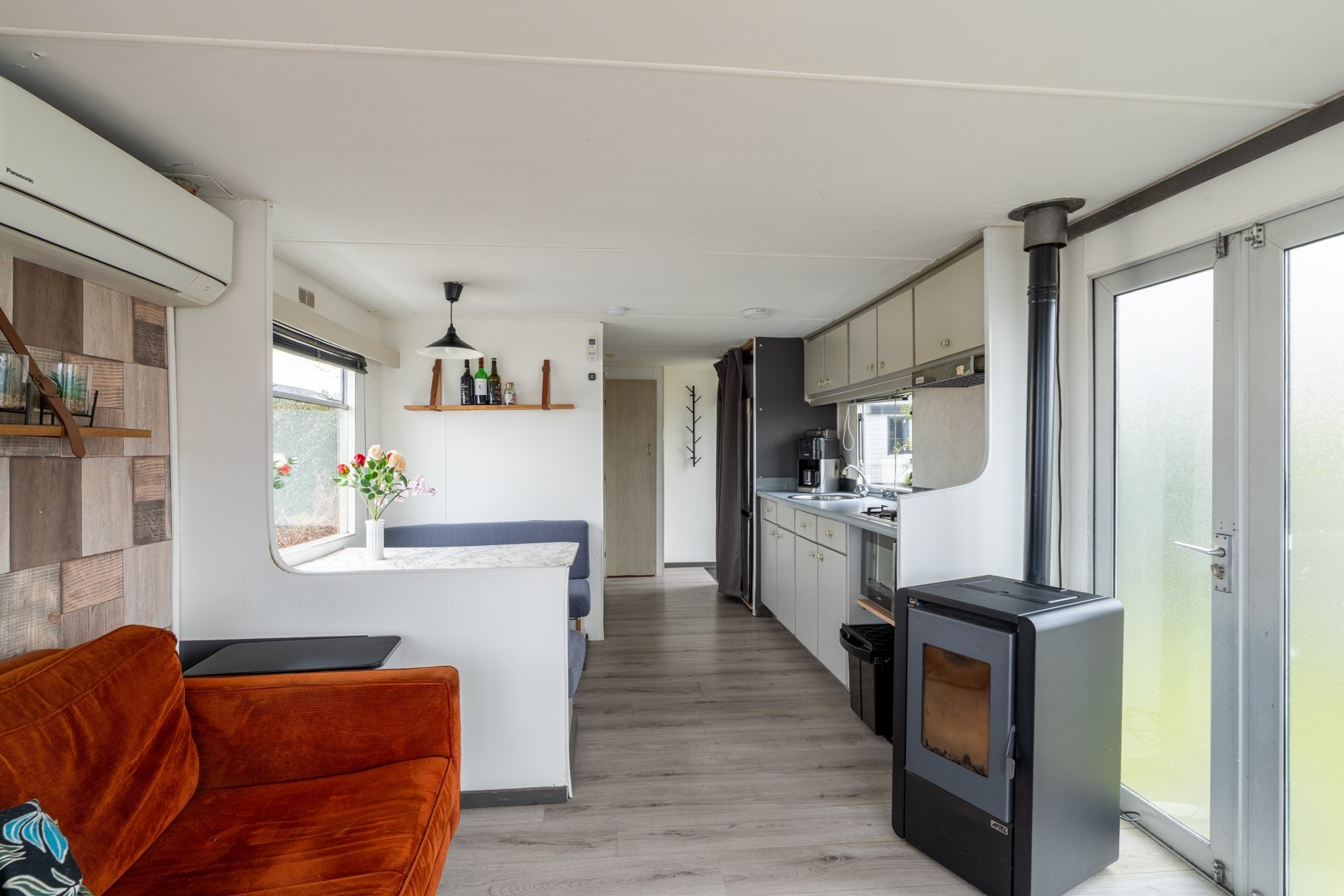 Bij binnenkomst valt direct de lichte en uitnodigende woonruimte op. Grote raampartijen bieden een panoramisch uitzicht over het water, waardoor binnen en buiten naadloos in elkaar overlopen. De dubbele tuindeuren versterken dit gevoel en geven direct toegang tot de tuin en het terras. De aanwezigheid van een pelletkachel en airconditioning zorgt voor een aangenaam binnenklimaat, ongeacht het seizoen. De open keuken is praktisch ingericht en voorzien van een 4-pits gaskookplaat, een koel-vriescombinatie en een elektrische boiler – alles wat je nodig hebt voor het dagelijkse gemak. Het chalet beschikt over een knusse slaapkamer met een vaste kast, ideaal voor het opbergen van kleding en persoonlijke spullen. De badkamer is functioneel ingedeeld en uitgerust met een douche, toilet en een wastafelmeubel.