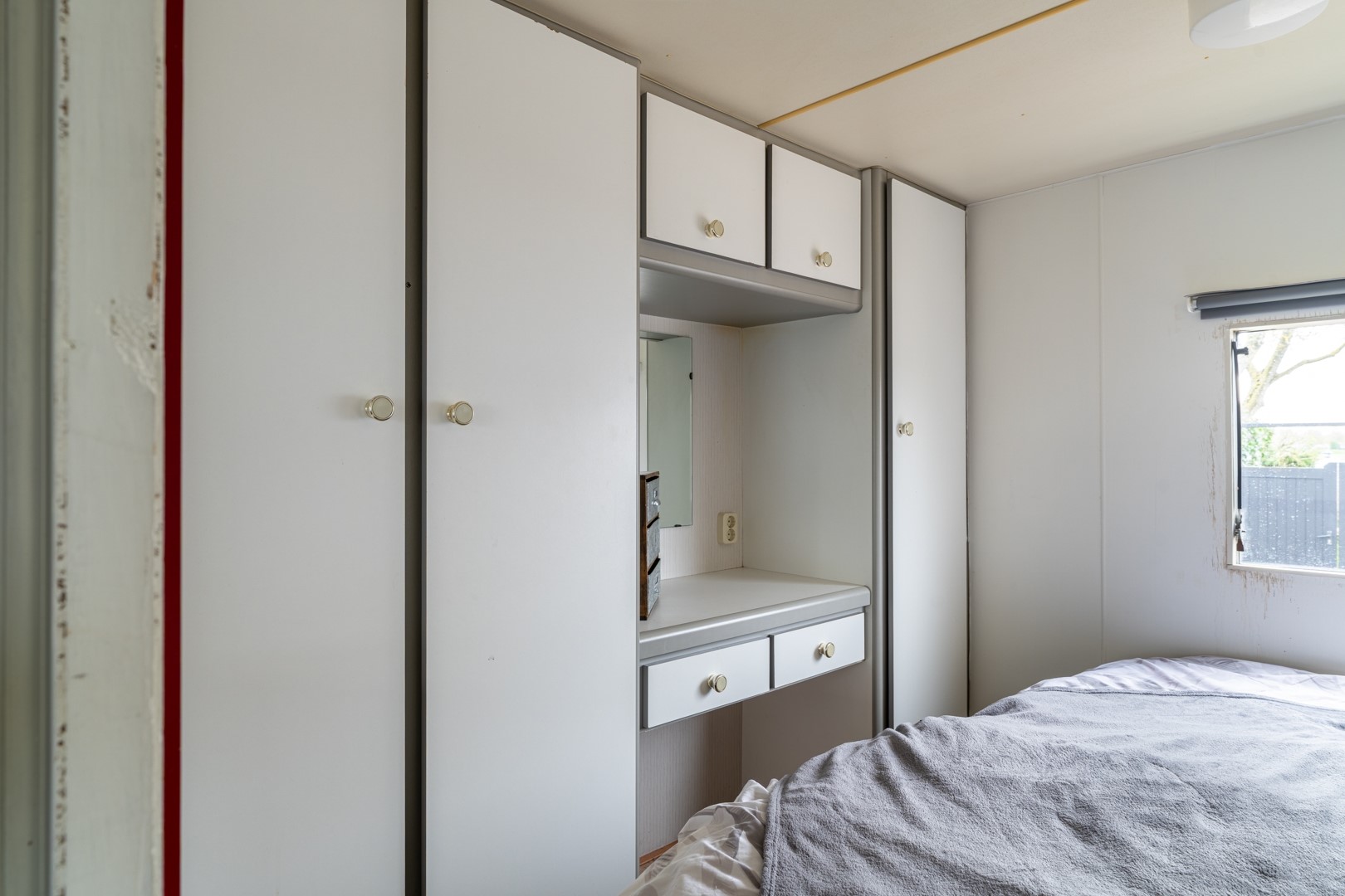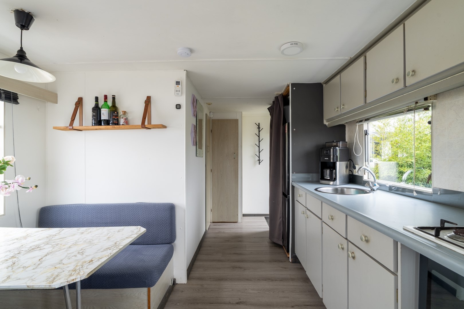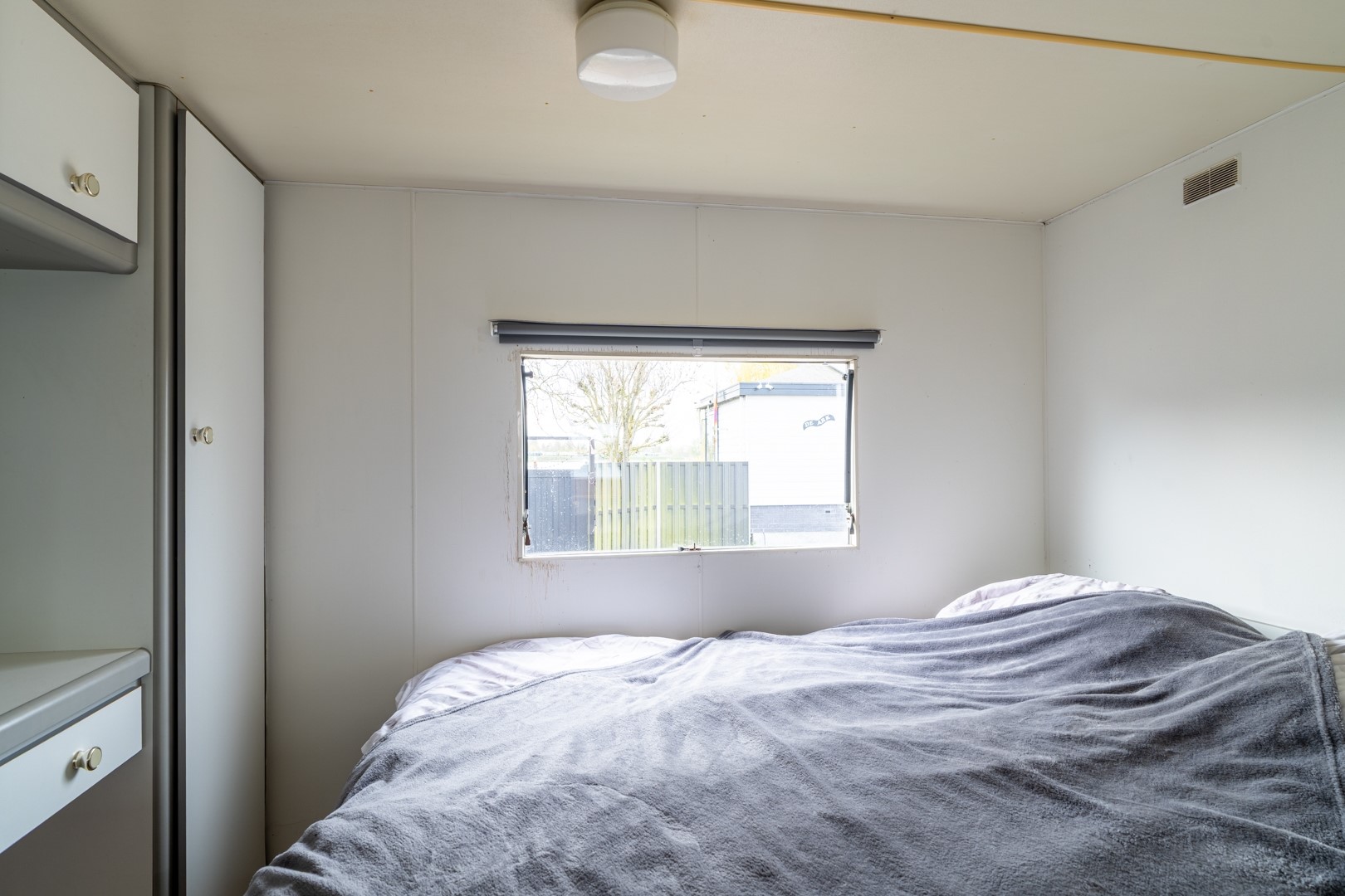 Bij binnenkomst valt direct de lichte en uitnodigende woonruimte op. Grote raampartijen bieden een panoramisch uitzicht over het water, waardoor binnen en buiten naadloos in elkaar overlopen. De dubbele tuindeuren versterken dit gevoel en geven direct toegang tot de tuin en het terras. De aanwezigheid van een pelletkachel en airconditioning zorgt voor een aangenaam binnenklimaat, ongeacht het seizoen. De open keuken is praktisch ingericht en voorzien van een 4-pits gaskookplaat, een koel-vriescombinatie en een elektrische boiler – alles wat je nodig hebt voor het dagelijkse gemak. Het chalet beschikt over een knusse slaapkamer met een vaste kast, ideaal voor het opbergen van kleding en persoonlijke spullen. De badkamer is functioneel ingedeeld en uitgerust met een douche, toilet en een wastafelmeubel.