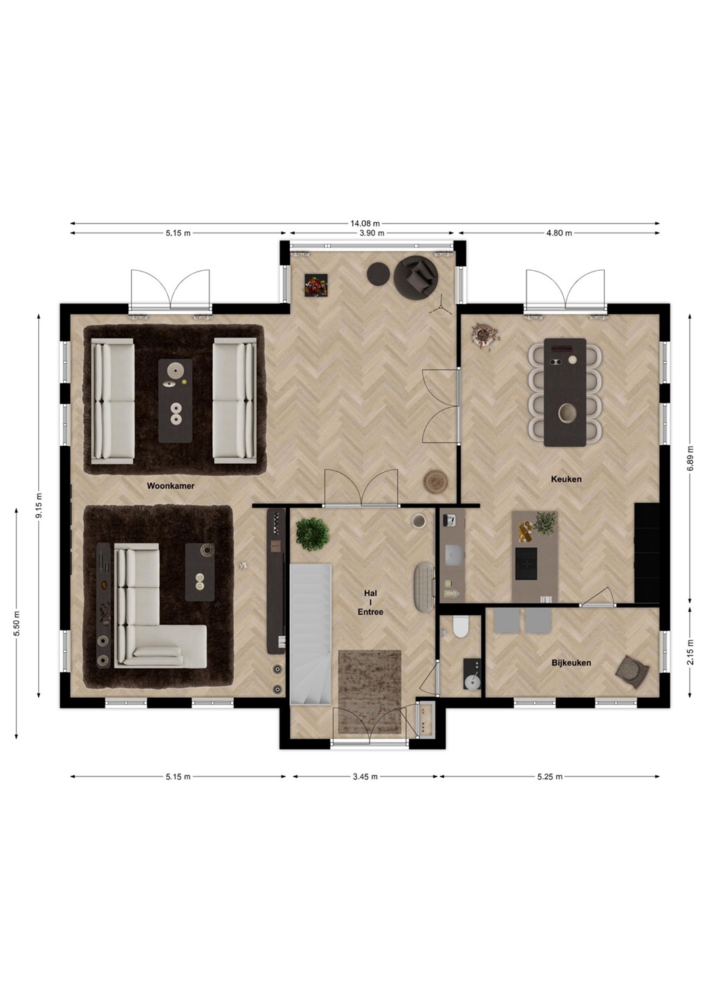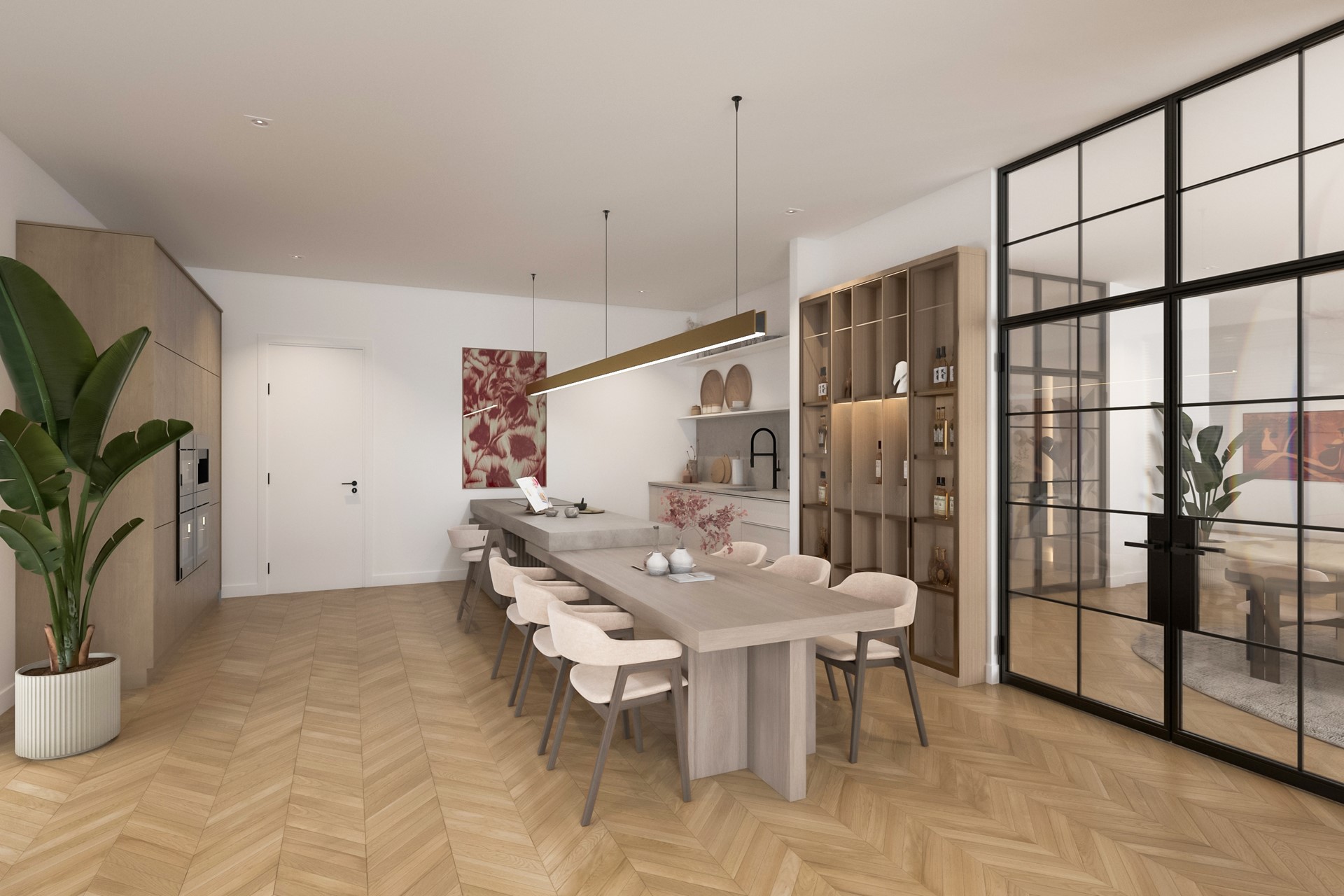 De entree maakt direct indruk. Aan de voorzijde bevindt zich een hoge erker die zorgt voor een prachtige vide in de hal. Het open karakter en de hoogte geven direct een gevoel van luxe en ruimte. In de hal is ruimte voor een royale garderobe en bevindt zich het toilet. Via plafondhoge taatsdeuren bereik je de leefruimtes. Deze deuren versterken het open karakter, terwijl ze tegelijkertijd de mogelijkheid bieden om ruimtes subtiel van elkaar te scheiden. De royale woonkeuken met kookeiland vormt het hart van het huis. Hier is volop ruimte om te koken, leven en ontvangen. Aansluitend bevindt zich de bijkeuken. De woonkamer en keuken kunnen middels glazen taatsdeuren worden afgesloten.