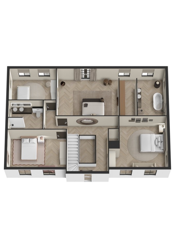 De verdieping beschikt over 4 volwaardige slaapkamers en een separate badkamer.