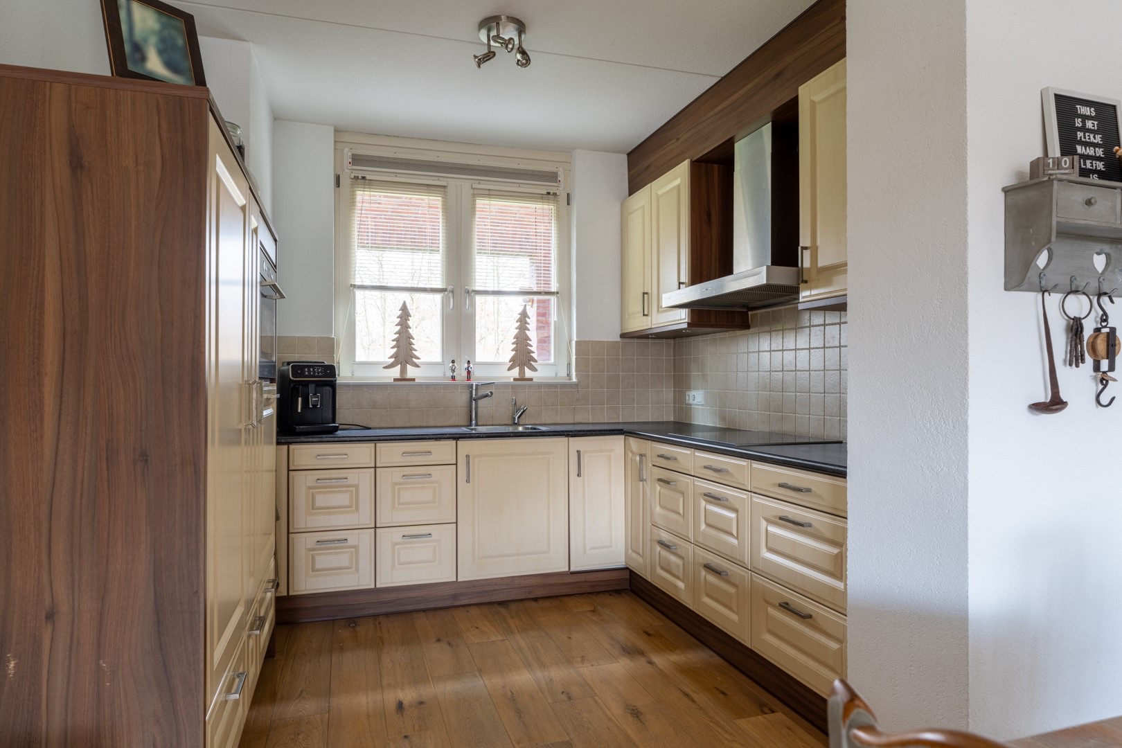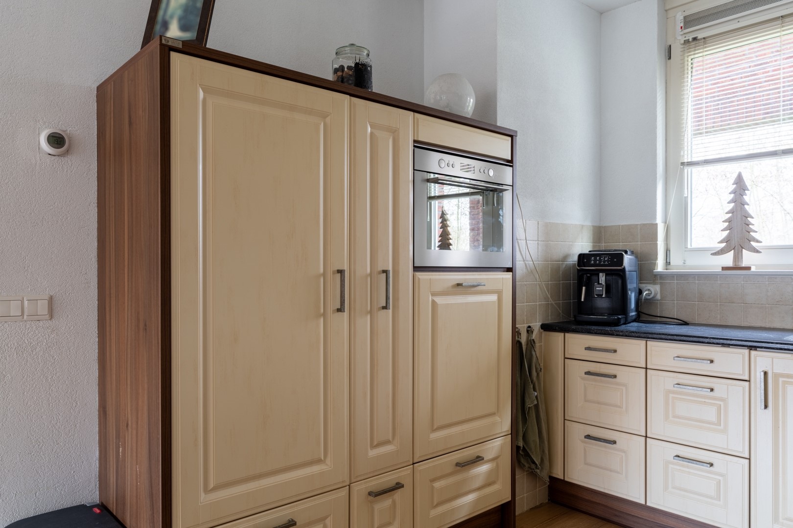Aan de voorzijde ligt de moderne keuken. Deze is compleet uitgerust met o.a. een keramische kookplaat, afzuigkap, combimagnetron, vaatwasser en koelkast. Dankzij de logische indeling en ruime opzet vormt dit een fijne plek om te koken en samen te zijn.