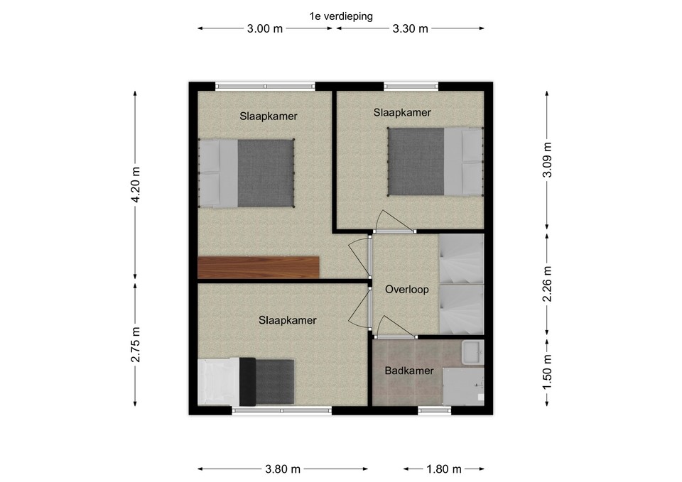 Vanaf de overloop heb je toegang tot drie ruime slaapkamers en de moderne badkamer.