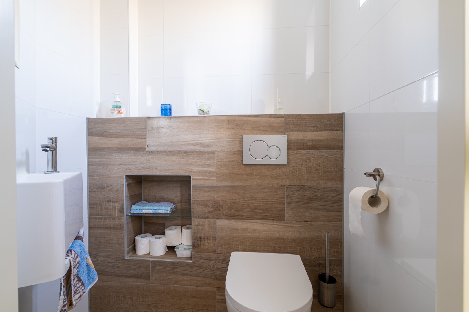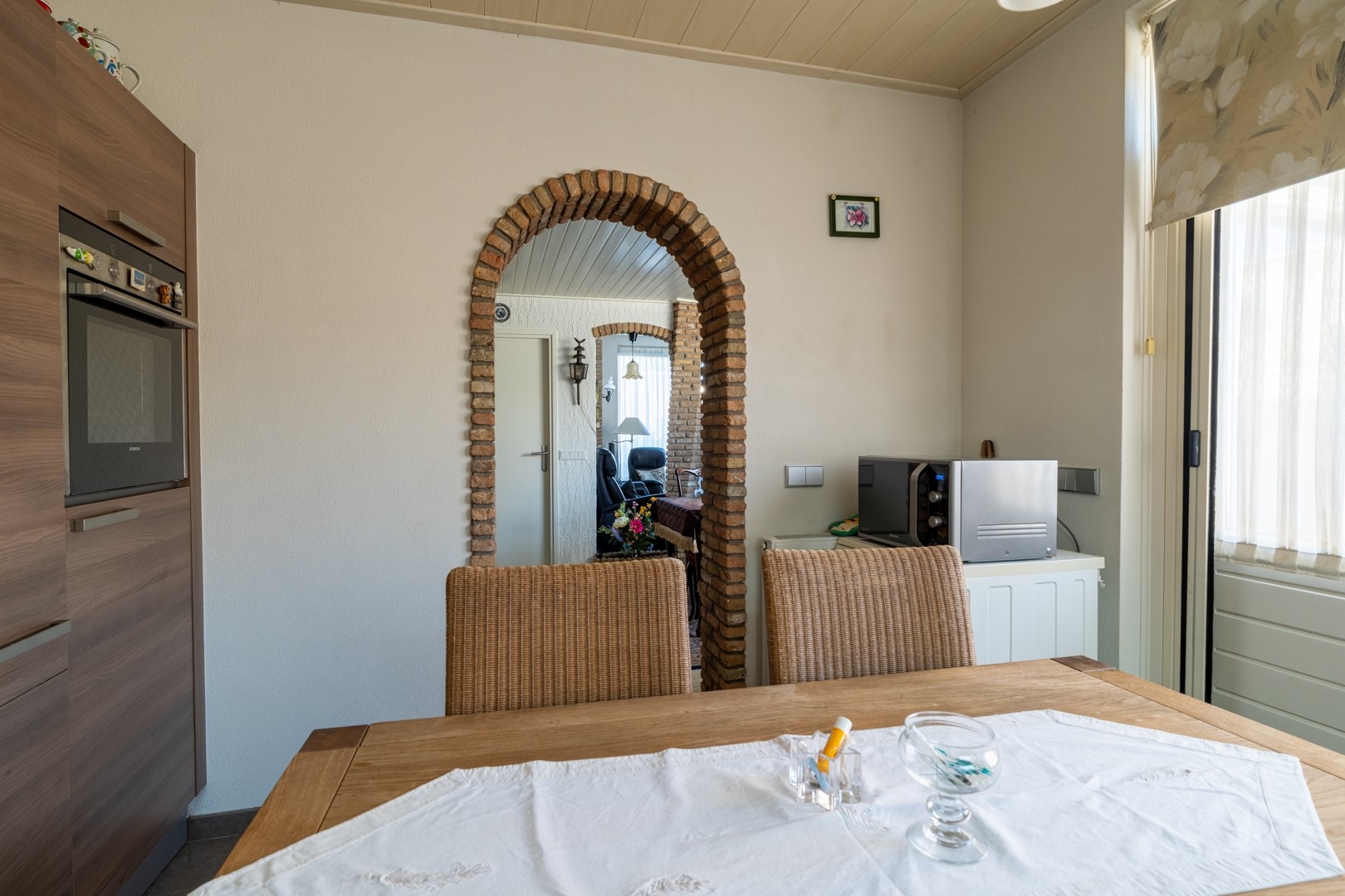 Via de hal, voorzien van meterkast en toiletruimte met hangcloset en fonteintje, kom je in de lichte en ruime L-vormige woonkamer. Vanuit de woonkamer bereik je de moderne keuken en bijkeuken. De keuken beschikt over L-keukenblok met combioven, koel-/vriescombinatie, inductiekookplaat, afzuigkap en een vaatwasser. Vanuit de keuken heb je toegang tot de serre, de achtertuin op het oosten én de garage.