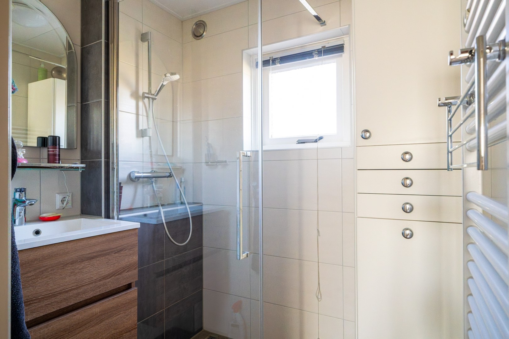 De badkamer is voorzien van een inloopdouche en wastafelmeubel, afgewerkt met inbouwspots en mechanische ventilatie.